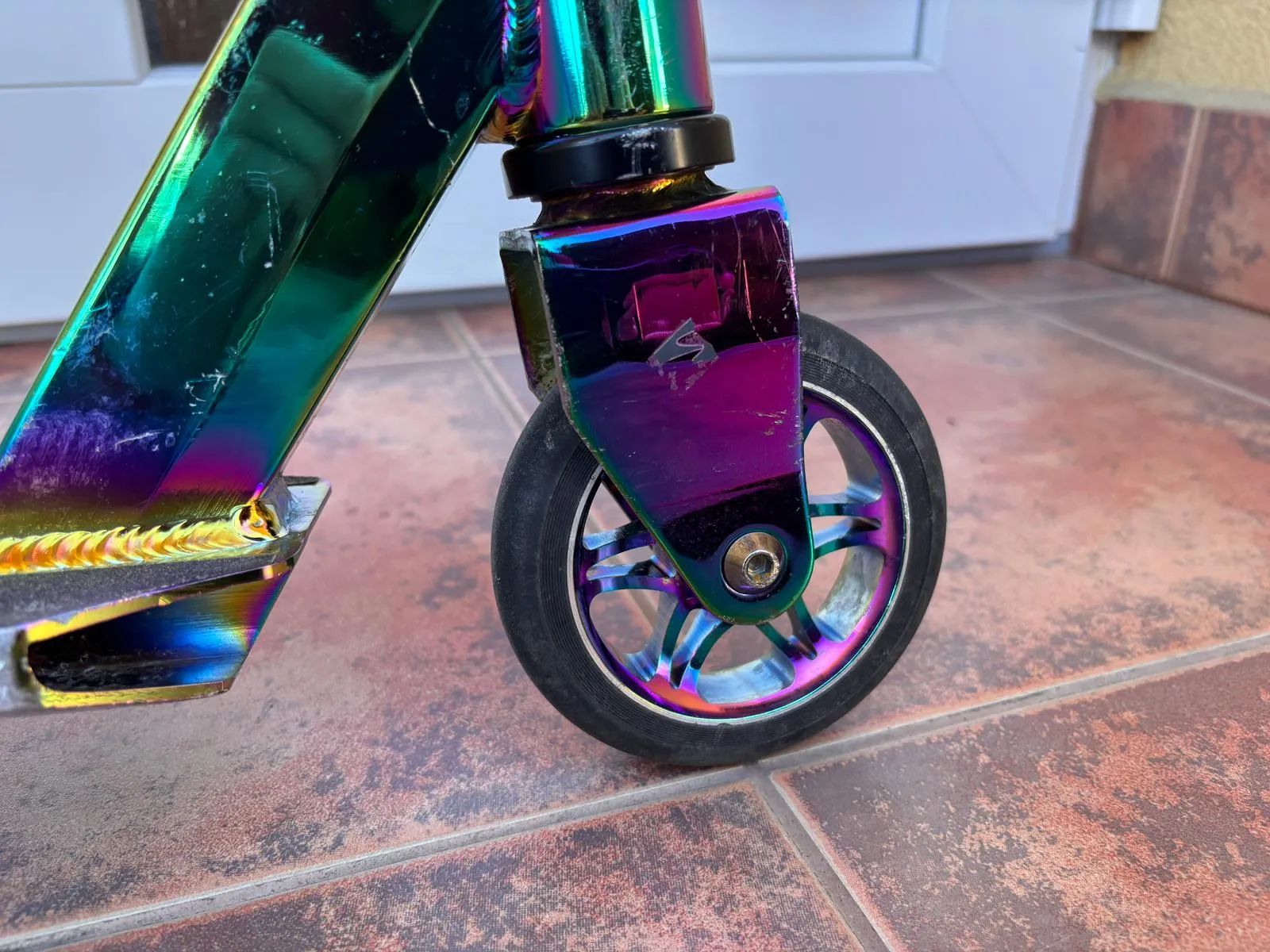 vyztužená hliníková deska ze slitiny 6061 velikost stupátka: 34,5 x 11 cm grip tape s grafikou na nášlapu pevná řídítka z obohacené oceli CR-MO 4130 rozměr řidítek: 540 mm (š) x 600 mm (v) výška řídítek: 86 cm výška nášlapu od země: 6,5 cm výška rámu od země: 5 cm měkčené gripy z trvanlivého materiálu - styl ODI ocelová vidlice 4-bodová objímka hlavové složení s technologií HIC kolečka 110 mm x 24 mm, 88A, PU high rebound, s hliníkovými jádry ložiska ABEC 9 výkonná brzda na zadním kolečku CNC otvor pro jedinečný design hmotnost: 3,9 kg doporučený věk: 8+ Max. nosnost: 100 kg