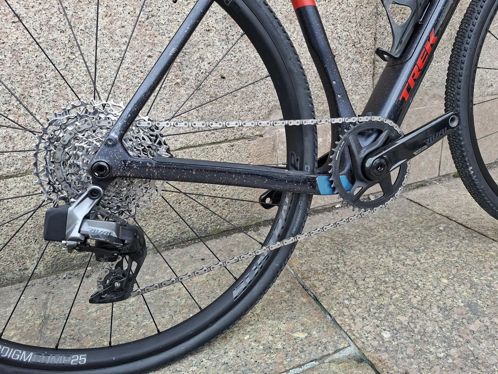 Kolo je osazeno sadou SRAM Rival AXS – elektronické řazení vyšší střední třídy, vhodné i pro sportovní jízdu