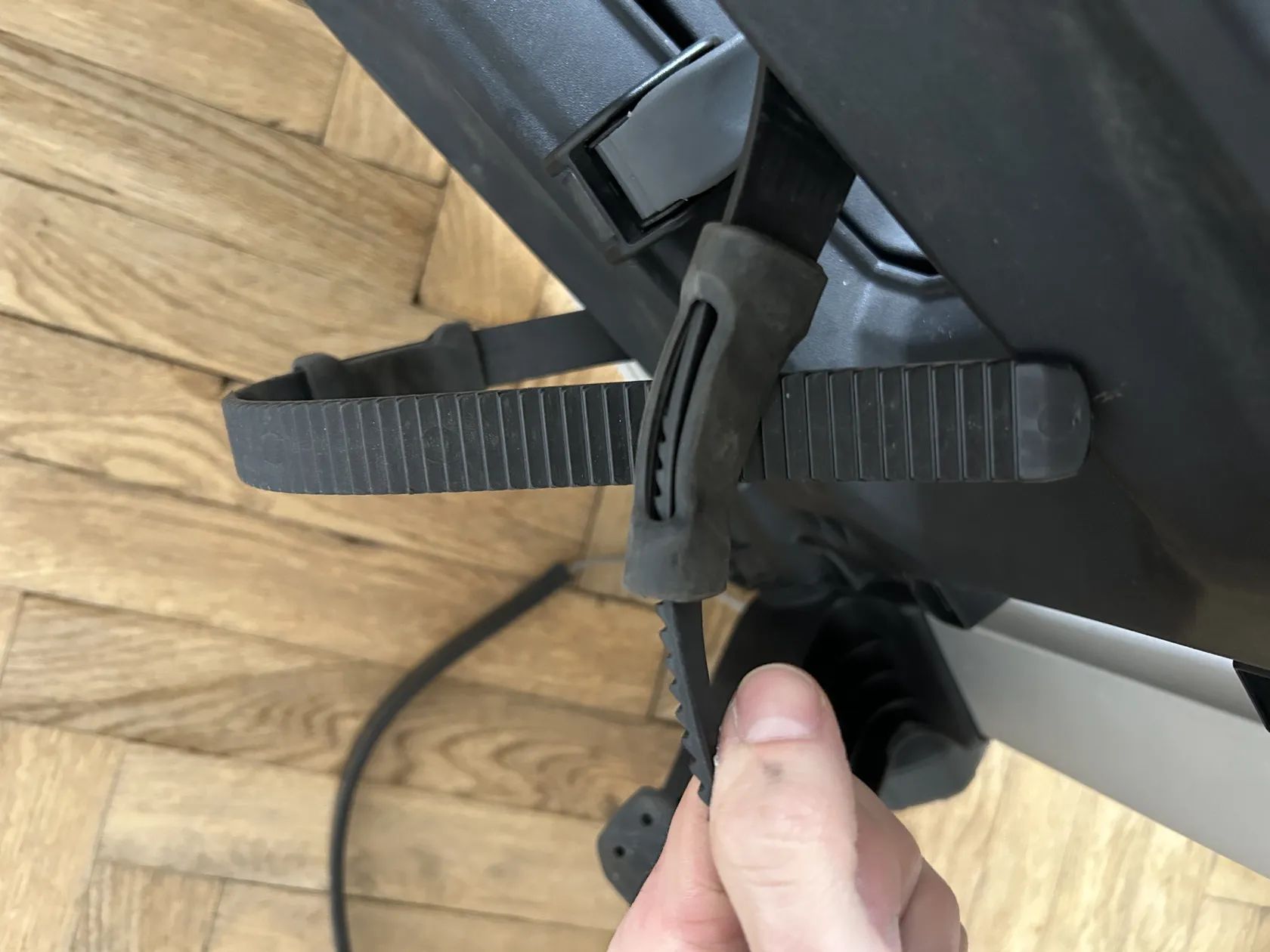 Má nějaké kosmetické poškození (viz foto) a chybí mu jedna gumička na přezce na uchycení kol (dá se dokoupit). Nemá vliv na funkci.