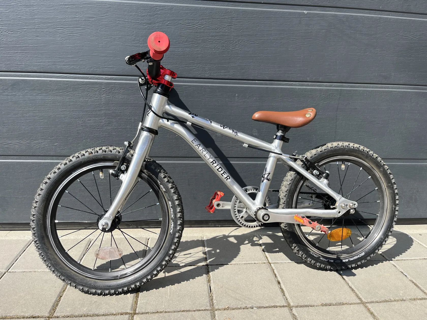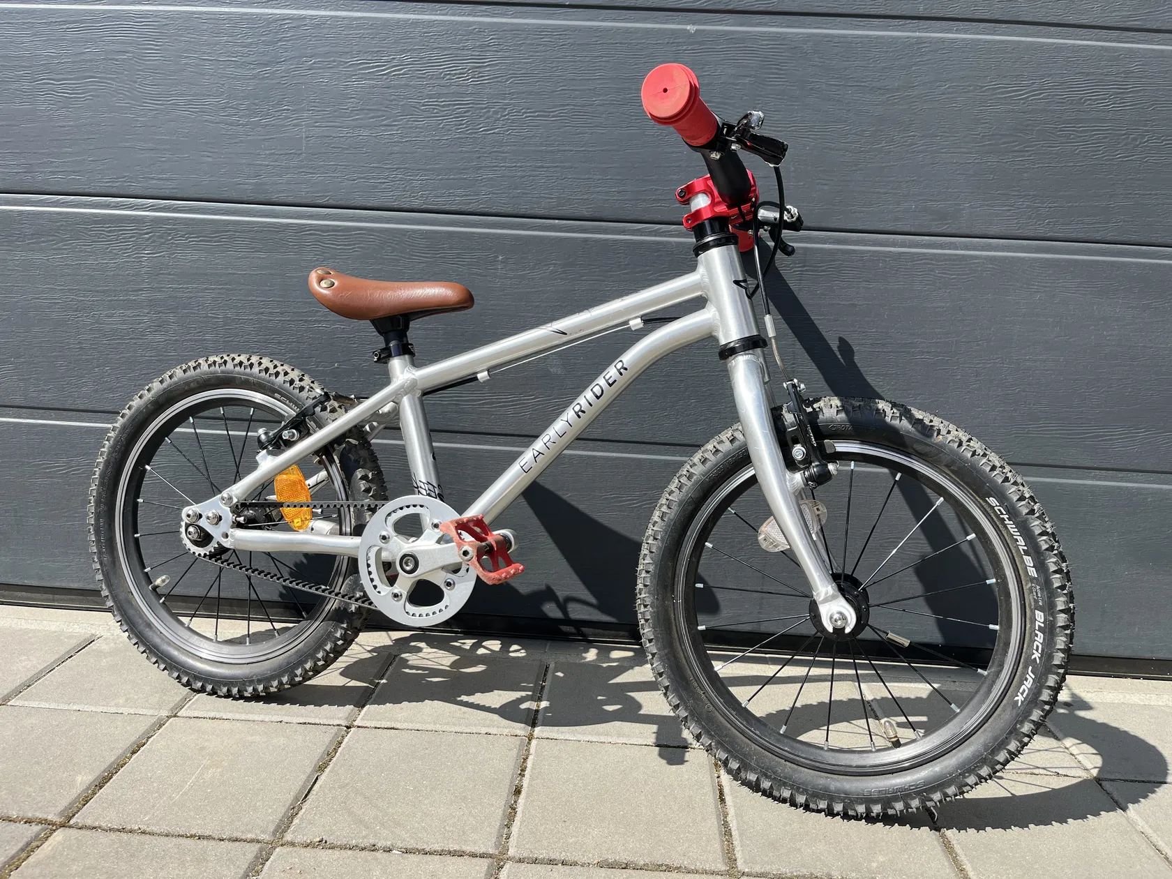 Prodám kvalitní dětské kolo 16" Early Rider Belter s řemenovým pohonem. Kolo je ve velmi pěkném stavu jak vizuálně, tak technicky. Měsíc staré více drapákové pneumatiky. Kratší červený představec, lepší pedály, červené gripy. Původní pedály, předstvec, gripy, pneu v ceně kola. Lehký hliníkový rám, nízká hmotnost, dobrá geometrie dělají kolo dobře ovladatelné i pro začínající jezdce.