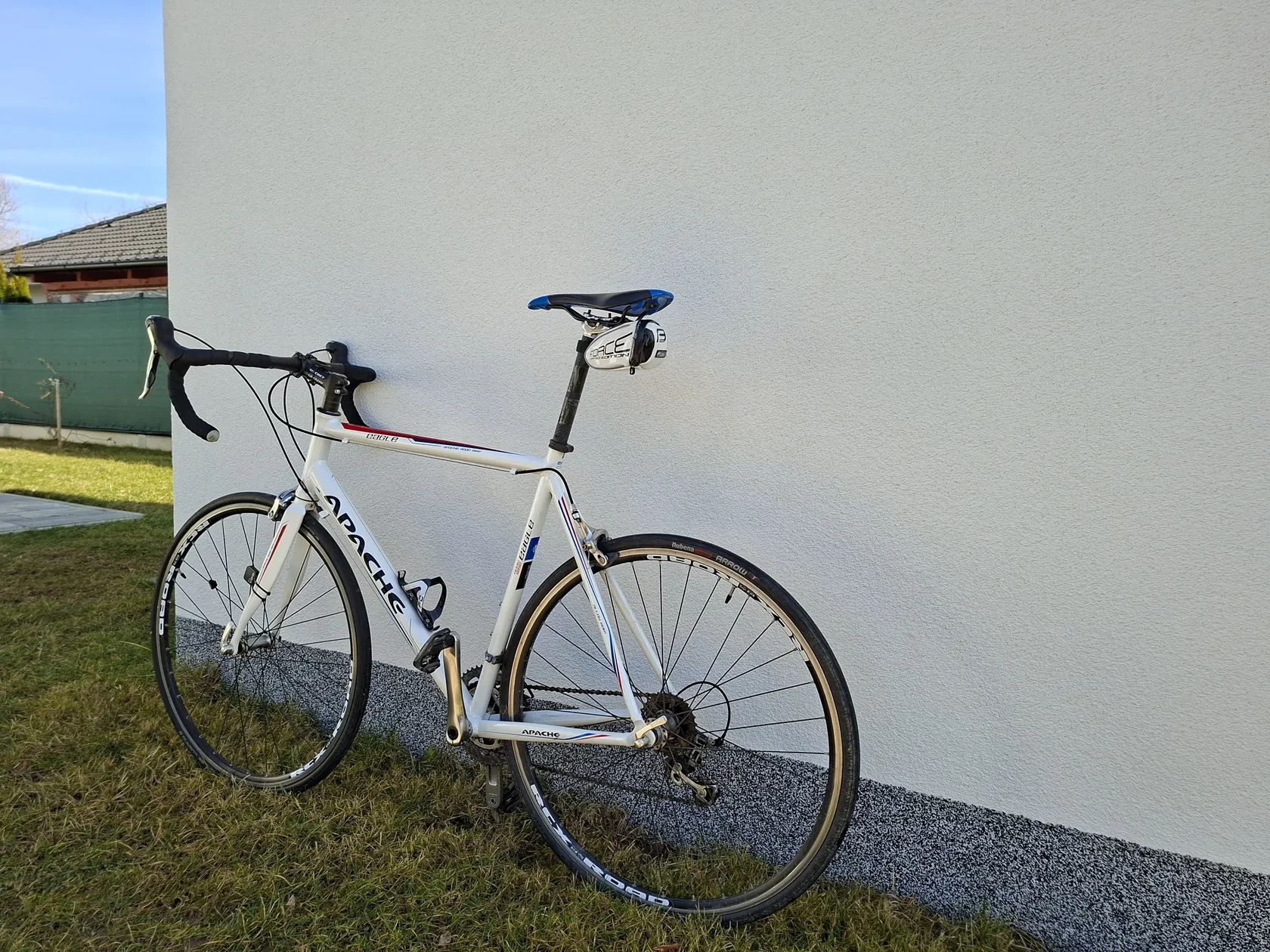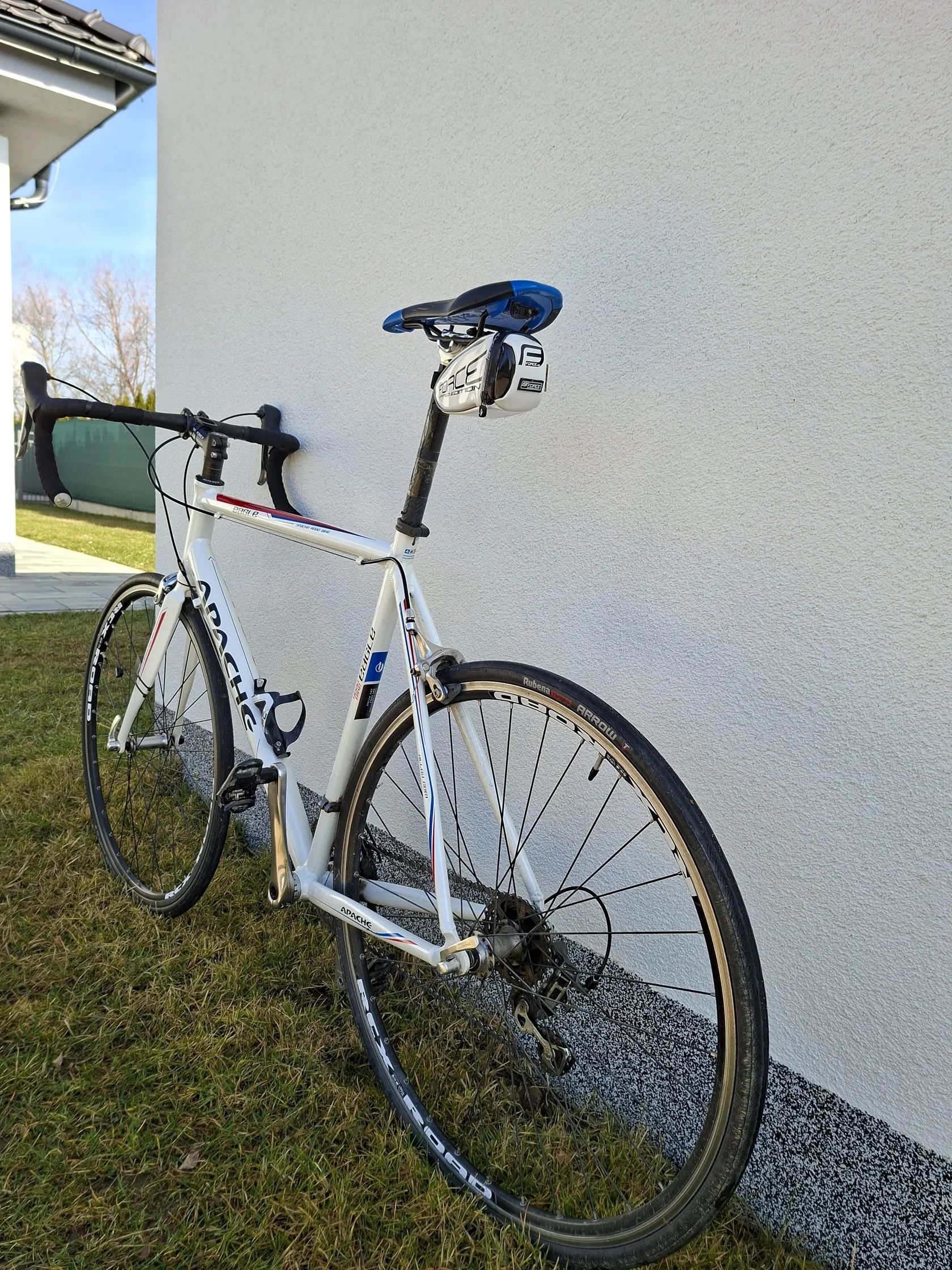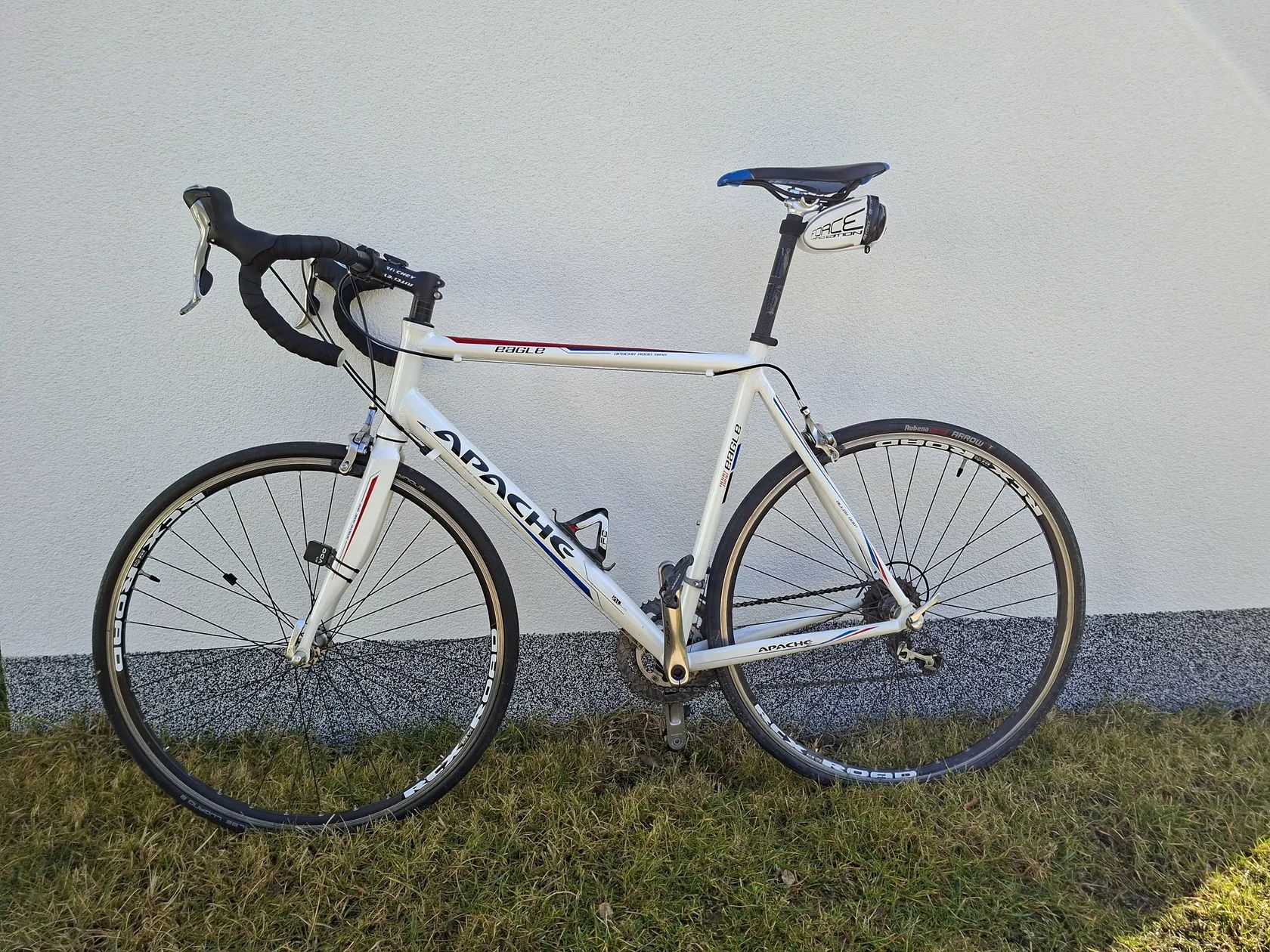 Prodám silniční kolo Apache Eagle, Al rám, karbonová vidlice, řazení Shimano Tiagra 2 x 10, pláště 28 mm, brzdy silniční ráfkové, ráfky RCX Road, představec+řídítka Ritchey, sedlo Fizik, pedály Look keo, bezdratový cyklopočítač VDO, brašna pod sedlem. Velikost XL 180-195. Kolo v dobrém stavu.