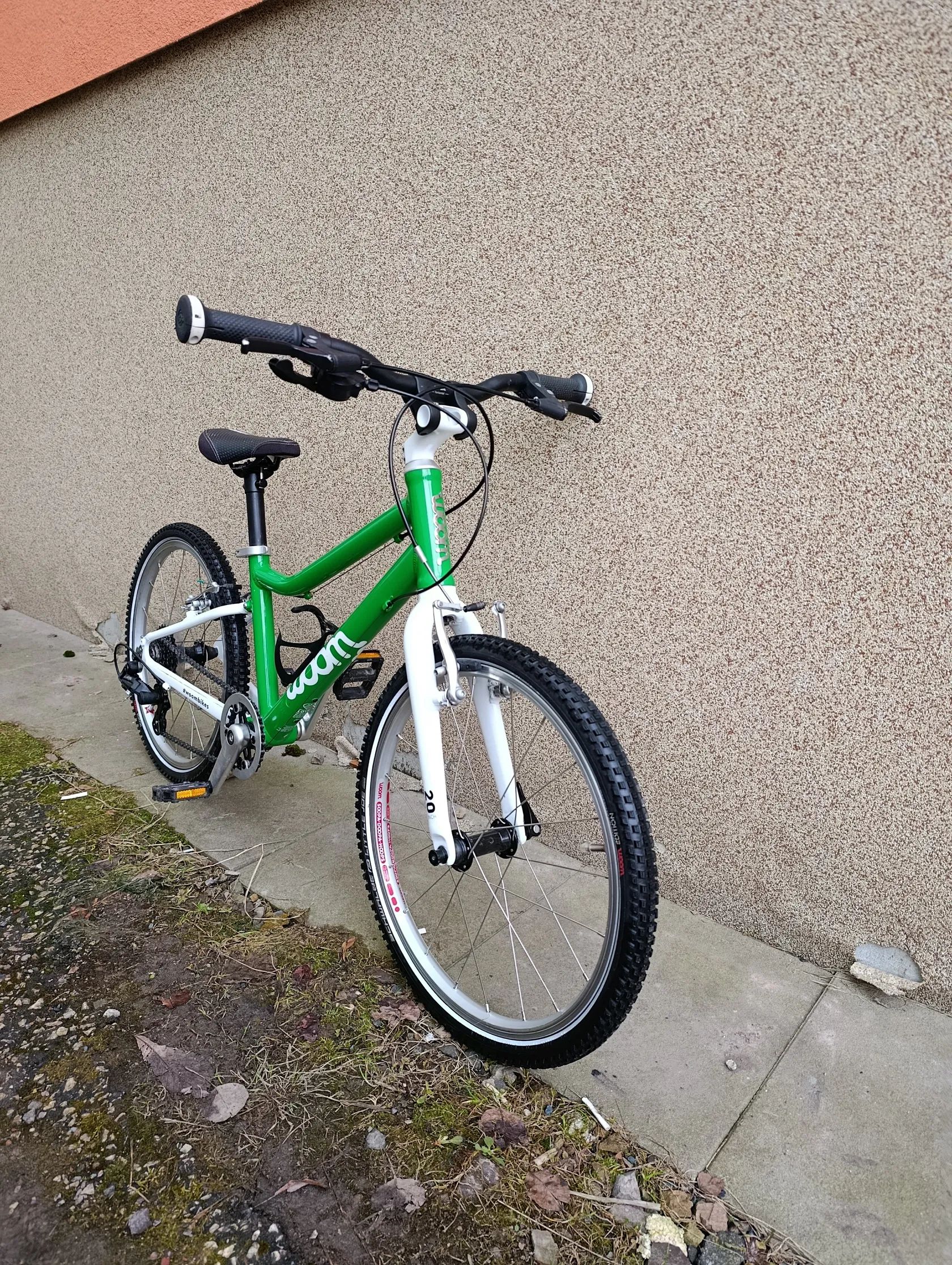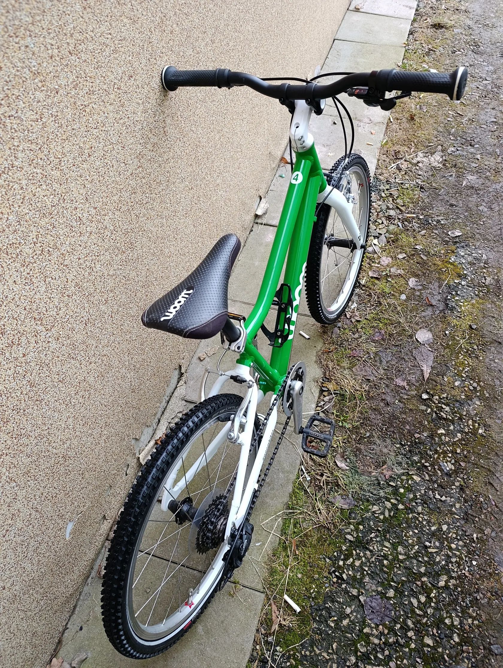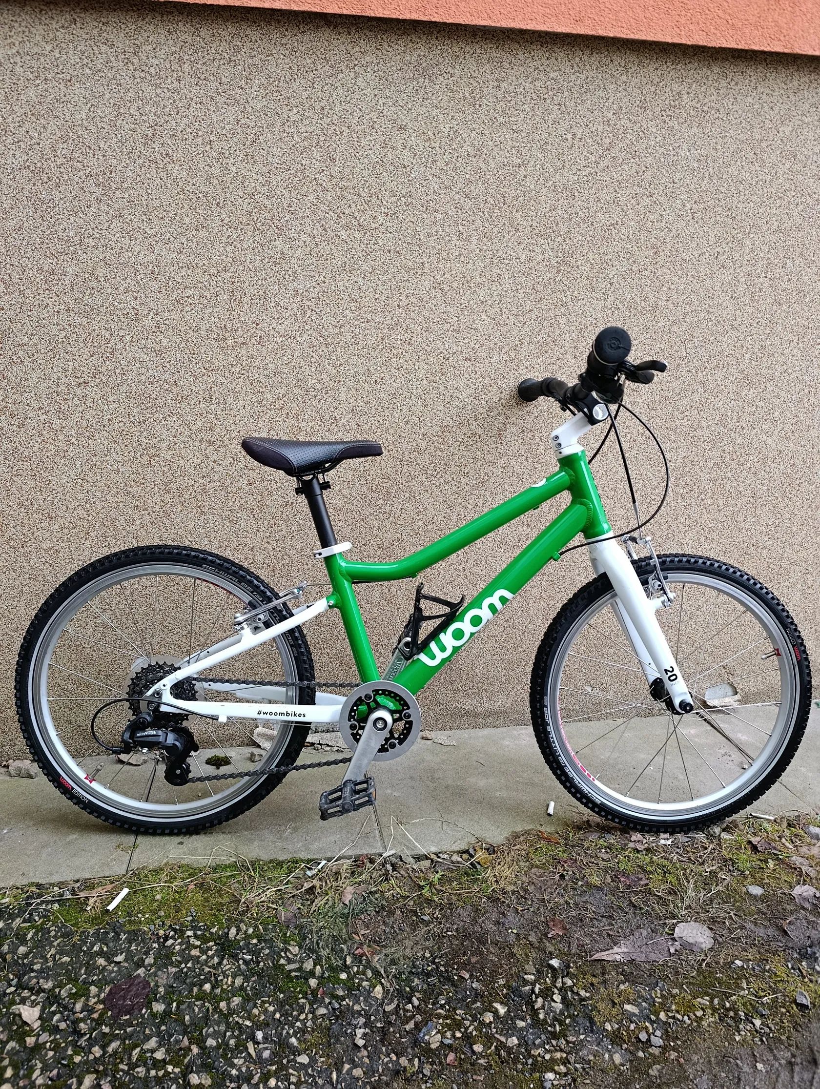 Zbytek komponentů je dle popisu původní z výroby (typické pro Woom: dětská řídítka, úzké gripy, lehké kliky, přizpůsobený převod)