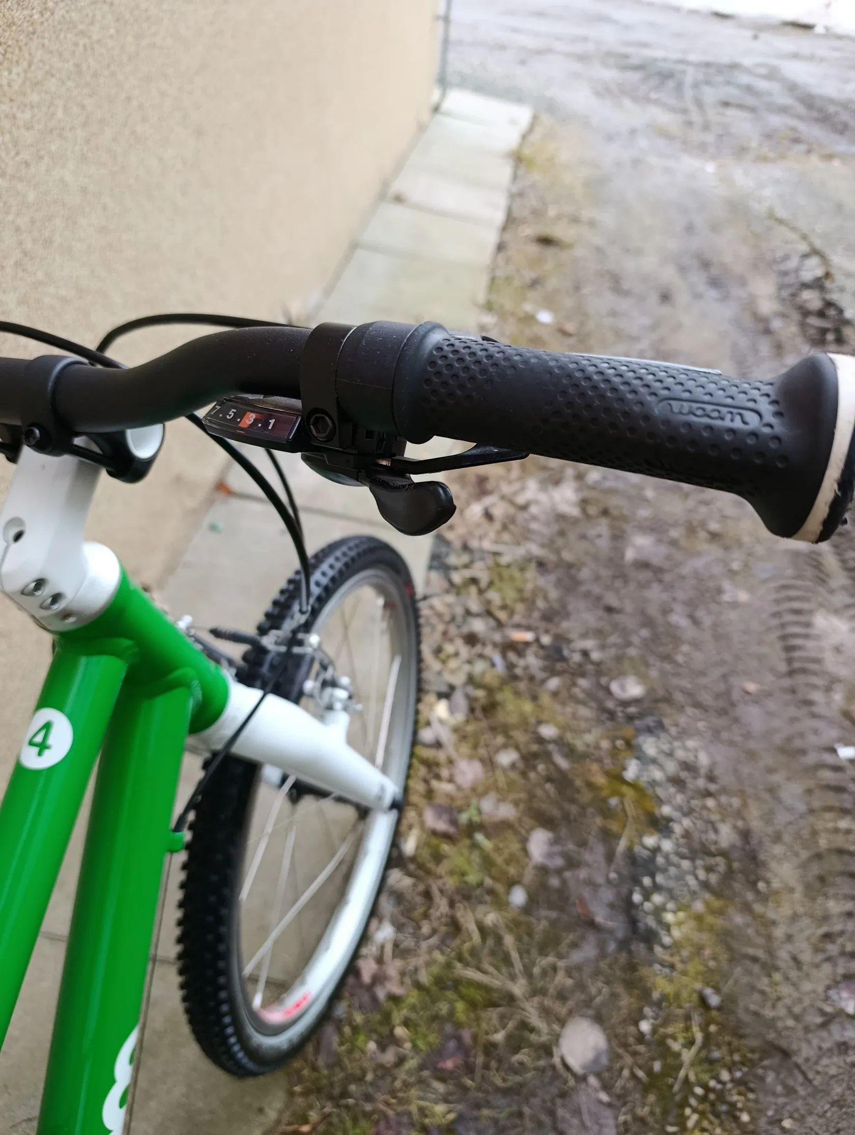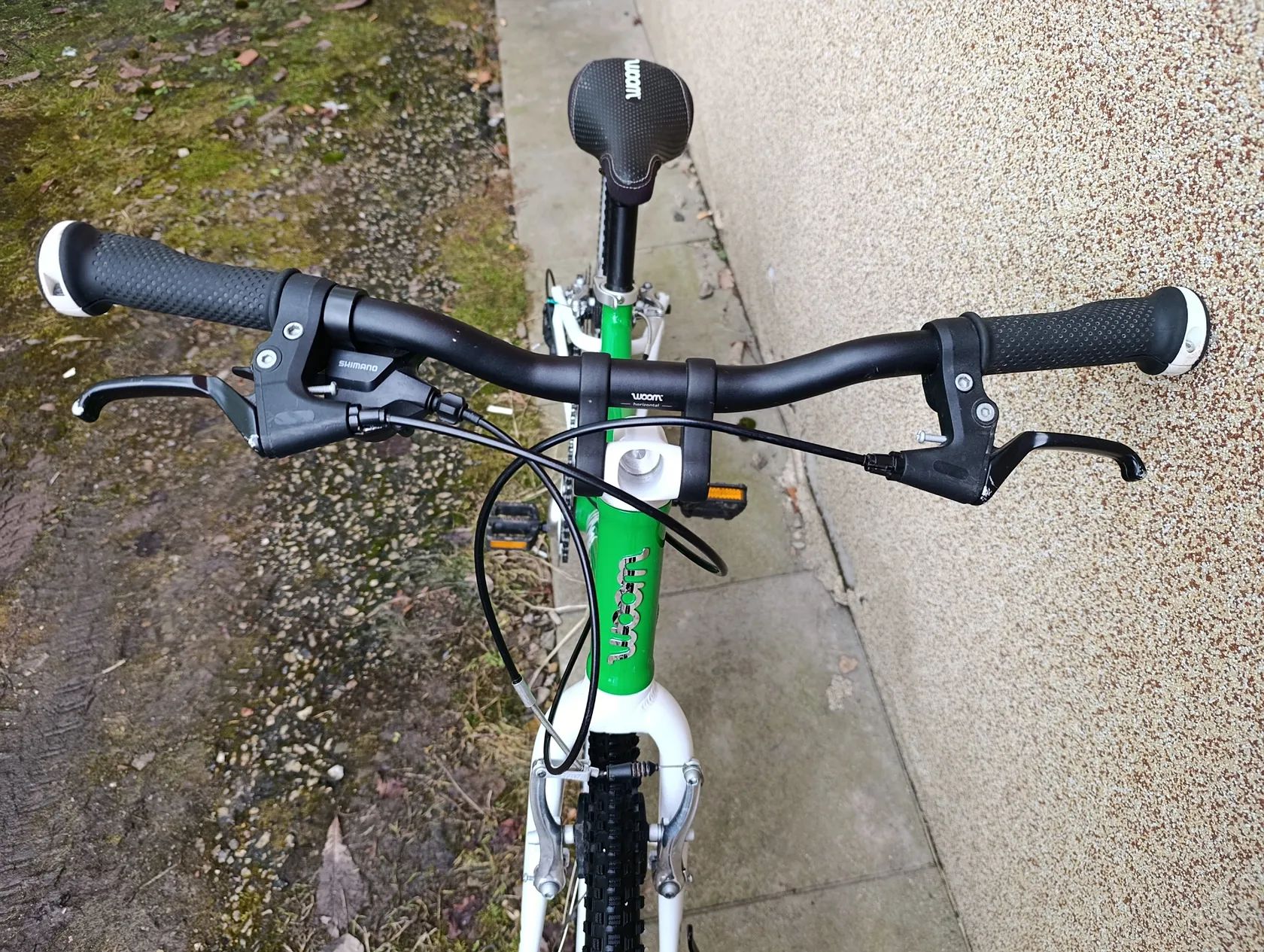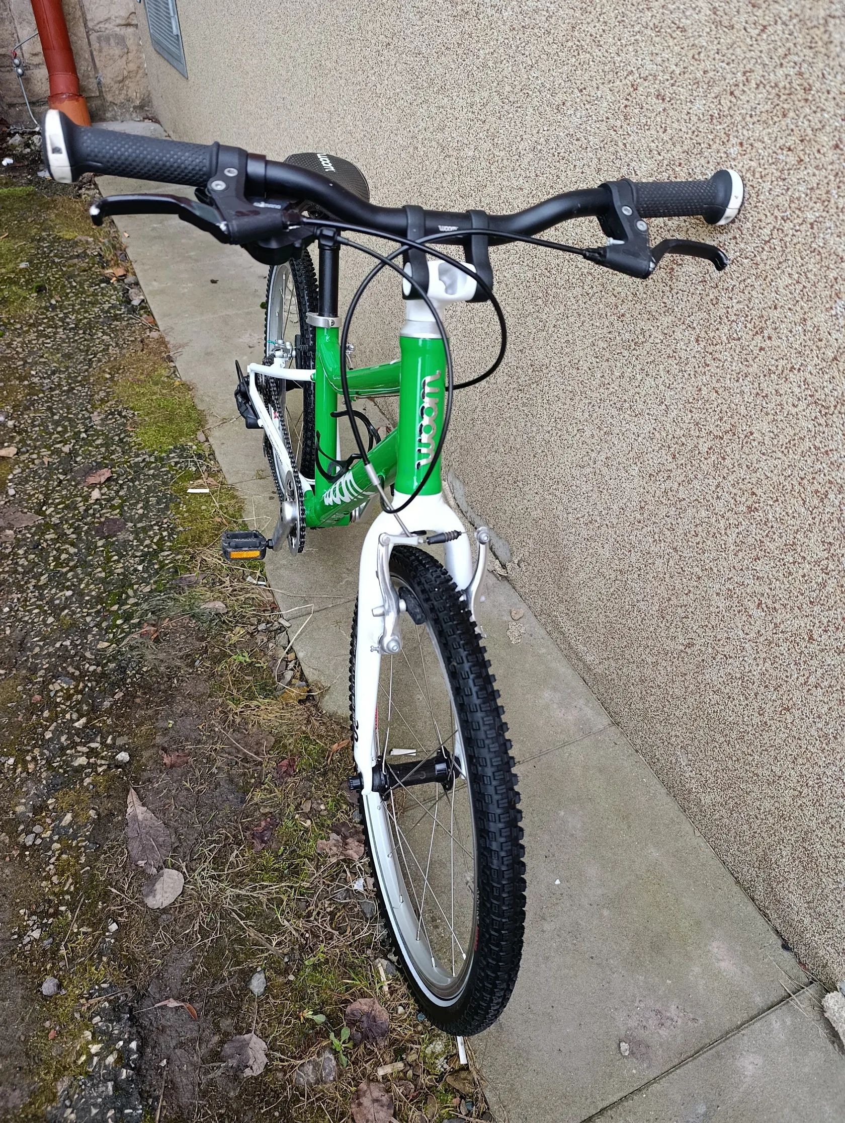 Zbytek komponentů je dle popisu původní z výroby (typické pro Woom: dětská řídítka, úzké gripy, lehké kliky, přizpůsobený převod)