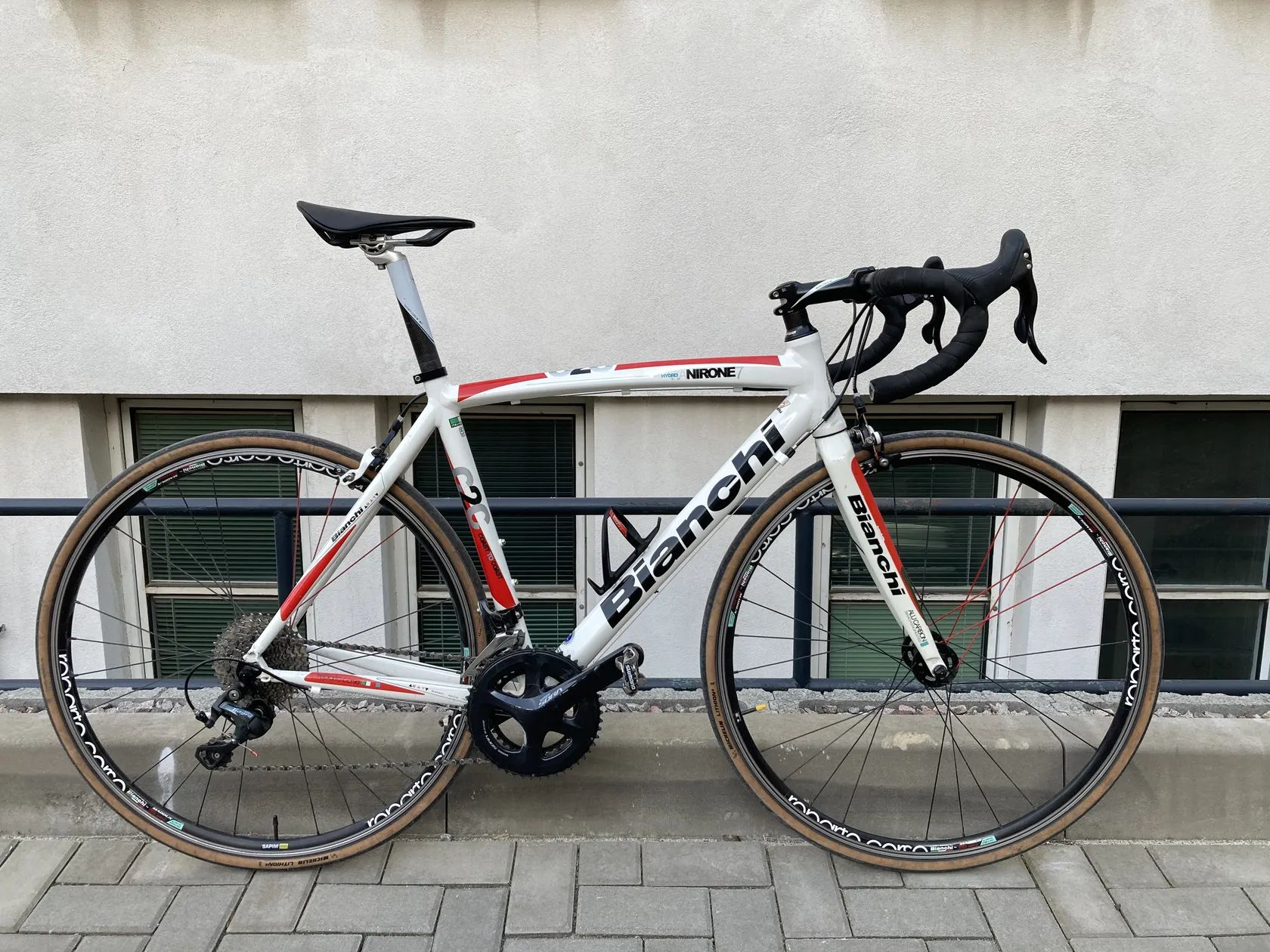 Prodám svou silničku Bianchi Via Nirone 7. Loučím se s ní s těžkým srdcem, ale už pro ni bohužel nemám takové využití. Nejde o běžnou sériovku – tato bílo-červená kombinace v úpravě Reparto Corse je na českých silnicích unikát a působí mnohem elegantněji než klasická tyrkysová.