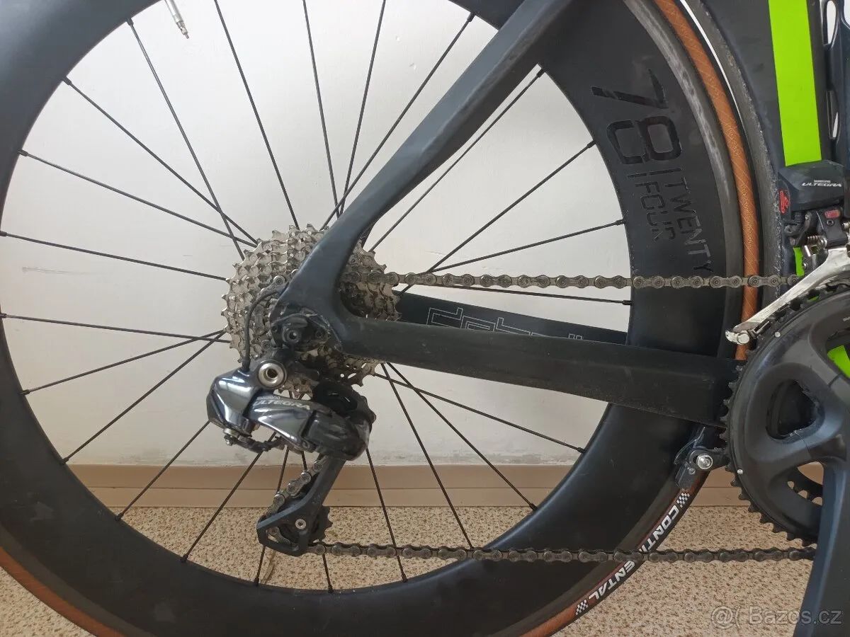 - Velikost "540"(podle výrobce pro postavu 178 - 190 cm (na fotce nastaveno při fittingu na mou velikost 185 cm) - Ultegra DI2 52/36 (elektrika, nabíječku samozřejmě přidám) - Kola Profile Design Black Label 78/58, kazeta 11-32 - Continetal Grand Prix obutí