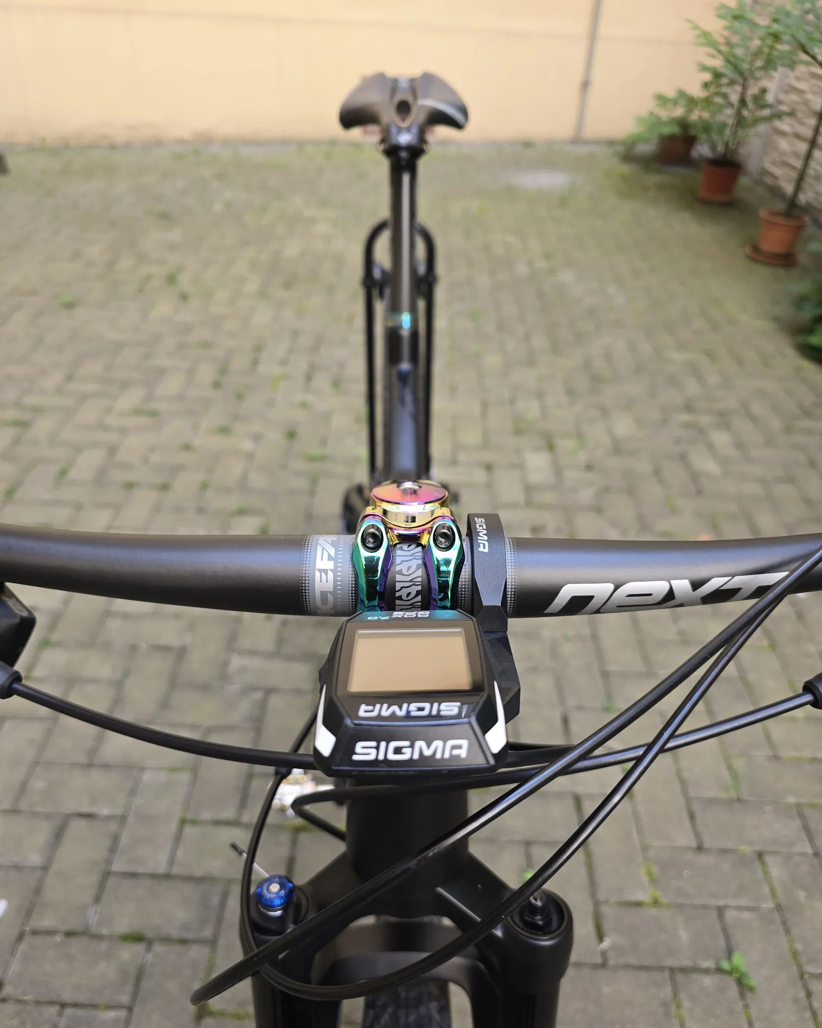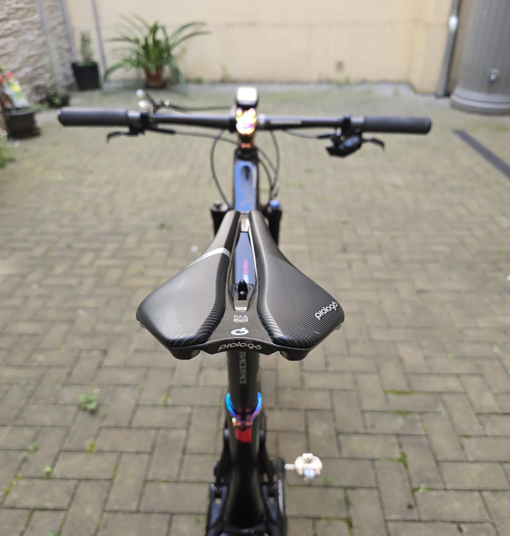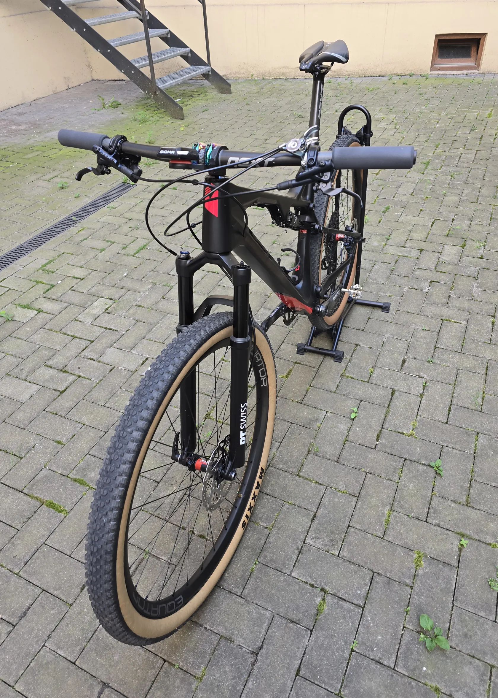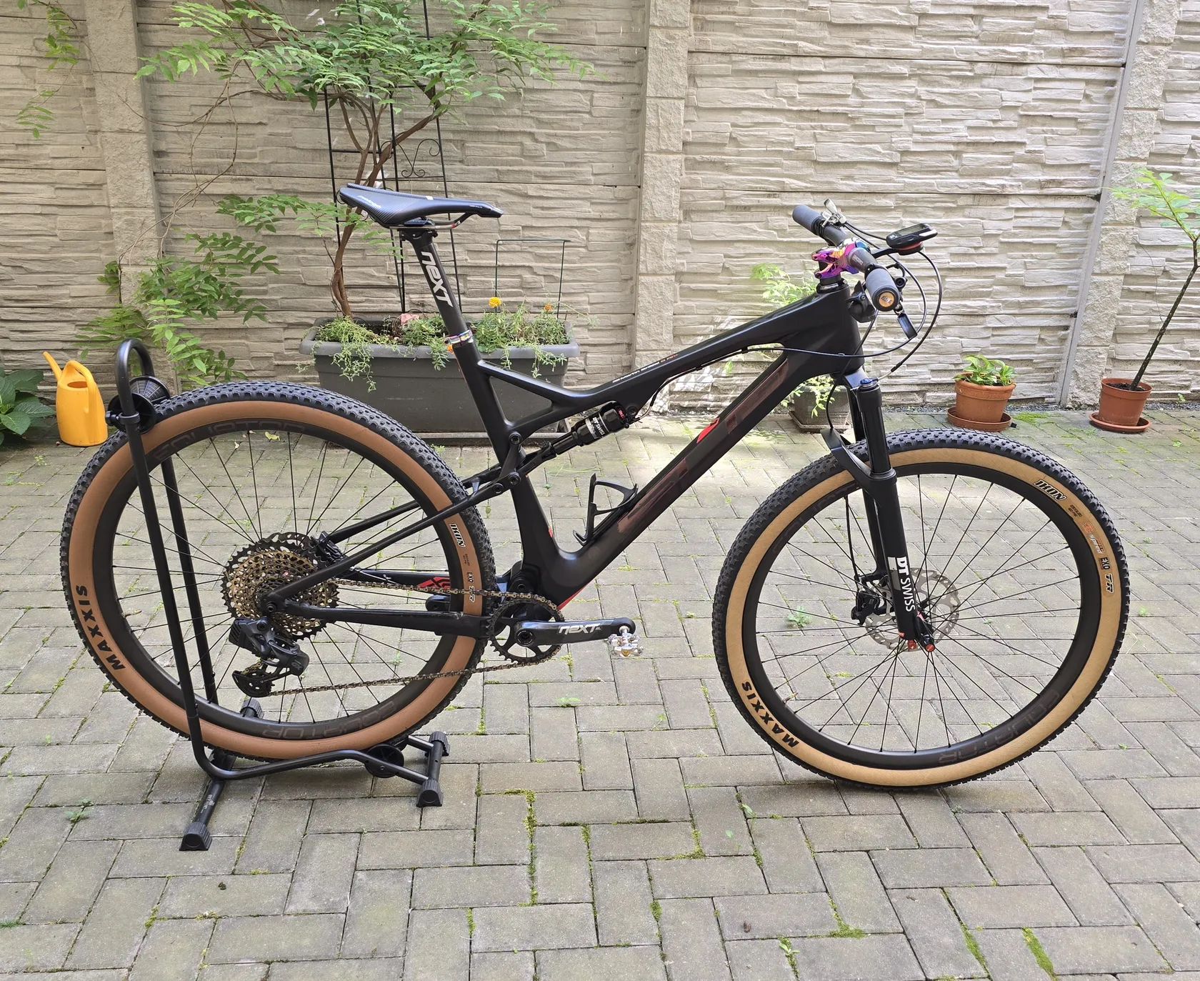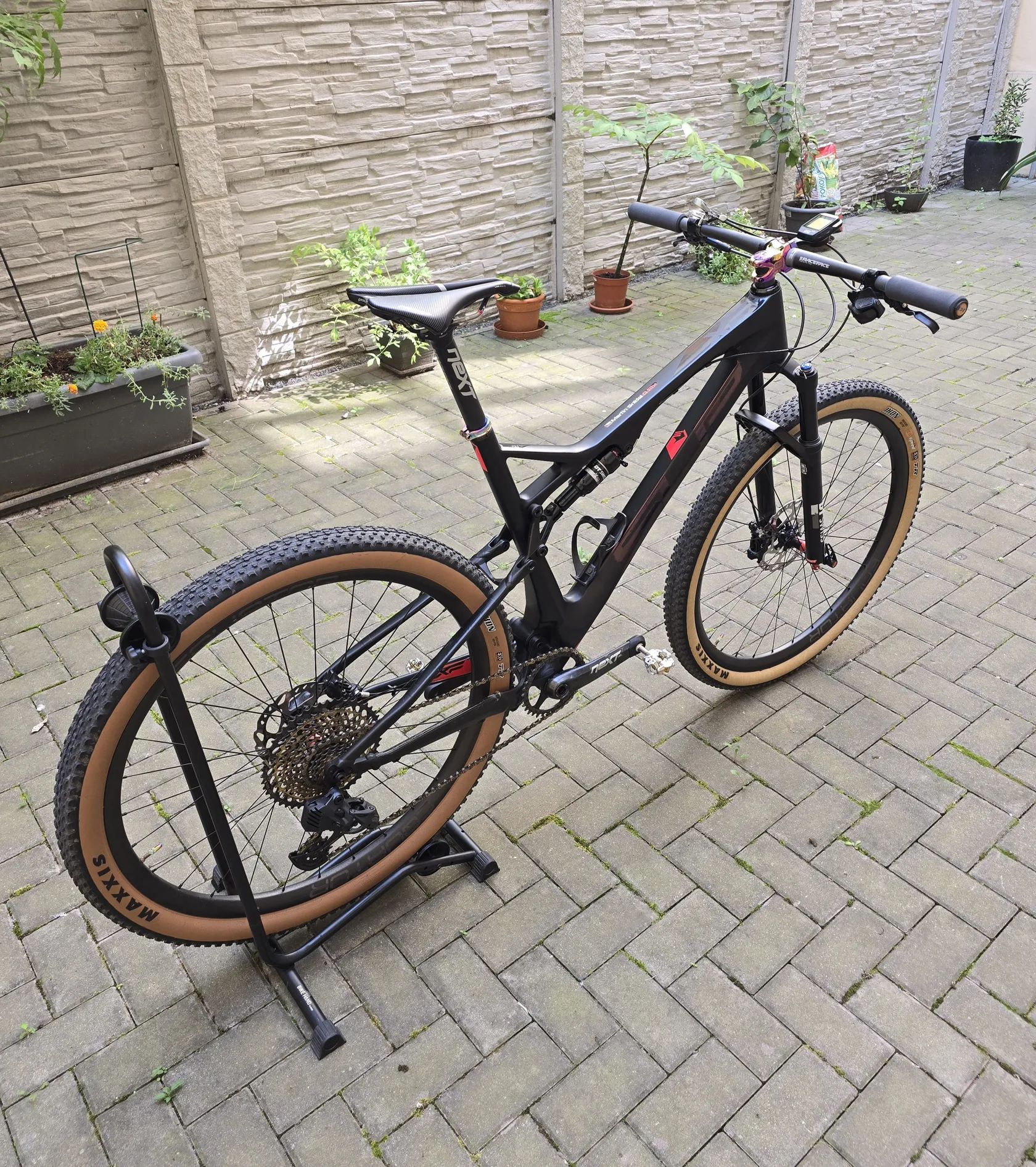 Rám Sup karbonový, zadní stavba kovová.Vidlice DT Swiss. Karbonová zapletená kola Equator s náboji DT Swiss 240. RaceFace Next sedlovka, řídítka a kliky, vše karbonové. Převodník RaceFace. Sedlo Prologo 143 Pas. Nášlapy Ritchey. Kazeta XX1 Gold. Řazení Sram GX AXS. Brzdy Shimano SLX.Tlumič DT Swiss X313. Doplňky v designu oilslick. Moje výška 187cm. Kolo je bez jakéhokoliv poškození.
