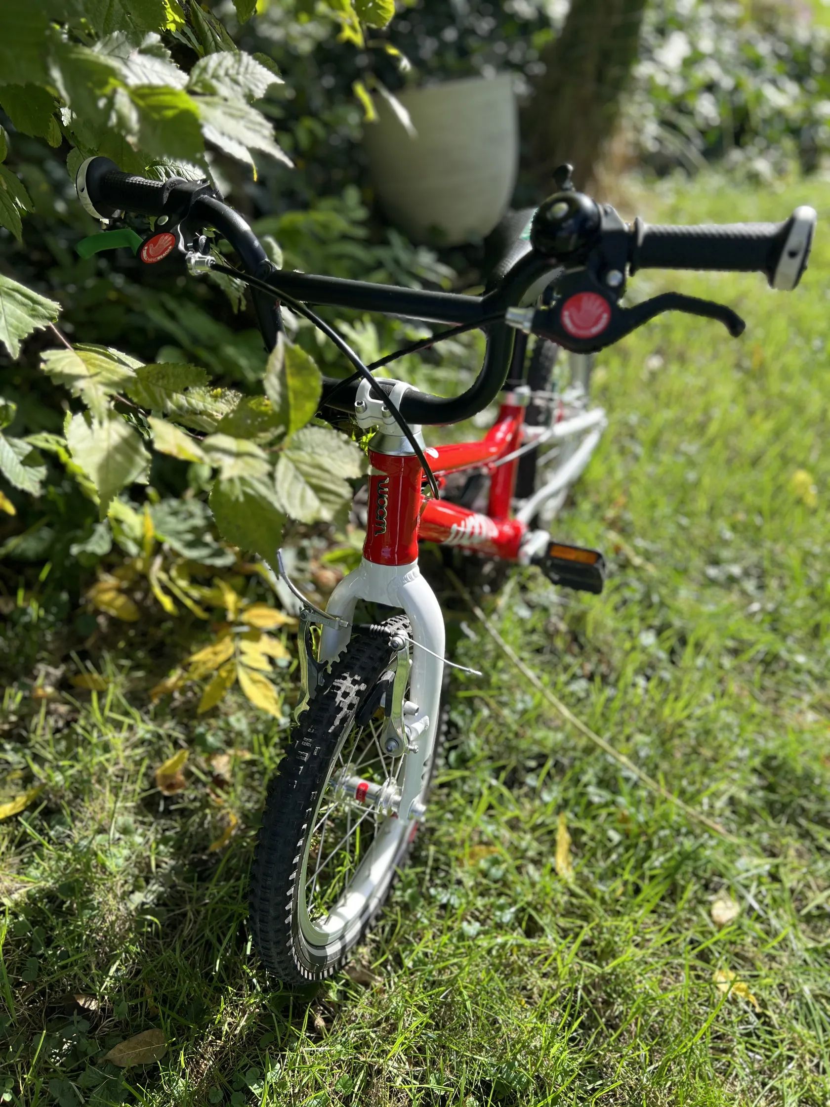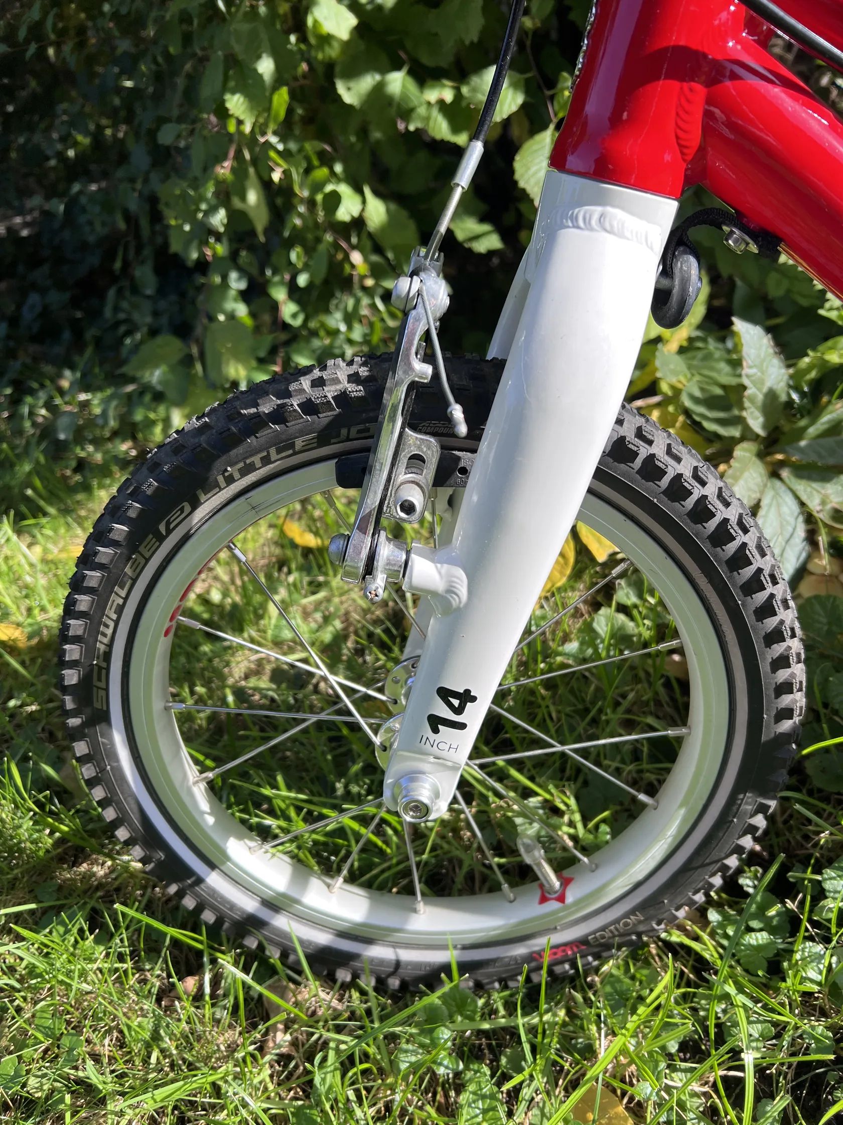Ultralehké (5kg) dětské kolo s nízkým nástupem, přední a zadní ráfková brzda s barevně odlišenými páčkami (ideální tedy pro první učení jízdy na kole), 14" kola, pro děti cca 3 až 4,5 let (95 - 110 cm). V perfektním stavu, zakoupeno 06/2024, tzn. stále v záruce.