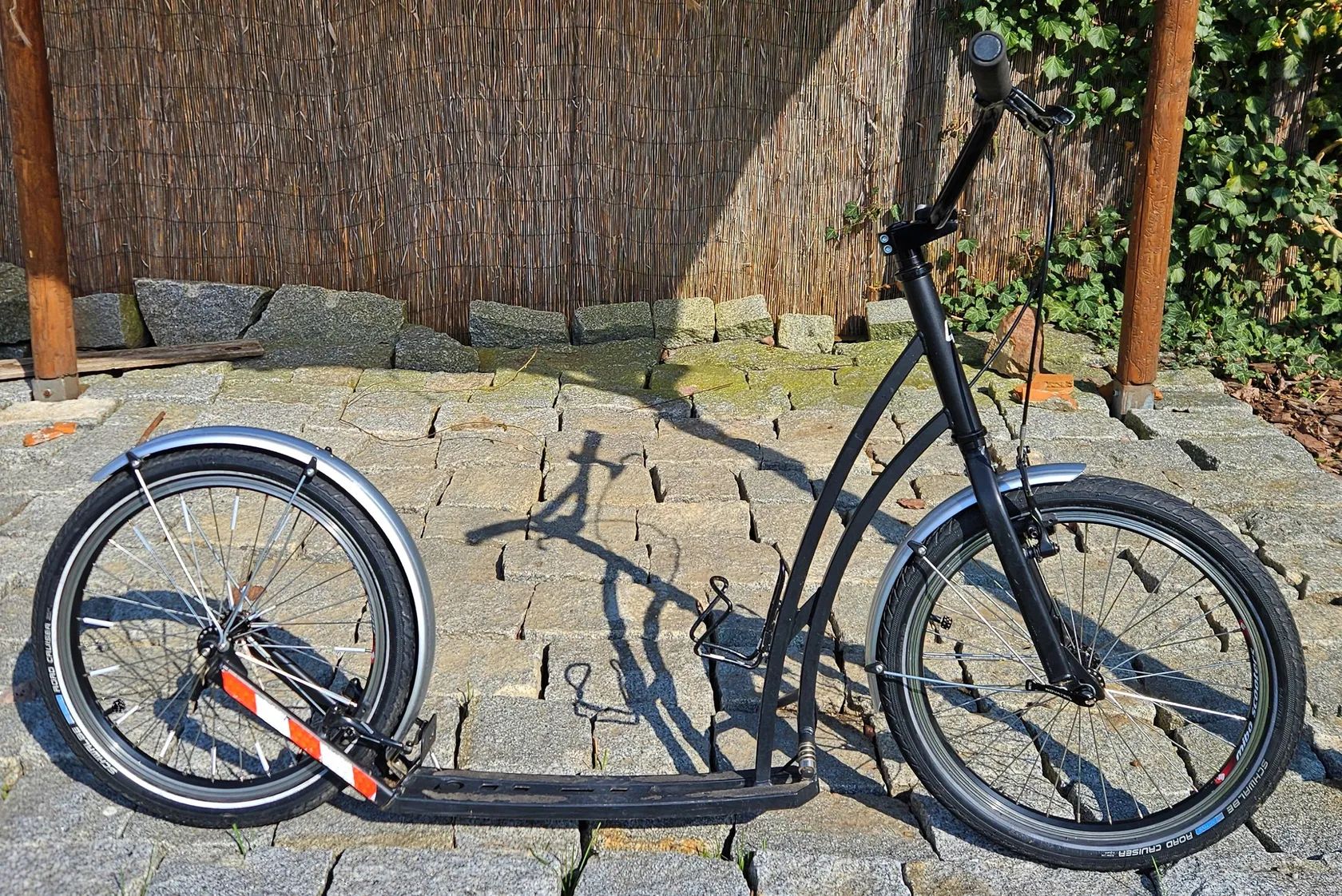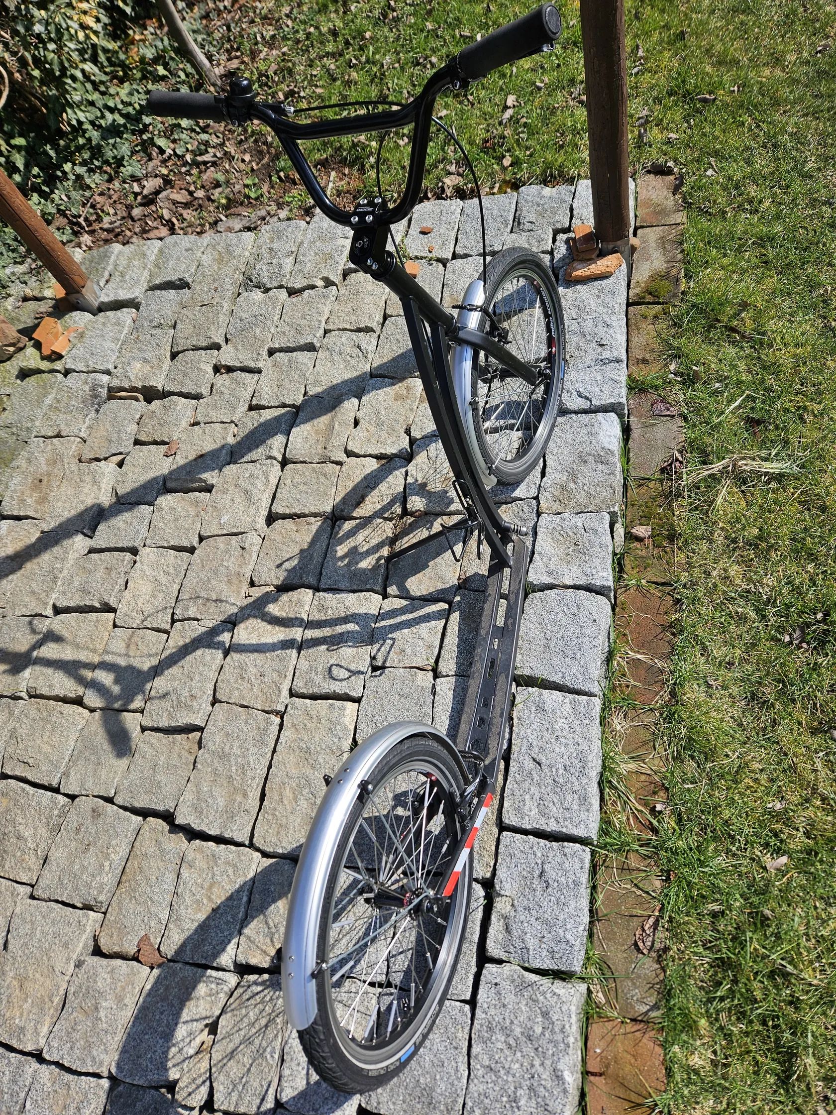 Prodám odolnou koloběžku Mibo Express s 20" koly. Univerzální koloběžka, výborná i pro použití dětské sedačky. Léty prověřená tuhá konstrukce. Ani malá ani velká, ani rychlá ani pomalá. Má pár škrábanců (viz foto), ale jinak dobrý technický stav, seřízená a připravená na sezónu. Má zabudovaný stojánek, pohodlné pneumatiky Schwalbe i do lehkého terénu, kola na špičkových nábojích Novatec a vysokou nosnost 150kg. Namontovány lehké, ale odolné plastové blatníky, zvonek a držák cyklolahve. Osobní odběr Praha nebo okres Beroun. Podvodníci s falešnými kurýry, ani nepište.