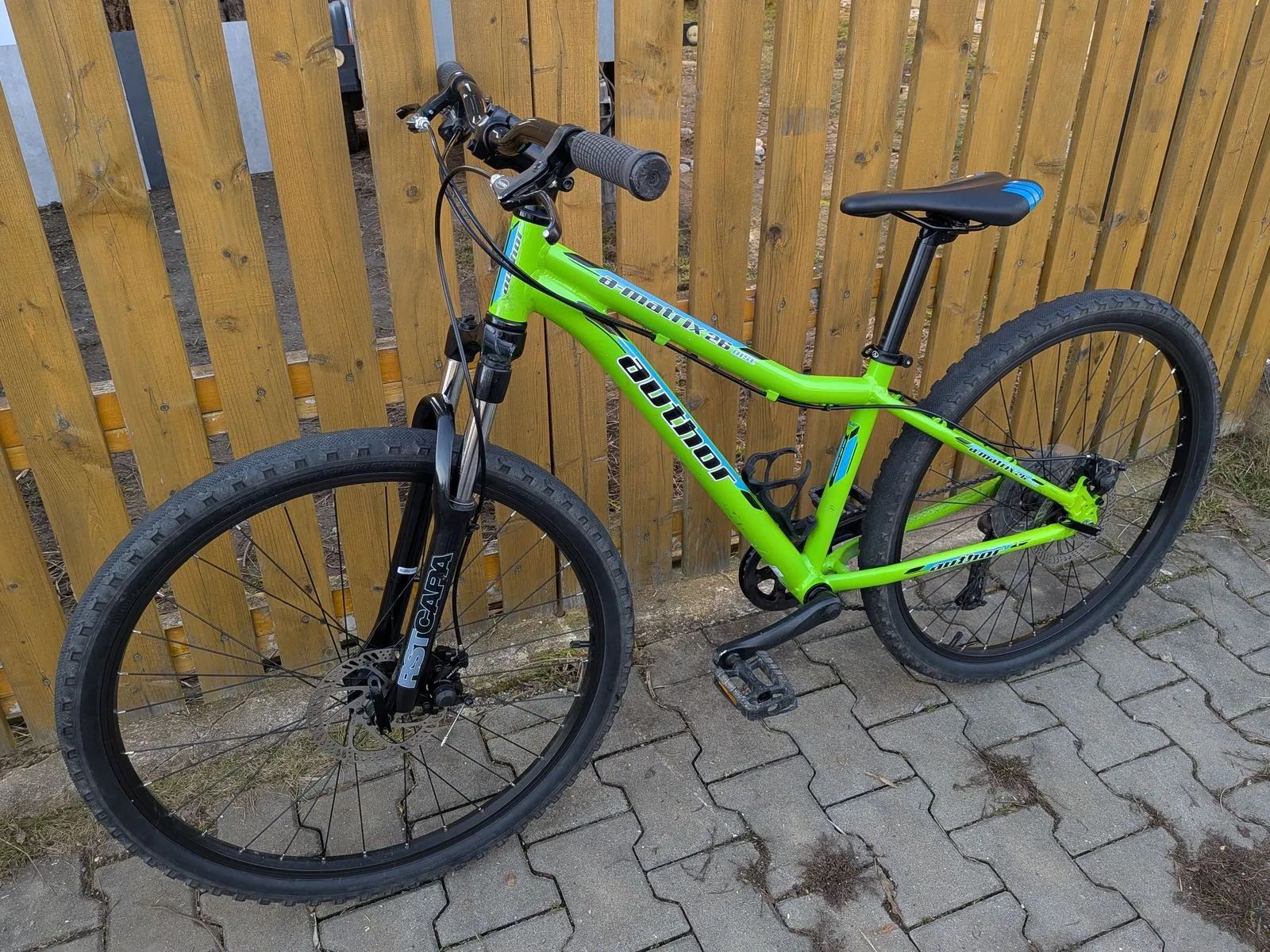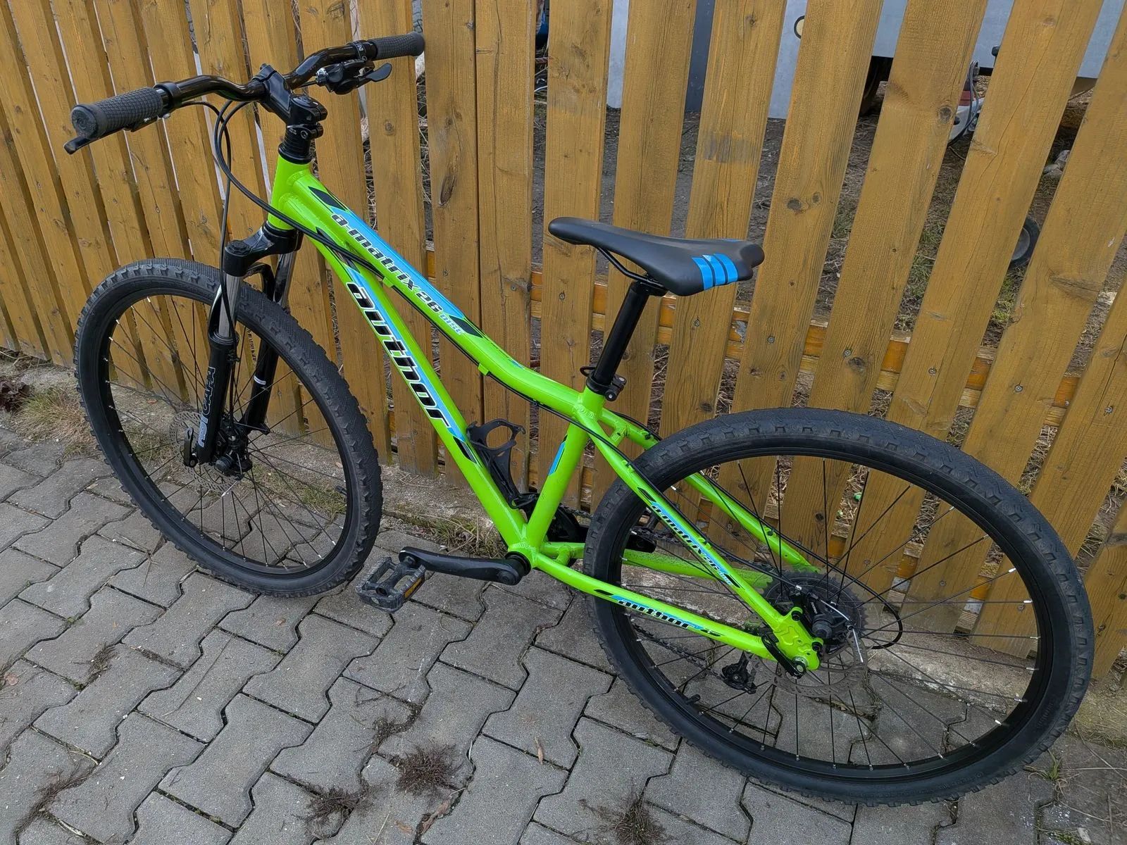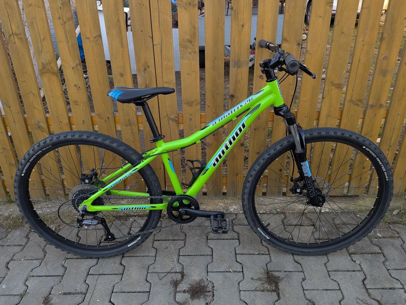 Dětské horské kolo Author A-Matrix D 26 - zhruba 130-155cm. Výborný stav, málo jeté, velice zachovalé. Kola 26", osazení Shimano Altus 1x9 rychlostí, odpružená vidlice RST, mechanické kotoučové brzdy Tektro, hmotnost 12,9 kg.