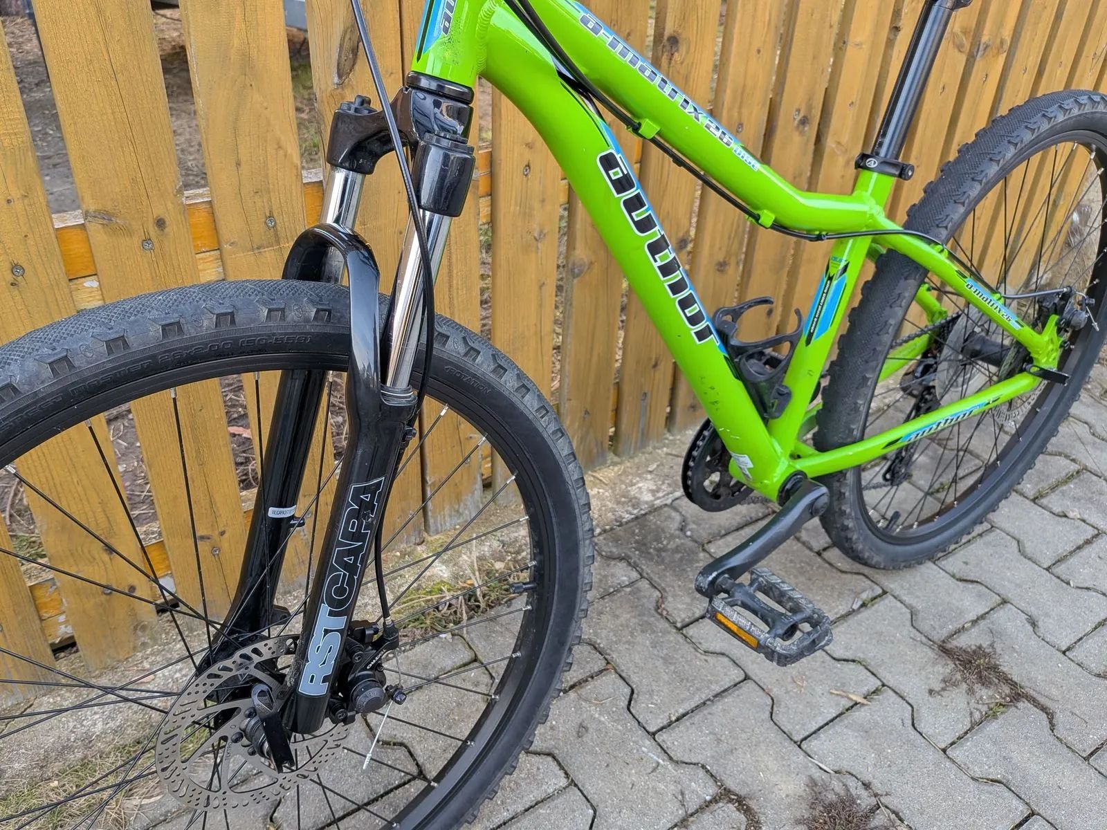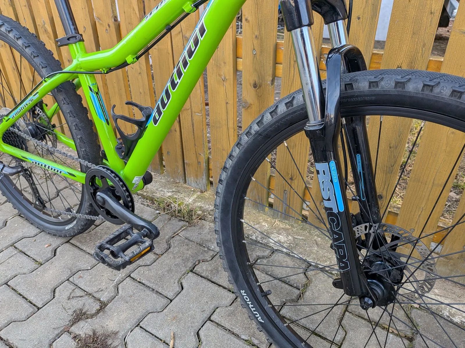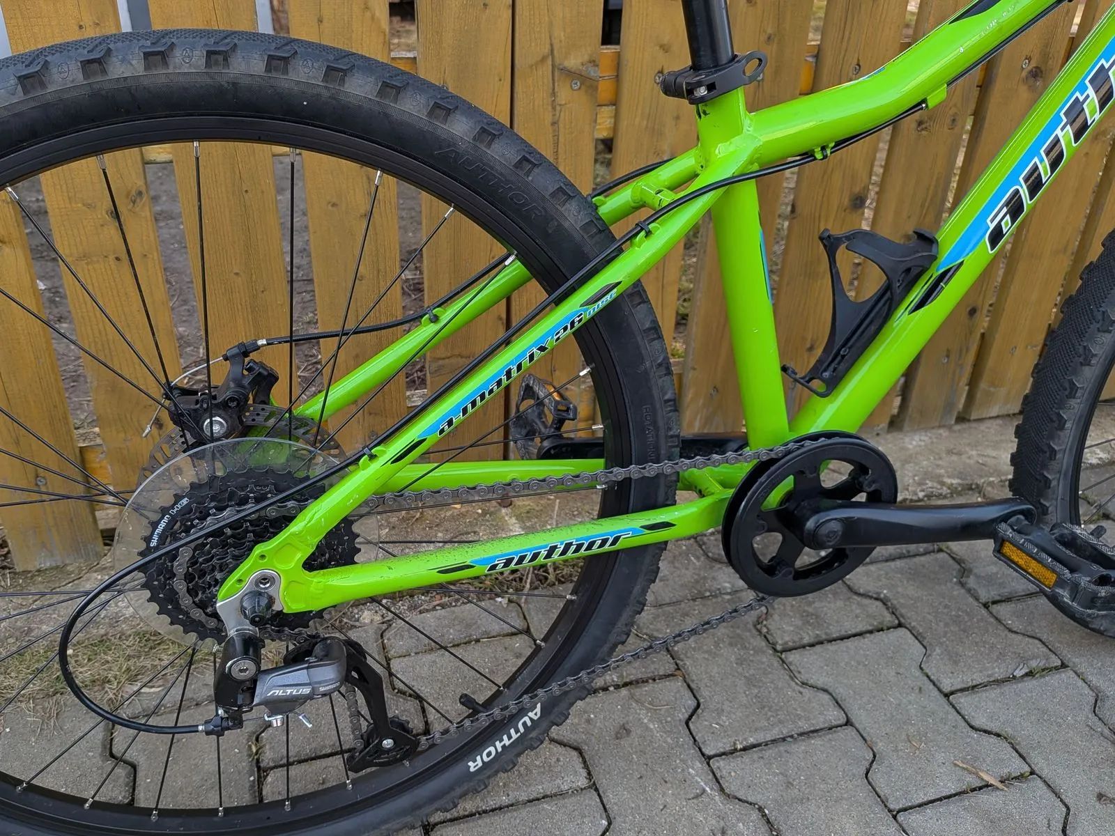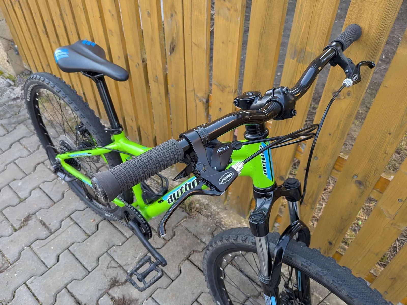 Dětské horské kolo Author A-Matrix D 26 - zhruba 130-155cm. Výborný stav, málo jeté, velice zachovalé. Kola 26", osazení Shimano Altus 1x9 rychlostí, odpružená vidlice RST, mechanické kotoučové brzdy Tektro, hmotnost 12,9 kg.
