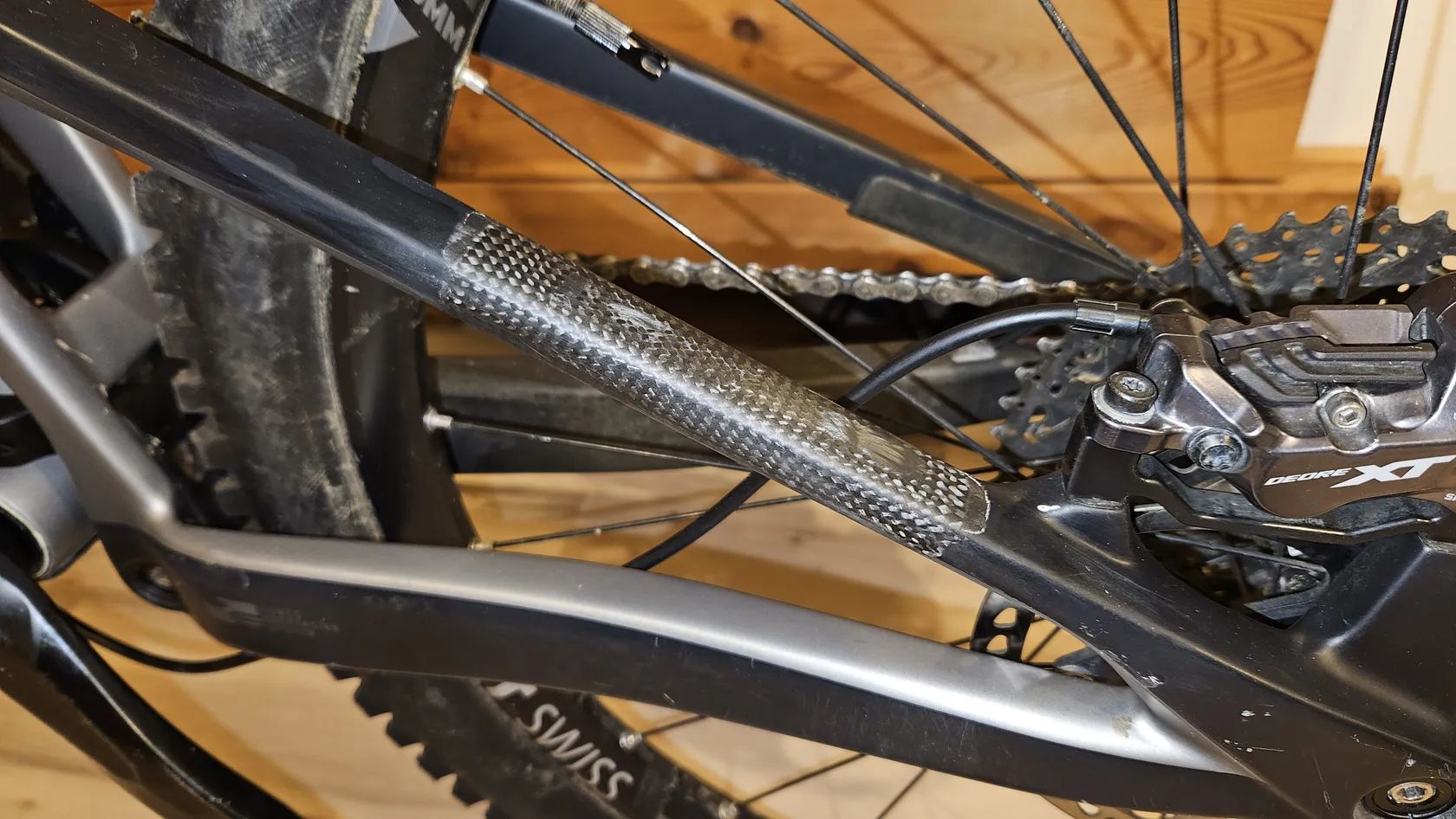 Kolo má provozní šrámy, profesionálně opravenou prasklinu na zadní stavbě a prasklý konus pod šroubem zadní osy (uváděno bez vlivu na funkčnost, možné řešení výměnou dílu / úpravou osy).