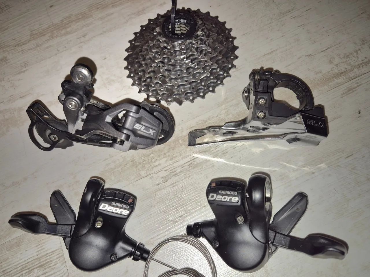 Převodová sada 3x9 Shimano. Páčky Deore SL-M530 s 2way release, přehazka SLX RD-M662 shadow, přesmykač SLX FD-M660 s horním i dolním tahem, kazeta SRAM 11-32. Minimální oděrky, mechanicky vše bezvadné. Osobně v Brně-Líšni nebo zásilkovna za +90Kč