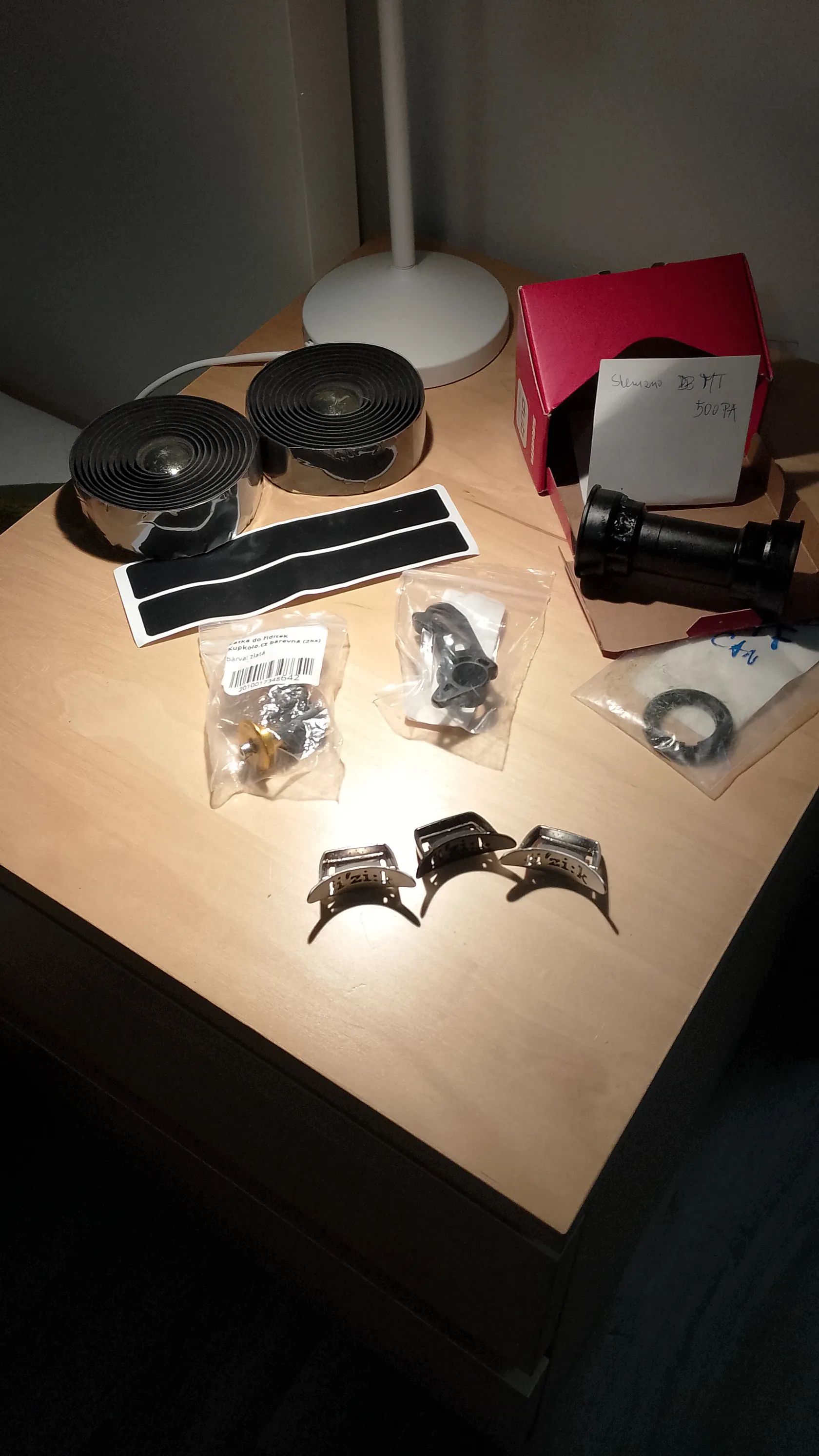 Prodám po úklidu : - omotávka nová černá na gravel/sil. řídítka - 50,- Kč - střed Shimano PF MT - 501 zánovní - 50,- Kč - klipy do sedel Fizik (Tundra, Arione apod.) 3ks - á 20,- Kč - nová patka MTB Canyon-Grand Canyon 11s - 20,- Kč - zátky do řídítek nové zlaté - 30,- Kč Ceny při osobním odběru , jinak plus poštovné.