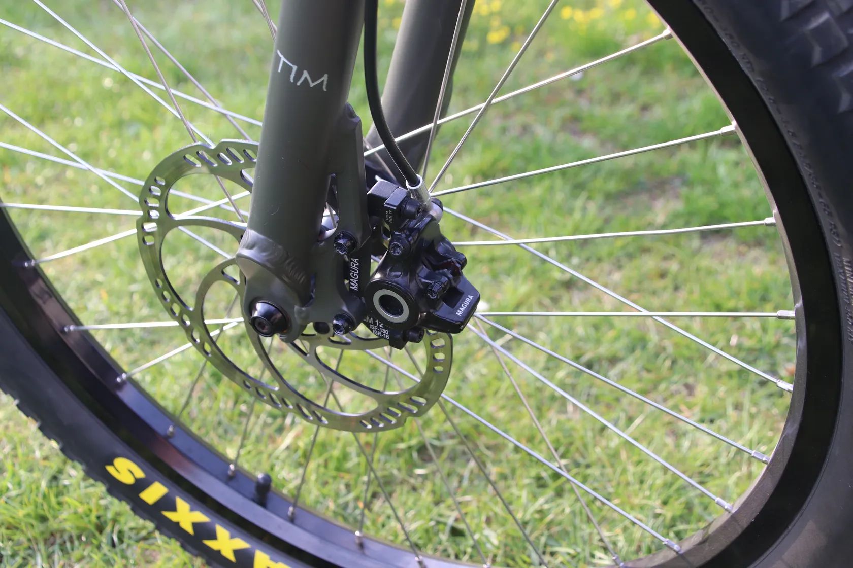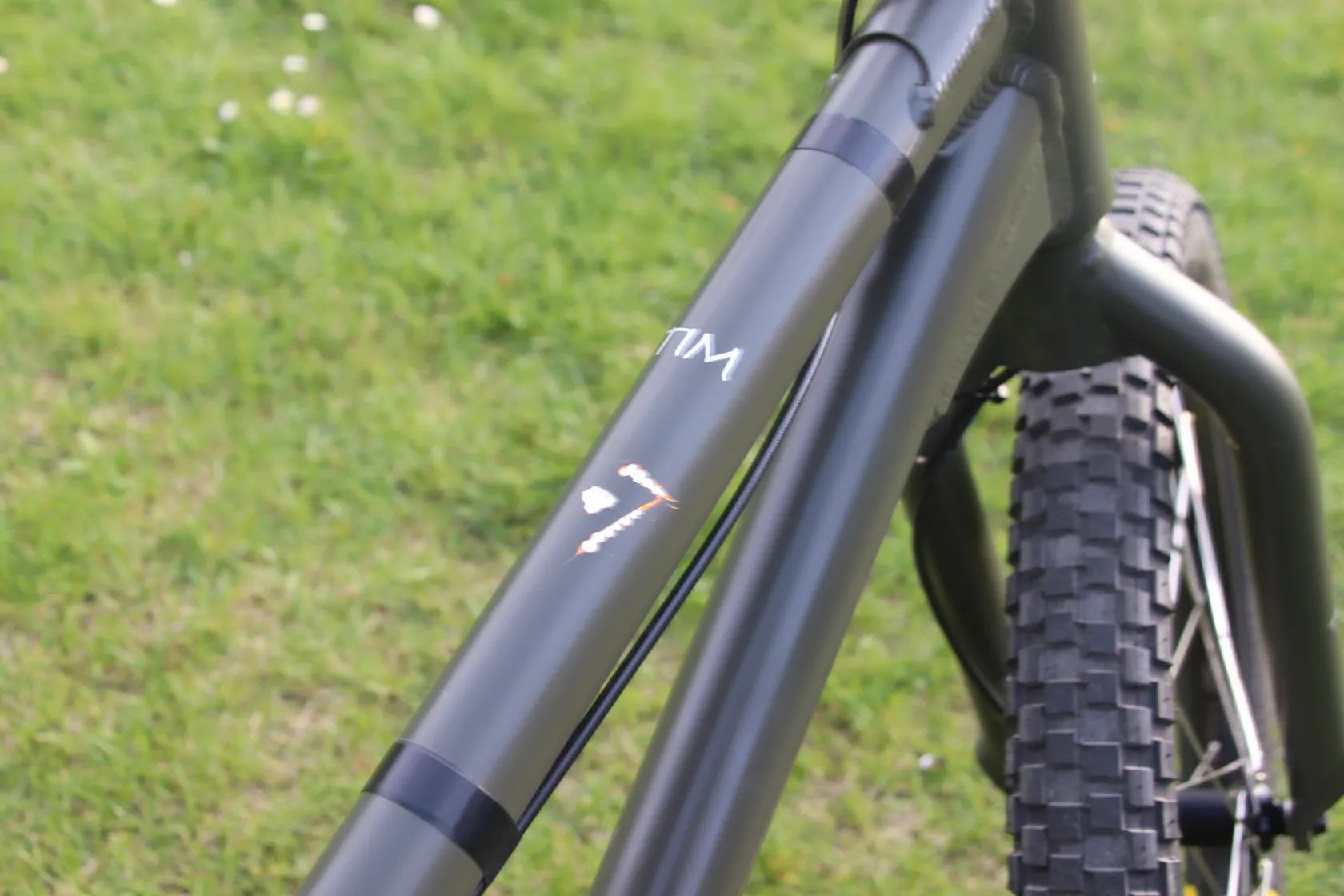 Kolo jsem kupoval od kamaráda z Německa, který si ho nechal po koupi profesionálně přelakovat z původní oranžové barvy, na současnou tmavě matnou šedozelenou a asi na čtyřech místech má napsané i svoje jméno - Tim (viz. foto). Na fotkách jsou taktéž vyfocené odřeniny, kterých není mnoho, jen ta na horní rámové trubce je vcelku viditelná, což je zohledněno v ceně.
