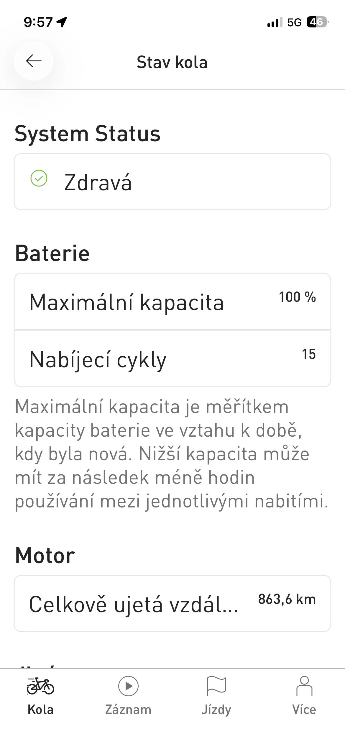 Baterie 500 Wh – solidní kapacita pro delší vyjížďky, uváděn stav 100 %
