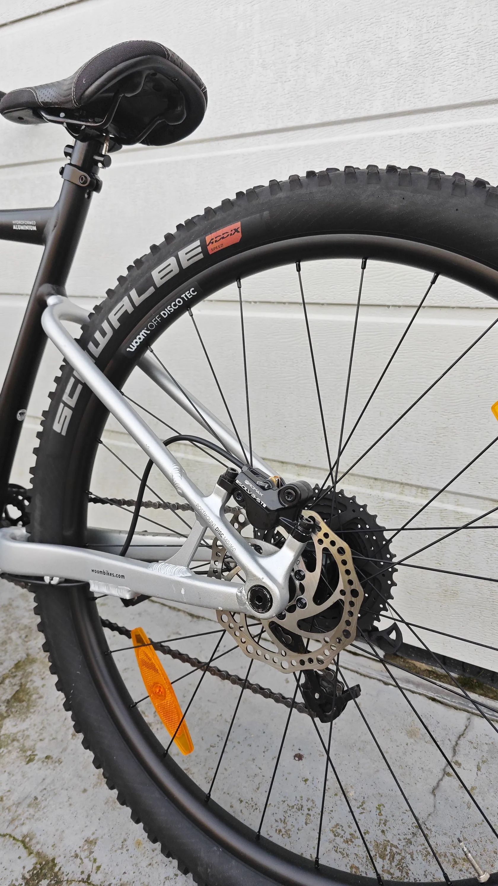 Horské kolo Woom Off Air s hydraulickými brzdami a odpruženou vzduchovou vidlicí je vhodné pro děti od 10 do 14 let s výškou 140 až 165 cm (jezdili jsme již od cca 135 a nebyl problém upravit posez).