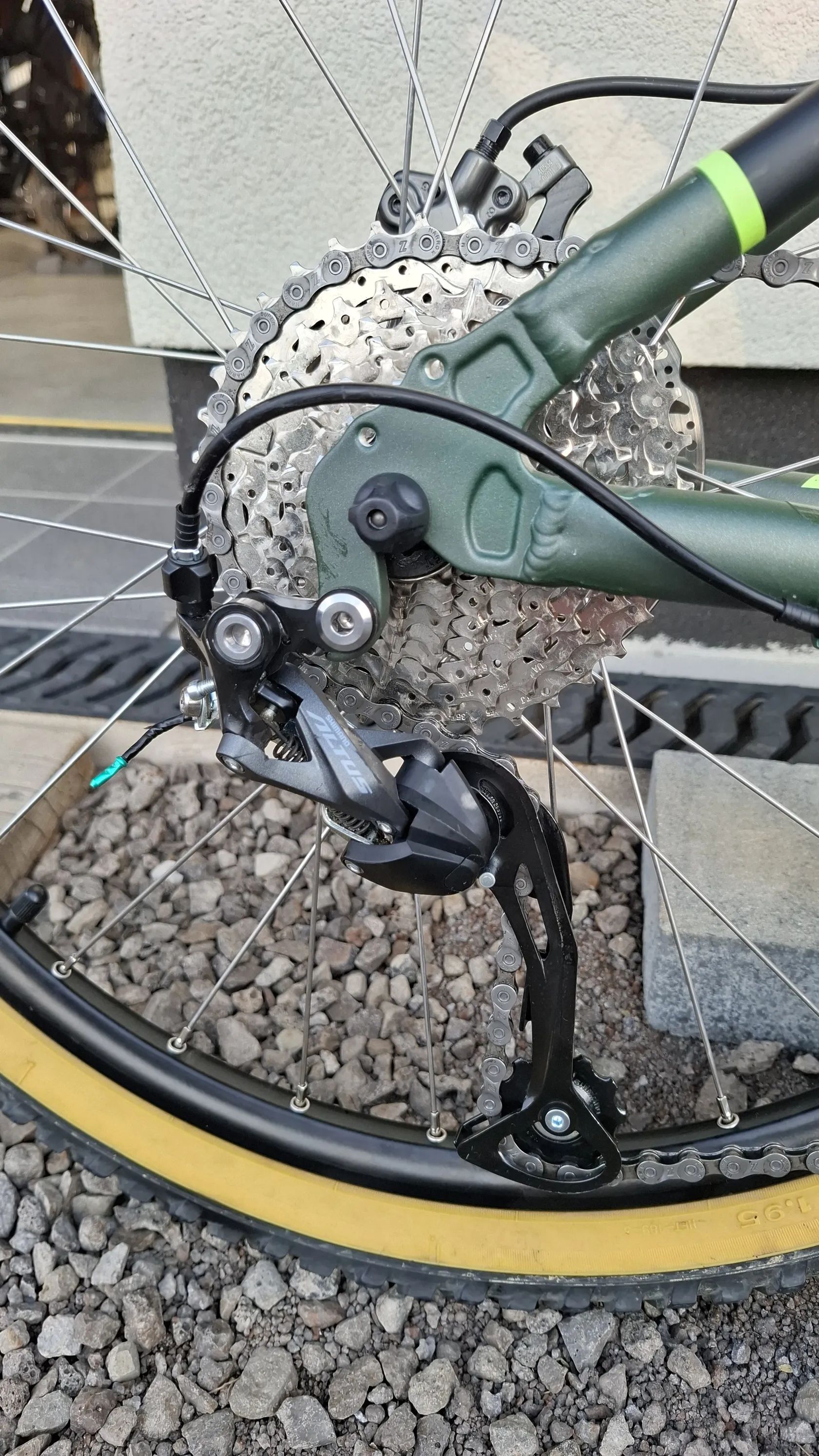 Převody 1x9 Shimano Altus – jednoduché ovládání pro dítě (jen jedna páčka na přehazování), dostatečný rozsah pro kopečky i roviny.