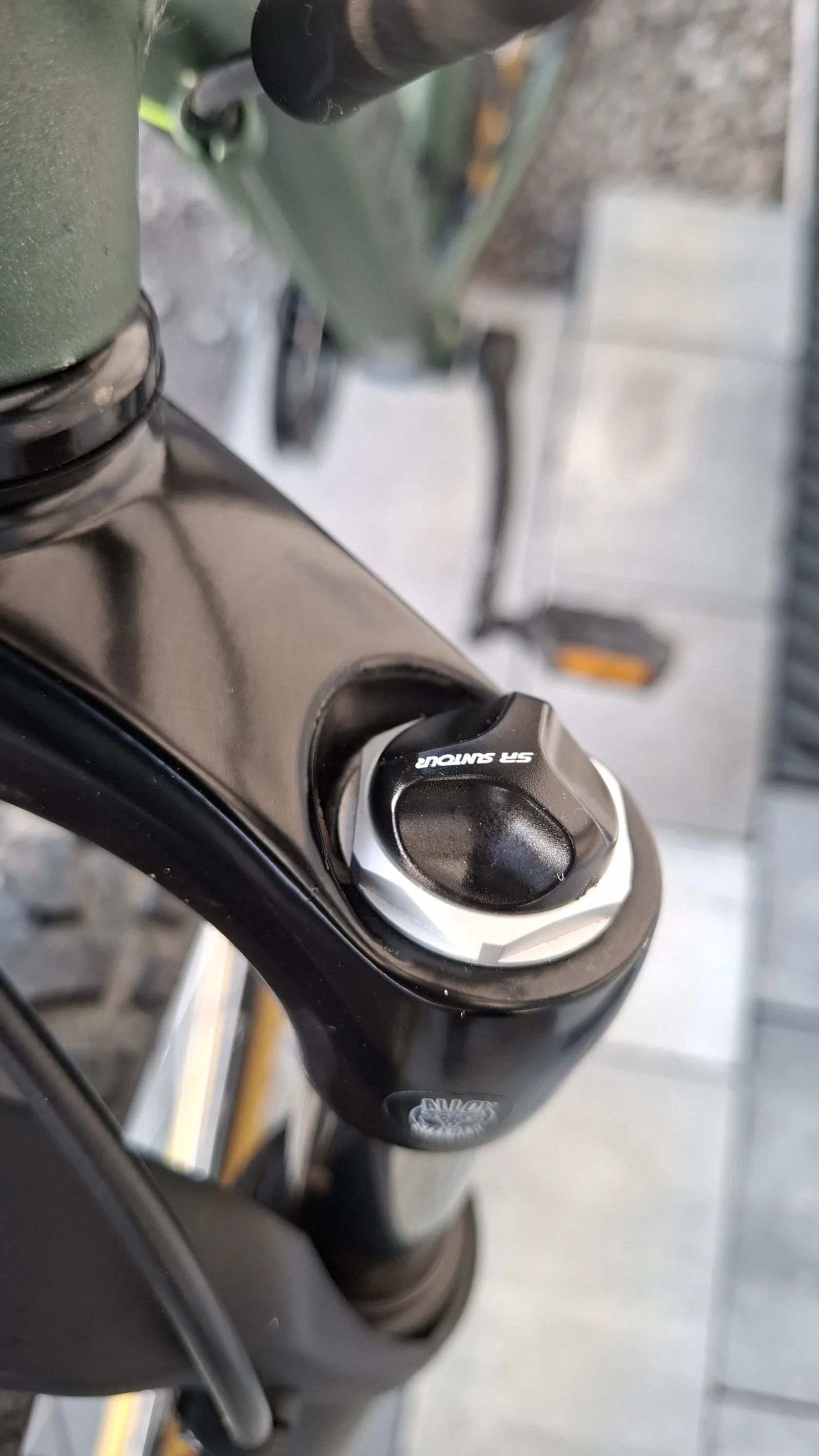 Vzduchová vidlice Suntour – lepší citlivost a nižší hmotnost než u pružinové, plus možnost nastavení podle váhy dítěte.