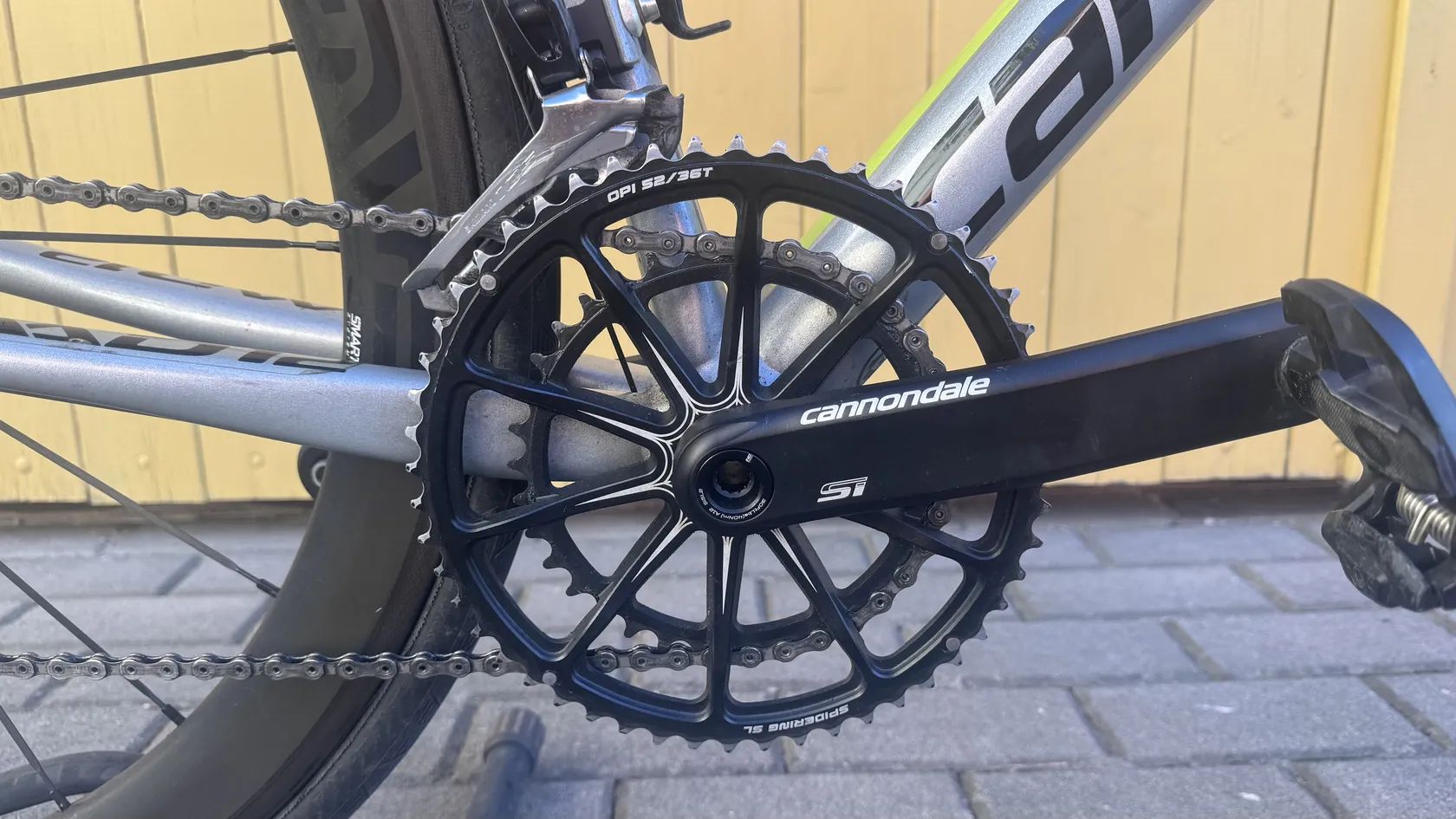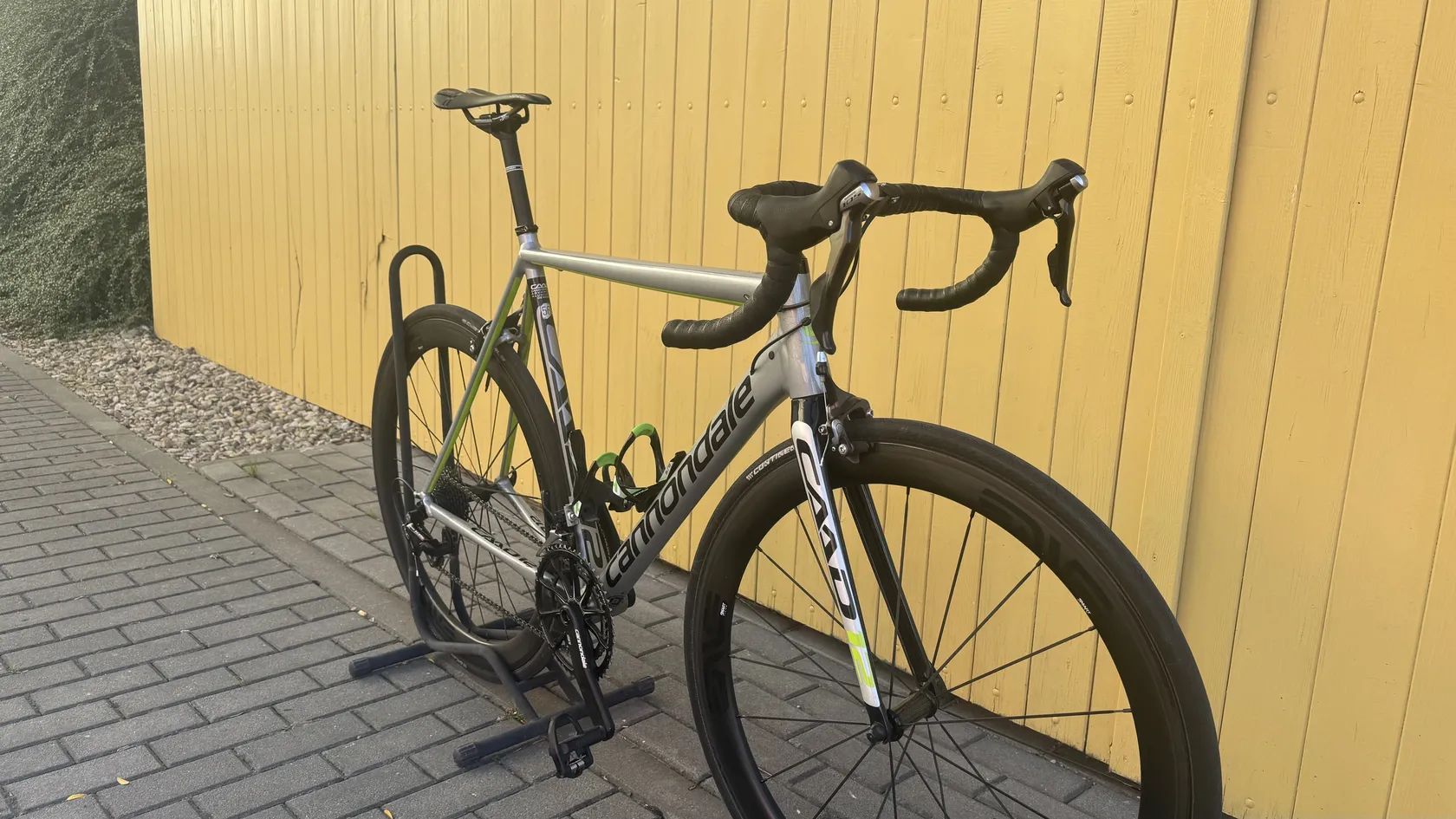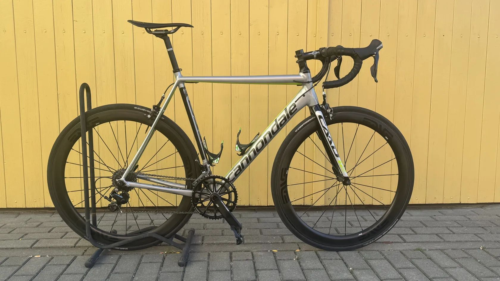 📌 Specifikace: • Rám: Cannondale CAAD12, hliník, stříbrno-černý • Vidlice: karbonová CAAD12 SAVE • Kliky: Cannondale Hollowgram Si s převodníkem Spidering SL • Přehazovačka a řazení: Shimano 105 (11 rychlostí) • Kola: karbonová zapletená kola 50 mm (rychlá a tuhá) • Pláště: Continental Grand Prix 4000 II • Pedály: Look Keo (možno ponechat) • Dva košíky na láhev Cannondale