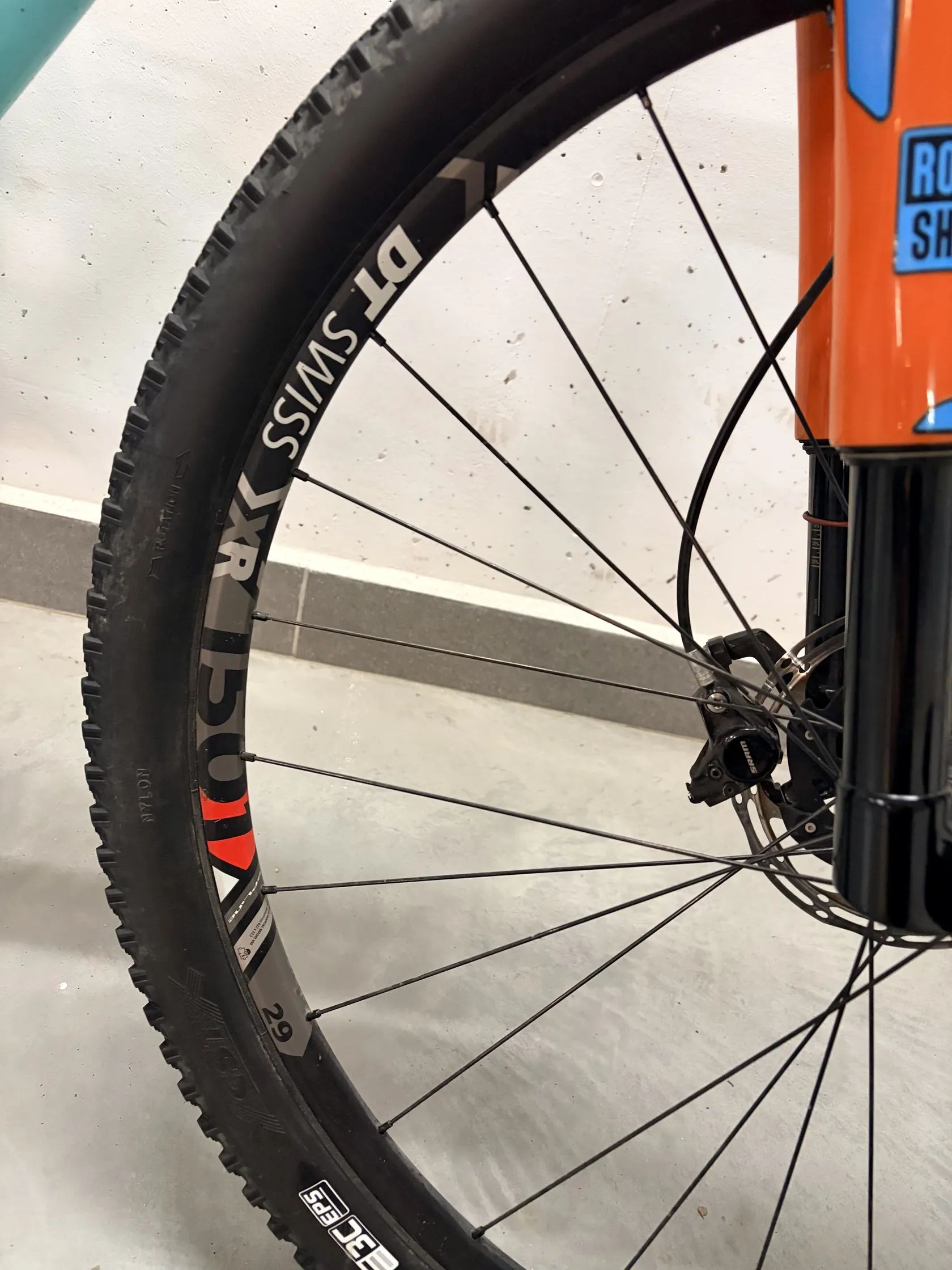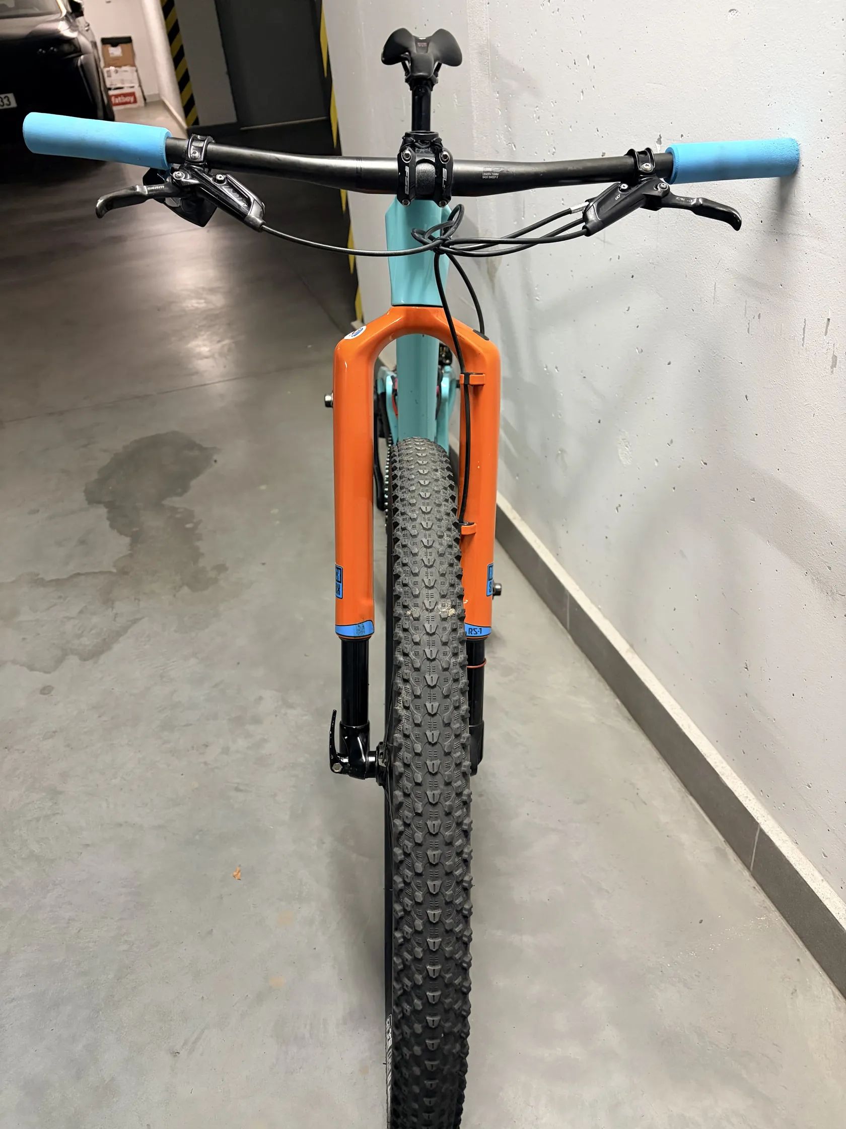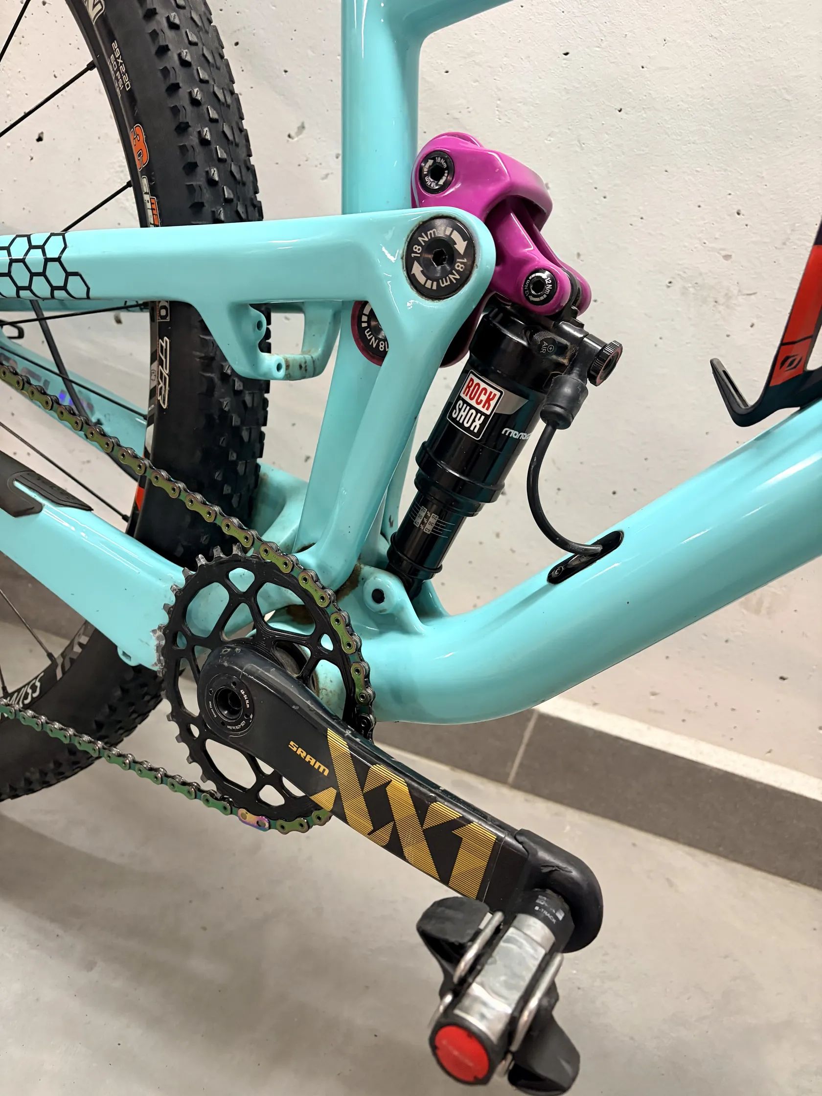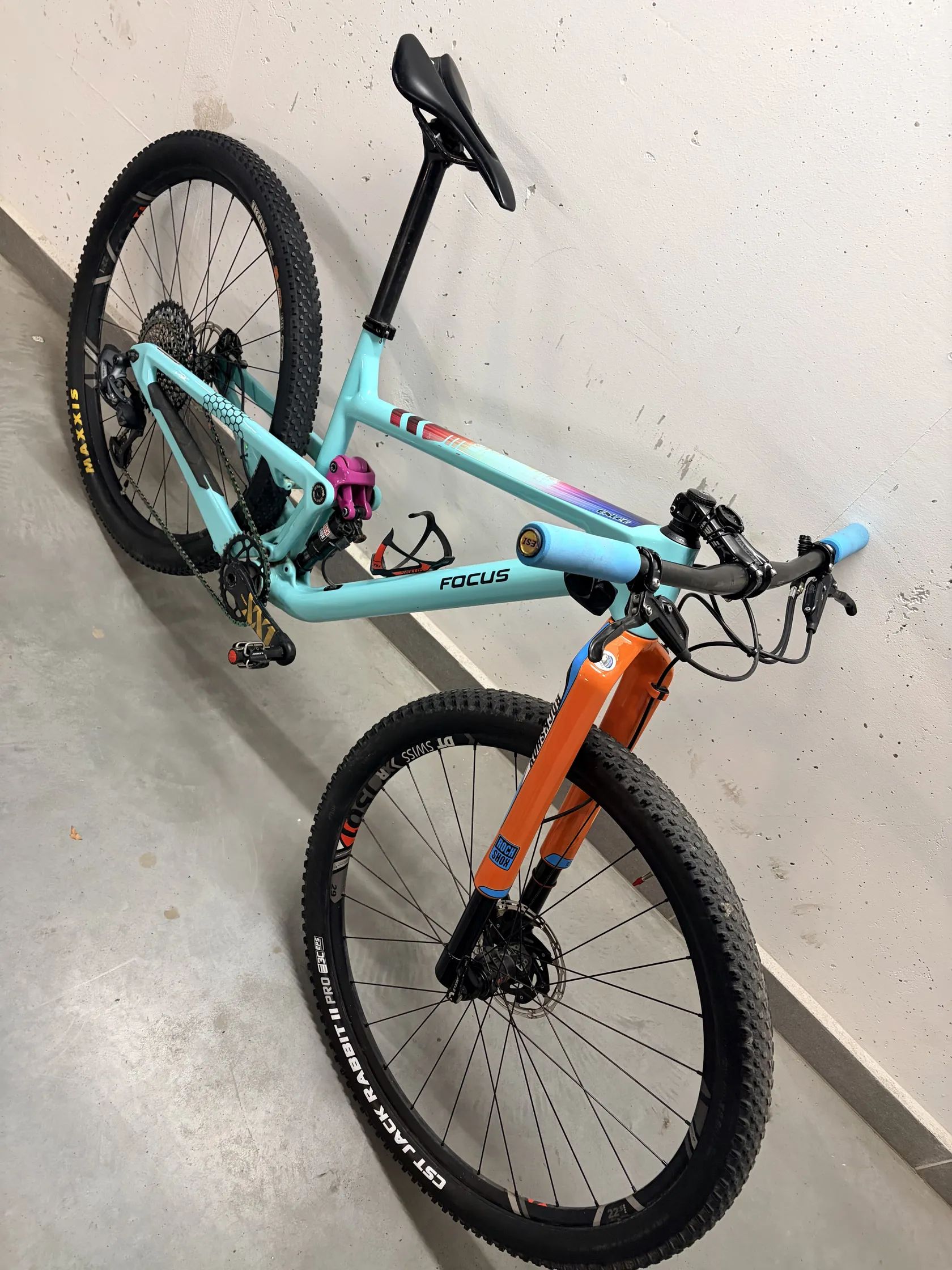 Rám: O1E Carbon s novými čepy Řazení: (Sram XX1 Gold na lanku původně) před dvěma lety upgrade na elektrické řazení: XX1 AXS Přehazovačka: elektrická XX1 AXS. (Kladky 100%) Kliky: XX1 Gold Carbon Převodník: AbsoluteBlack oval 34T offset 3mm black (80%) Řetěz: XX1 Rainbow (80%) Kazeta: XX1 Rainbow 10-50 (80%) Vidlice: RockShox RS1 Carbon, tuhá, reverzní a nešpiní se, po přetěsnění 100%, 100mm zdvih. Zadní tlumič: Rockshox, po repasu a těsnění 100% stav, 100mm. …(Oba tlumiče se uzamykajií hydraulikou, paralelně z řídítek bez lanka, viz foto zamykání RockShox.) Sedlovka: Carbon originál Sedlo: Prologo Nago Evo Carbon Lyžiny Řídítka: Carbon originál Predstavec: Závodní SL-K Madla: Esi Extra Chunky Brzdy: Sram Level Ultimate Carbon Náboje: DTSwiss 240, pevné osy Kola: DTSwiss XRC1501 Výplet: je dělaný nově okolo Vánoc, kvalitní dráty.. Pláště: na mlíku 2.2 Maxis Ikon 3C a 2.35 CST Jack Rabbit Pro 2 3C, 70% stav na foto.
