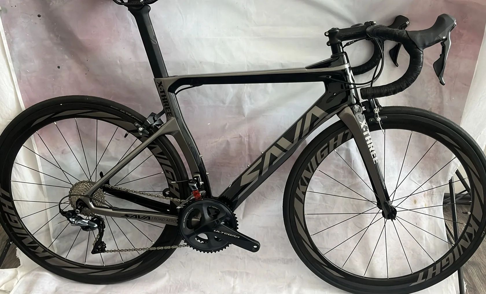 Kolo je osazeno komplet sadou Shimano Ultegra r8000 (50/34, 11-32) Karbonové ráfky Knight 45mm Rám a vidlice karbon, sedlovka a řidítka od značky Knight také karbon, představec hliníkový, sedlo Fizzik Antares, pláště Continental grand sport race. Ke kolu přidám obyč. nášlapné pedály.