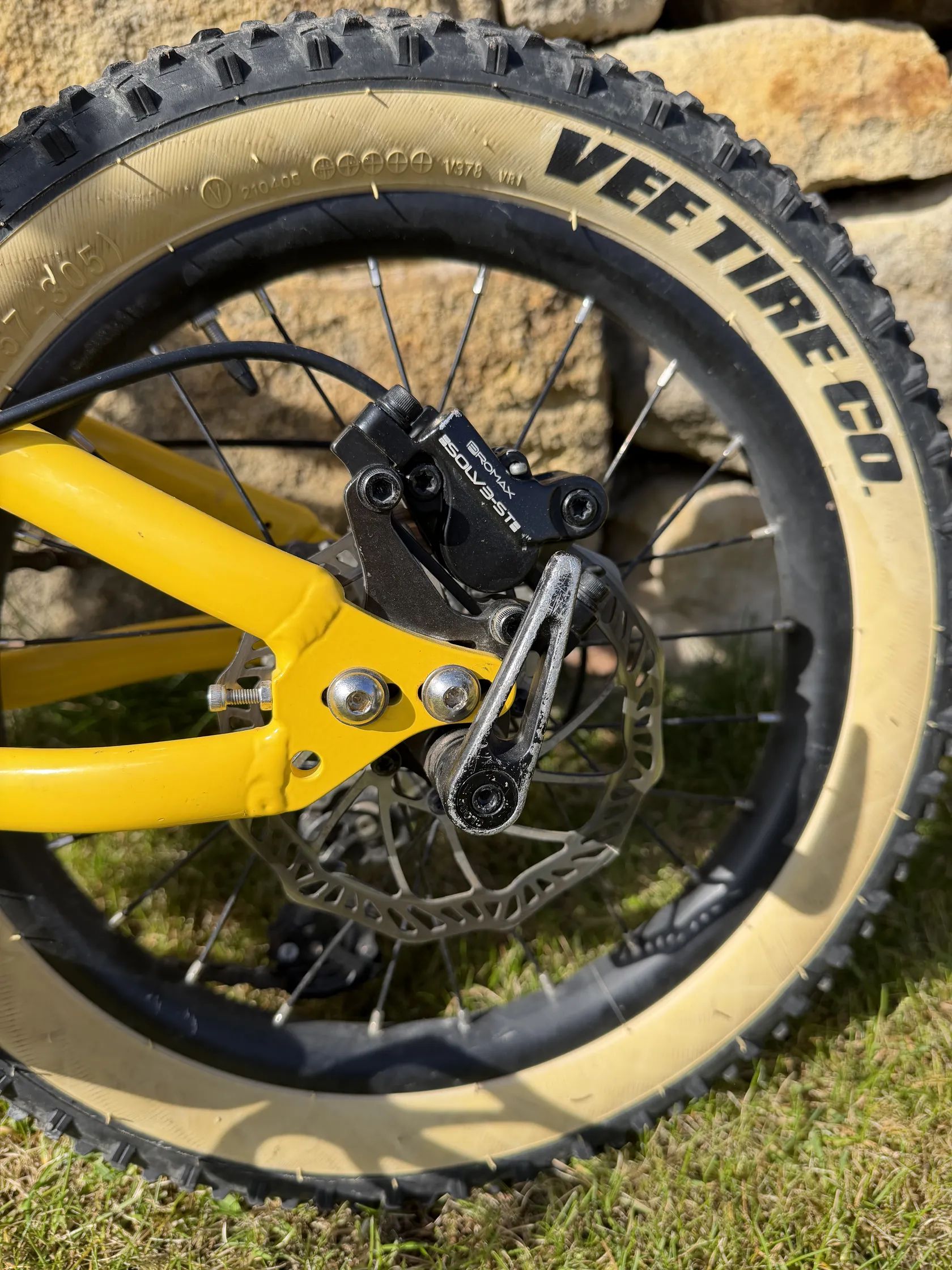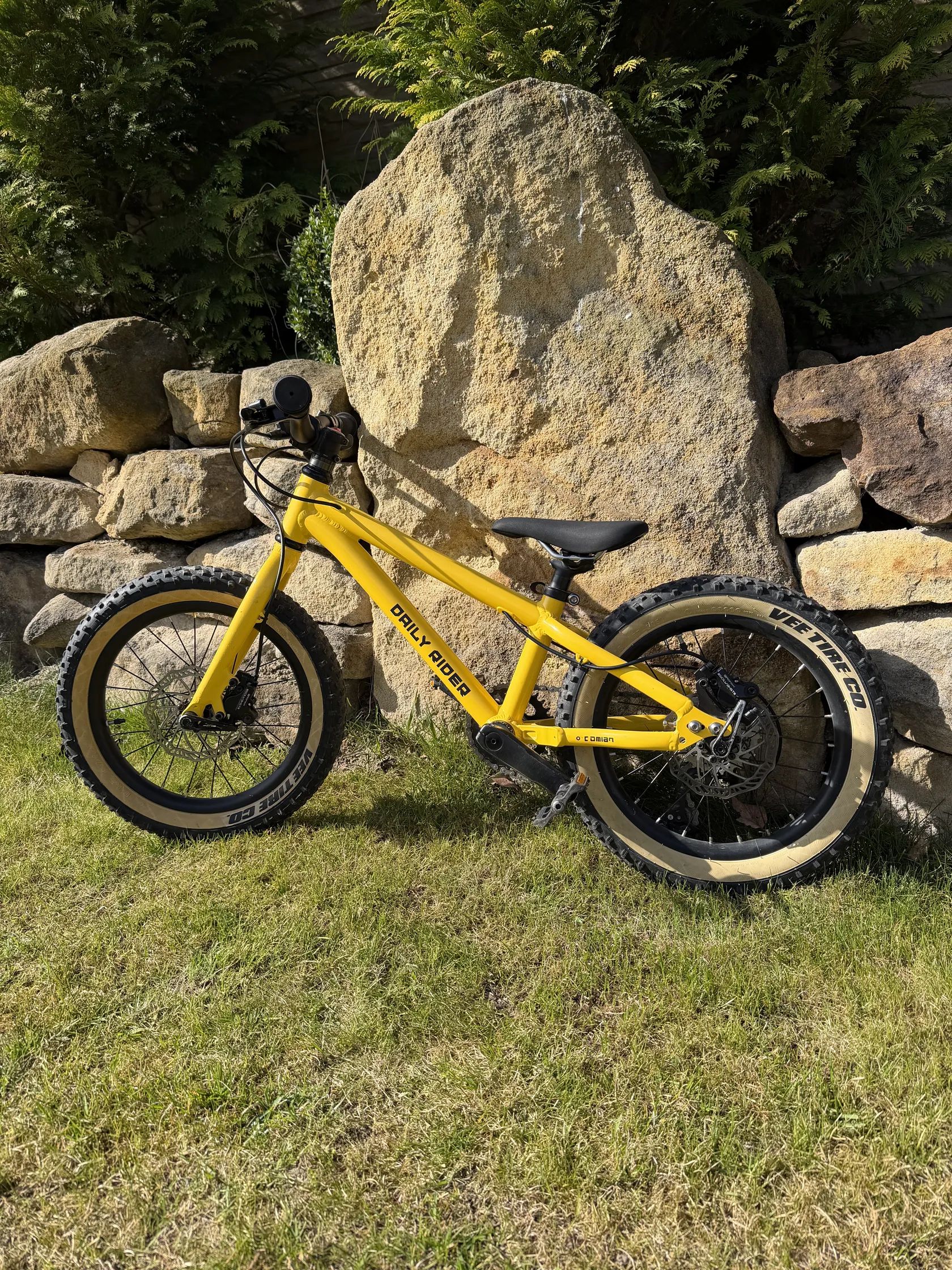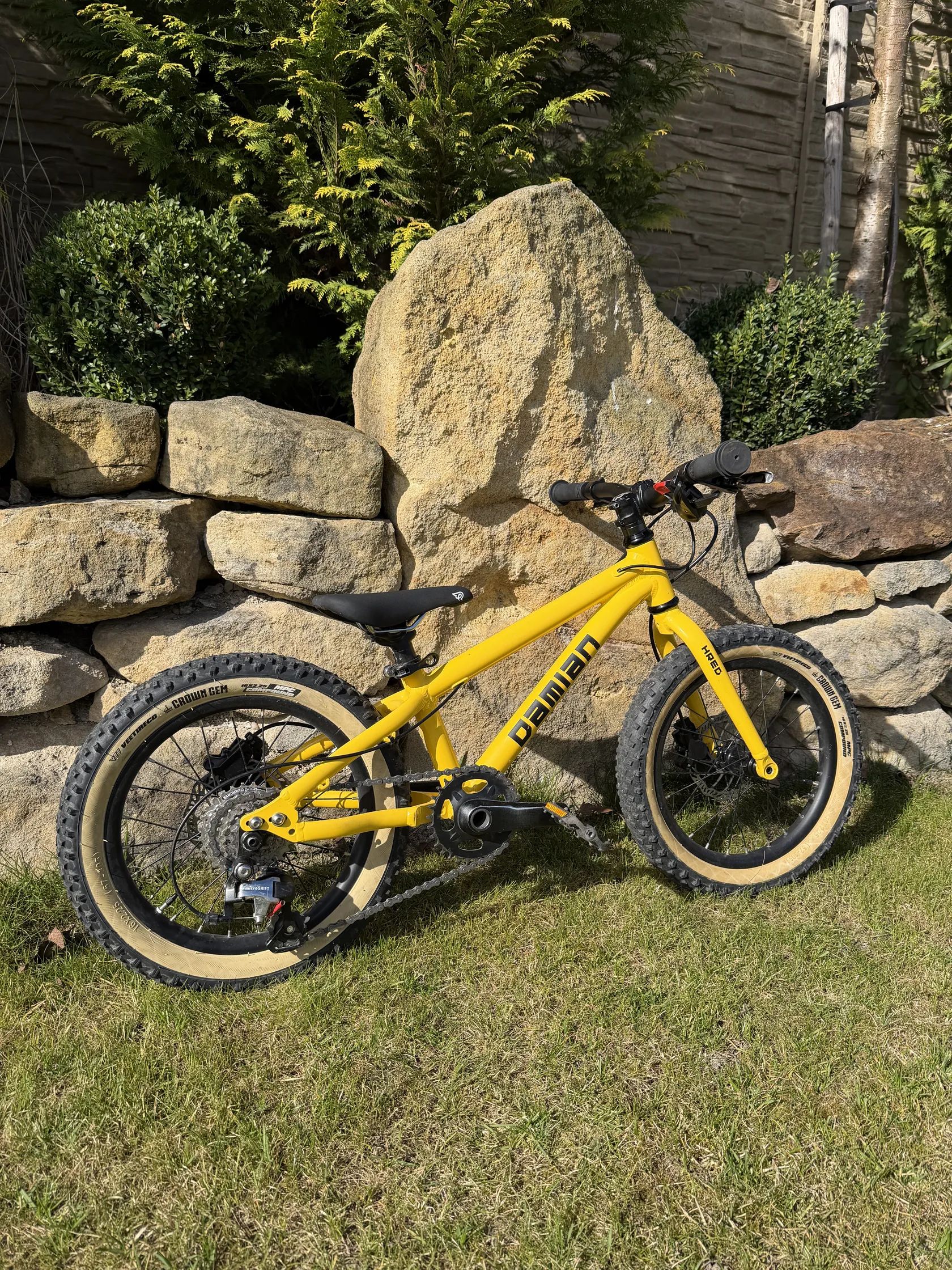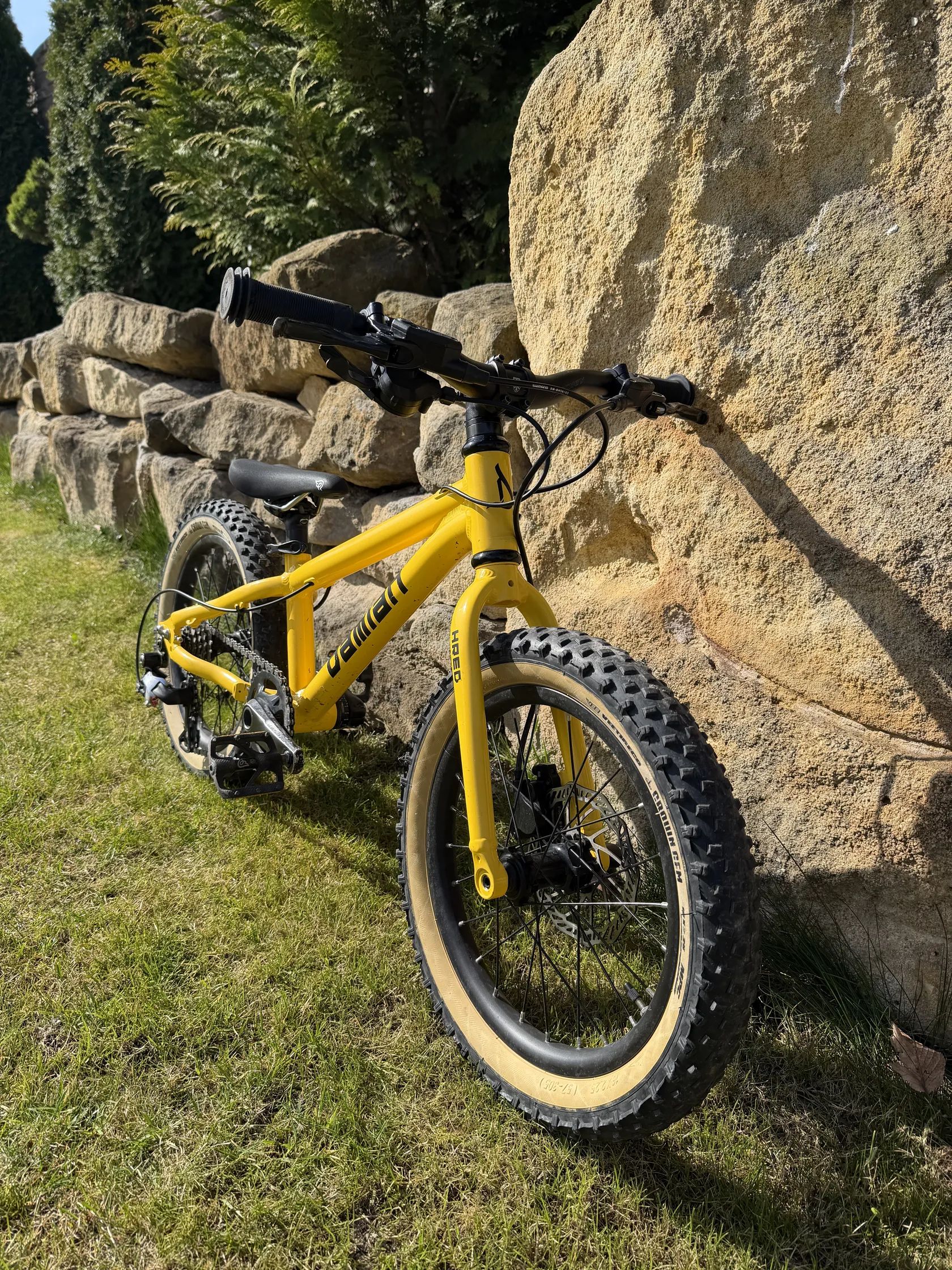 Kotoucove hydraulicke brzdy, prehazovacka microshift. I s timto osazenim, vaha kolem 8 kg. Idealni na trailove jezdeni, pumptracky apod. pro deti od cca 4 let, co uz jezdi trochu vice. Nova barva ramu (ne z duvodu poskozeni, ale preference zlute :) Pedaly nove, jezdene rok, sedlo take. Samolepky vinyl lze v pohode sundat.