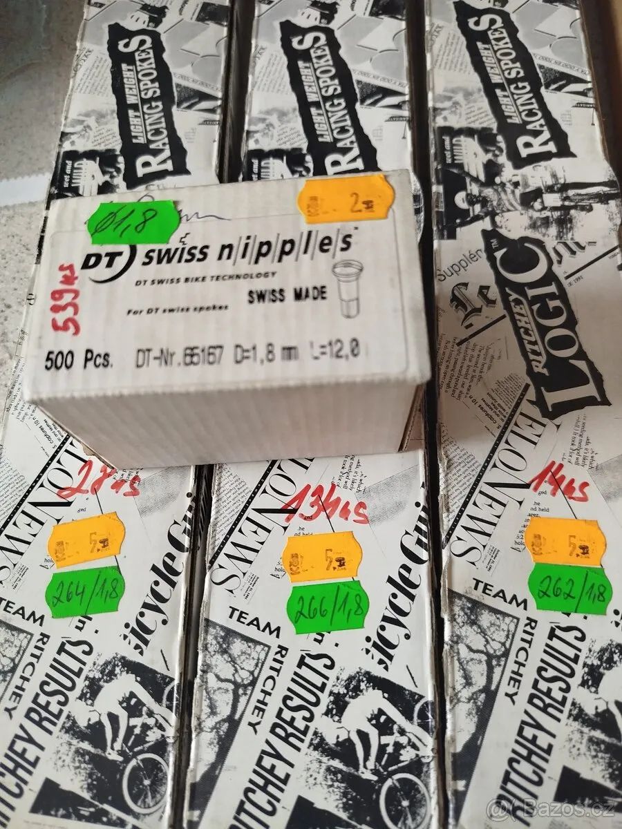 Nabízím 176 ks drátů v délkách 262,264,266mm a niple DT Swiss 539 ks, všechno 1,8mm..... Ideálně komplet, cenu nabídněte. Počty drátů jsou na krabičce červeně.