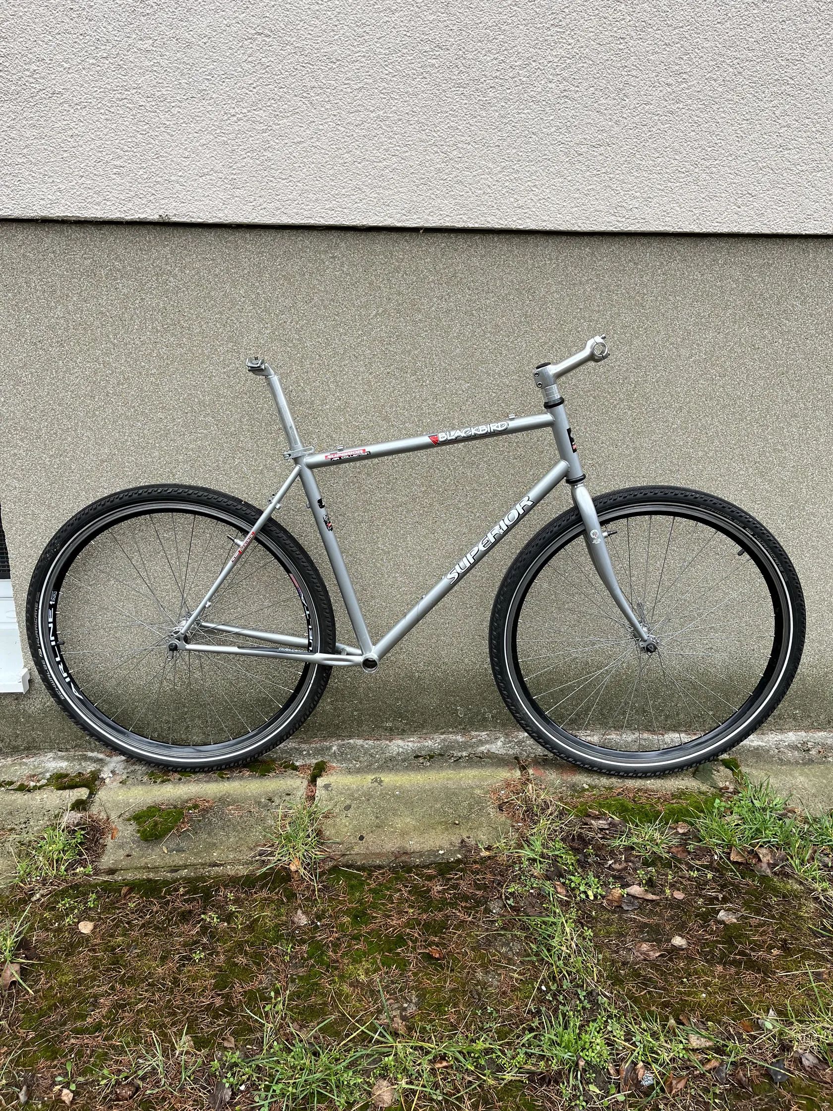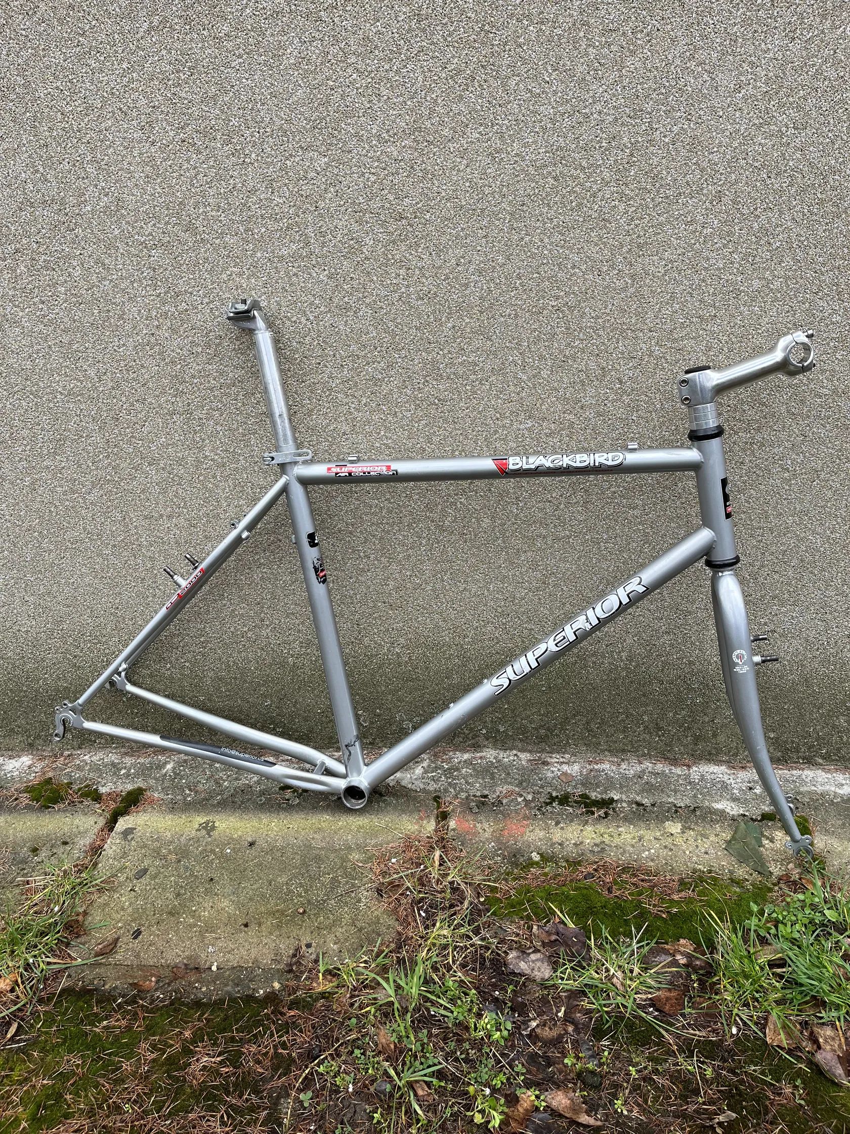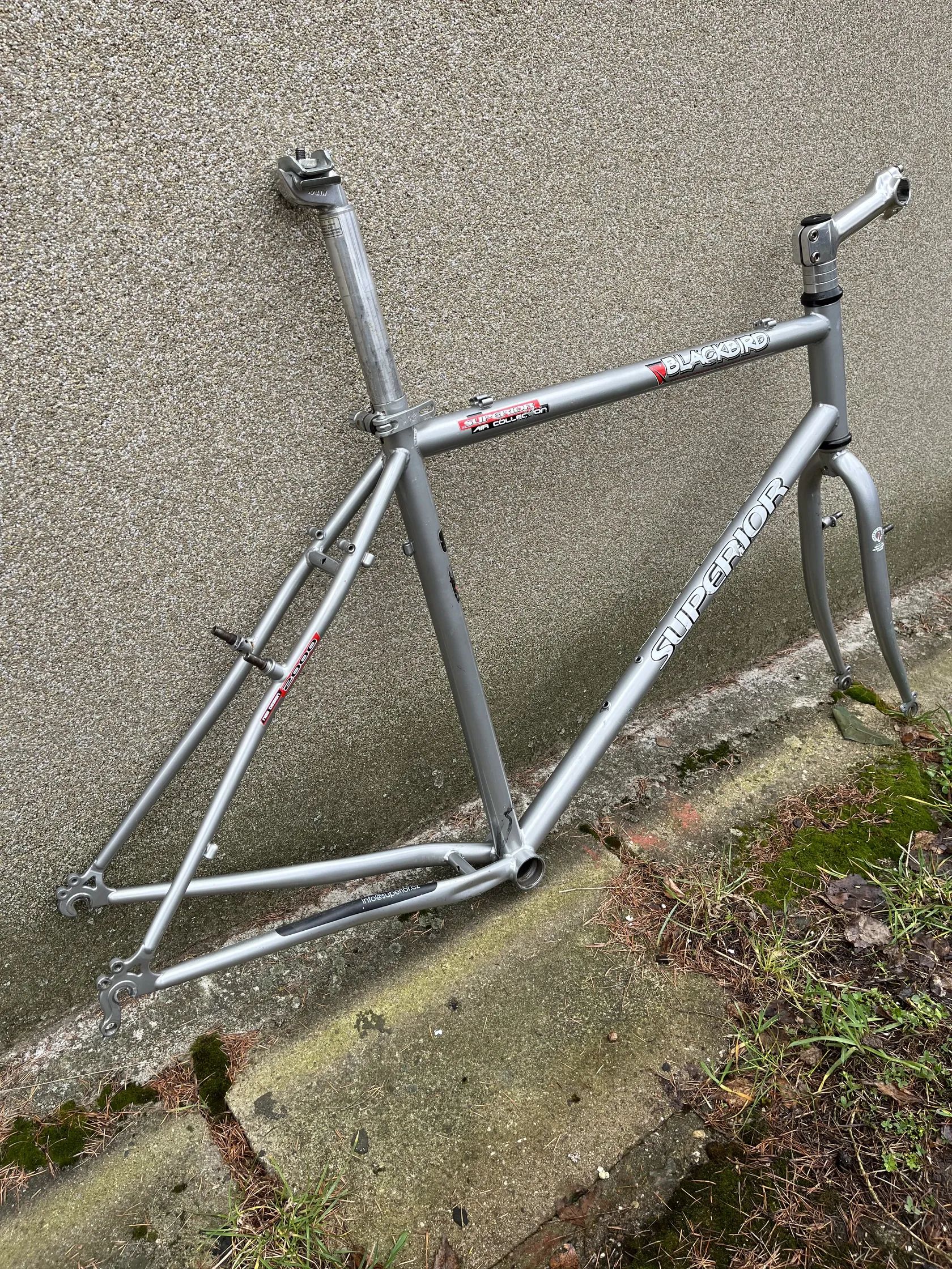 Prodám rámový set Superior Backbird 28”. Je to naprosto obyčejná rámová sada ze základních “vodovodních” trubek, výhodou je i na dnešni poměry skvěla geometrie. Ram a vidle pobere hladké pláště 2.00 (přidal jsem několik foto pro představu kolik je tam místa a jak by vypadal s plaštěma 28x2.00, zubaté tam se vejdou ale zanechá minimum prostoru. Velikost rámu 21”, sedlová trubka 49/53cm (střed-střed/vršek), horní trubka 57cm (střed-střed), hlavová 16cm, hlava 1 1/8”, průměr sedlovky 29,4. Zkusím to shrnut: těžší ocelovy ram který bude super (v poměru cena/kvalita) zakladem na gravela, trekinga nebo měšťáka. Velikánskou výhodou aheadovy průměr hlavka, a když to kolo omrzí nezbyde nic lepšího než navařil uchyceni na kotouče.