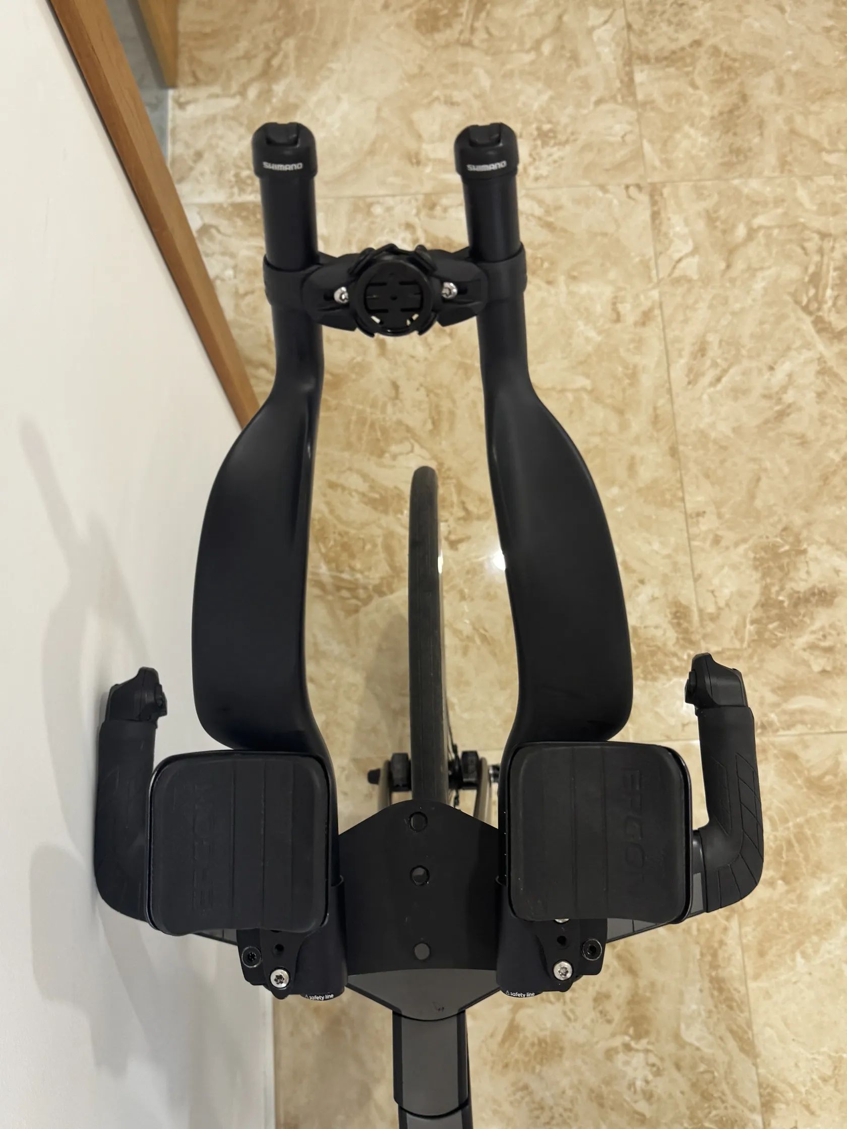 • Kokpit: Agresivní fit, Ergon opěrky. Di2 řazení vyvedené jak na hrazdě, tak na basebaru (u brzdových pák). Lze flexibilně vypodložit podle vaší mobility. Ke kolu dodávám kompletní fitting spacer kit a custom 3D vytisklý 15 stupňový spacer.