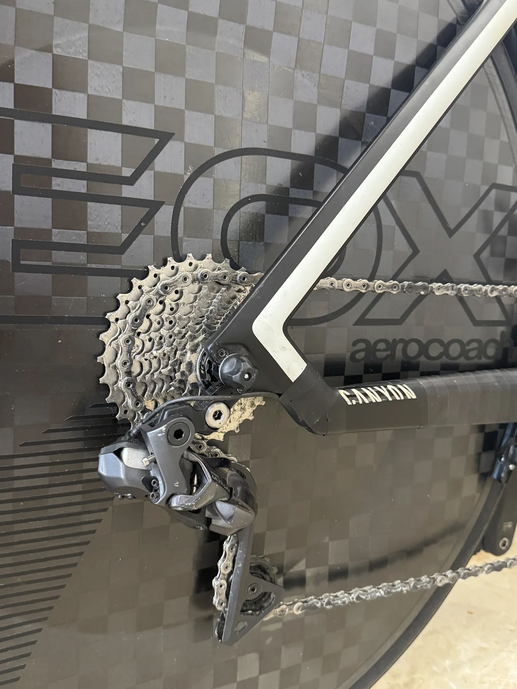 • Pohon: 1x setup. Elektronika Shimano Ultegra Di2. Vpředu plná aero placka s custom 3D krytem [54T], kliky 165mm, vzadu kazeta shimano 105 [11-34]. Oblast u středu nese běžné provozní stopy, ale mechanicky je vše na 100 %. Prodávám s řetězem navoskovaným silca hot wax.