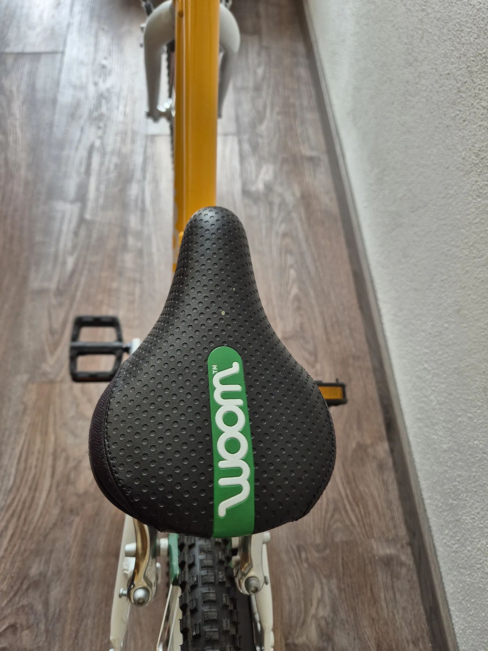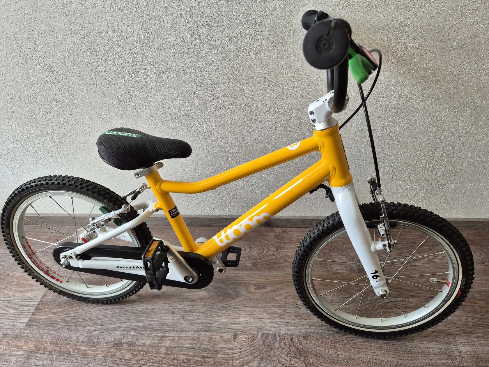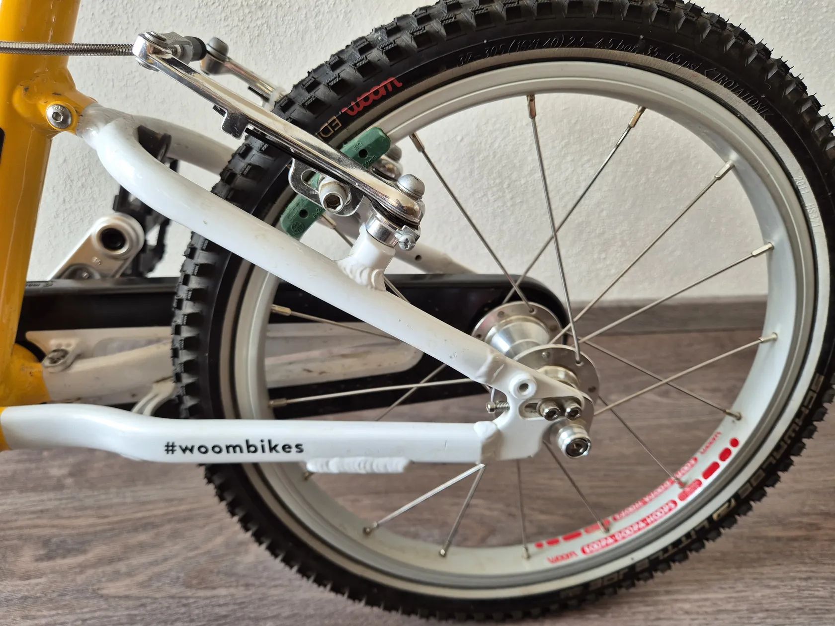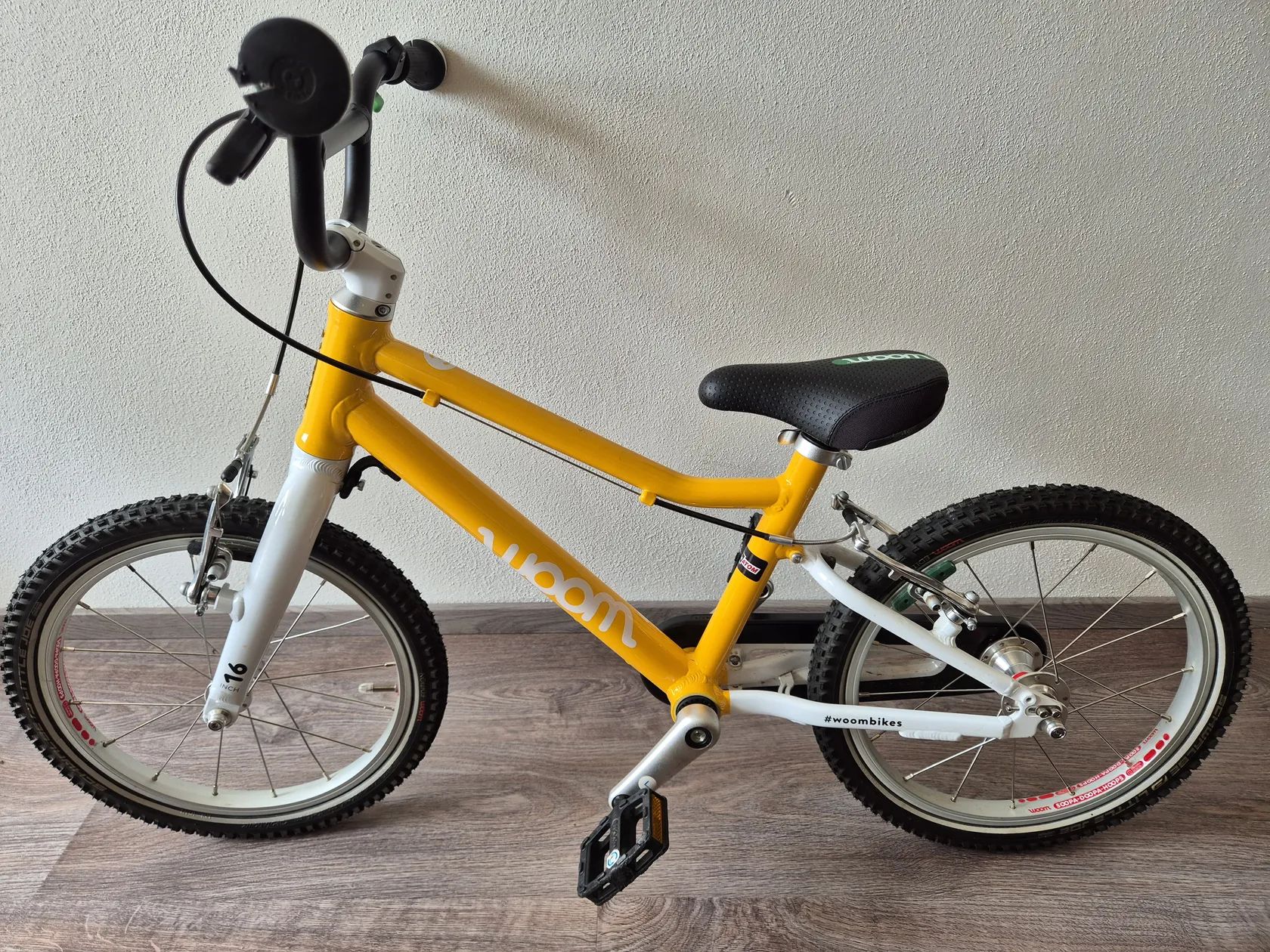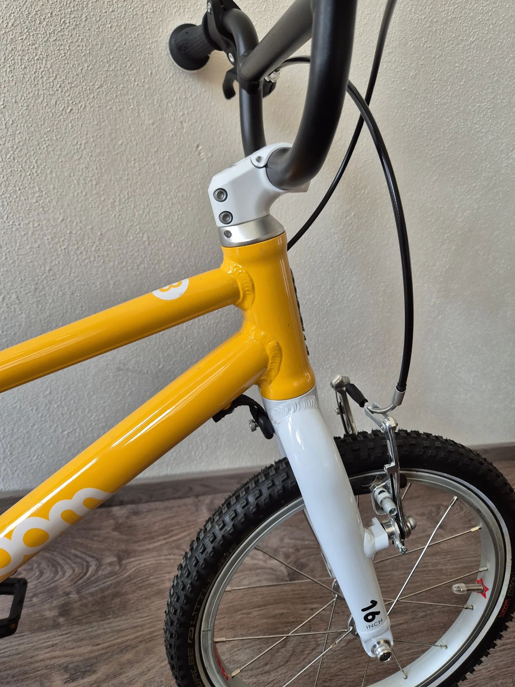 Dětské kolo "16" Kolo bylo využívané jednu sezonu, je v TOP stavu, nijak neponičené, lehce šlapky nepatrně sedřené, jinak nic výrazně viditelného. Lehce řidítka. Určitě super vidět kolo -Skvrnany. Dětské jízdní kolo Woom Original 3 váží pouhých 5,4 kg! Geometrie rámu nabízí přirozený vzpřímený posed jezdce a zajišťuje tak bezpečné a jisté ovládání. Kolo Woom 3 je osazeno komponenty speciálně navrženými pro dětské potřeby. Má barevně odlišenou zadní brzdu pro snadnou orientaci a rychlé osvojení jízdních dovedností, omezovač proti přetočení řídítek, ochranný kryt řetězu, kvalitní lehké pláště Kenda a možnost snadné úpravy výšky sedla pomocí rychloupínáku. Rám: lehký, vysoce kvalitně zpracovaný AA-6061 hliník, bezešvé trubky Vidlice: lehká, hliníková s variabilním omezením otpčení předního kola Hlavové složení: plně integrované, 1" se zapouzdřenými průmyslovými ložisky Představec: nový, hliníkový 40mm / +15 ° se zapuštěnými šrouby Řídítka: široká, ergonomická pro větší stabilitu ve stylu BMX, průměr 19 mm, šířka 500 mm Gripy: Woom Ergogrip - nejmenší svého druhu Pohon: lehké kované hliníkové kliky 80 mm, 25 x 15T s chranou řetězu Pedály: plastové Brzdy: mini V-brzdy s nastavitelnými pákami pro drobné ruce, měkké zadní a tvrdší přední brzdové botky pro účinné brždění, vysoce kvalitní bowdeny Jagwire pro snížení tření, barevné rozlišené páky brzd a brzdových botek pro snadné rozlišení přední a zadní brzdy Ráfky: ultralight hliníkové Soopa-Doopa-Hoops, hliníkové náboje se zapozdřenými ložisky Pláště: Kenda 16 x 1,5 s nízkým valivým odporem a reflexním páskem Sedlo: ergonomický design specifický pro daný věk Sedlovka: hliníková s označením minimálního a maximálního zasunutí Váha: 5,3 kg (bez pedálů) Nosnost: 60 kg