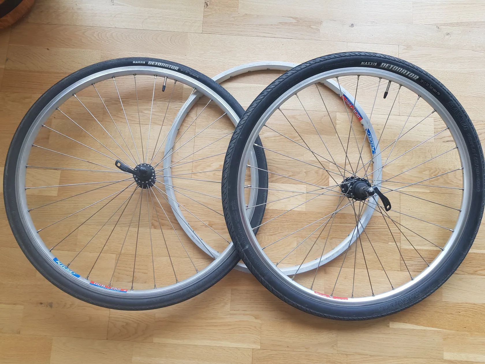 Prodám kola sestavená z nábojů Deore 510, nerezových drátů 32/32, ráfků Ritchey OCR Pro, a skládacích plášťů Maxxis Detonator 1,25/1,5. Kola pouze pro ráfkové brzy, náboje se točí hladce, ráfky neprobržděné, zadní plášť téměř nový, přední sjetý tak z 50%. Součástí je náhradní stejný ráfek, který je nepoužitý.