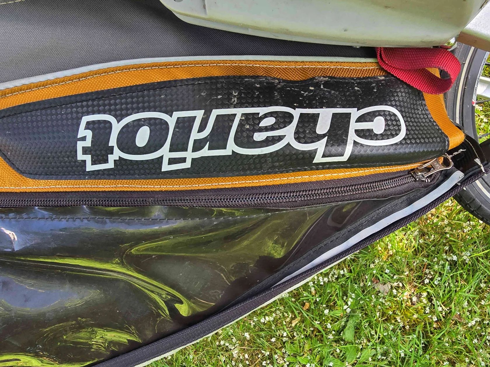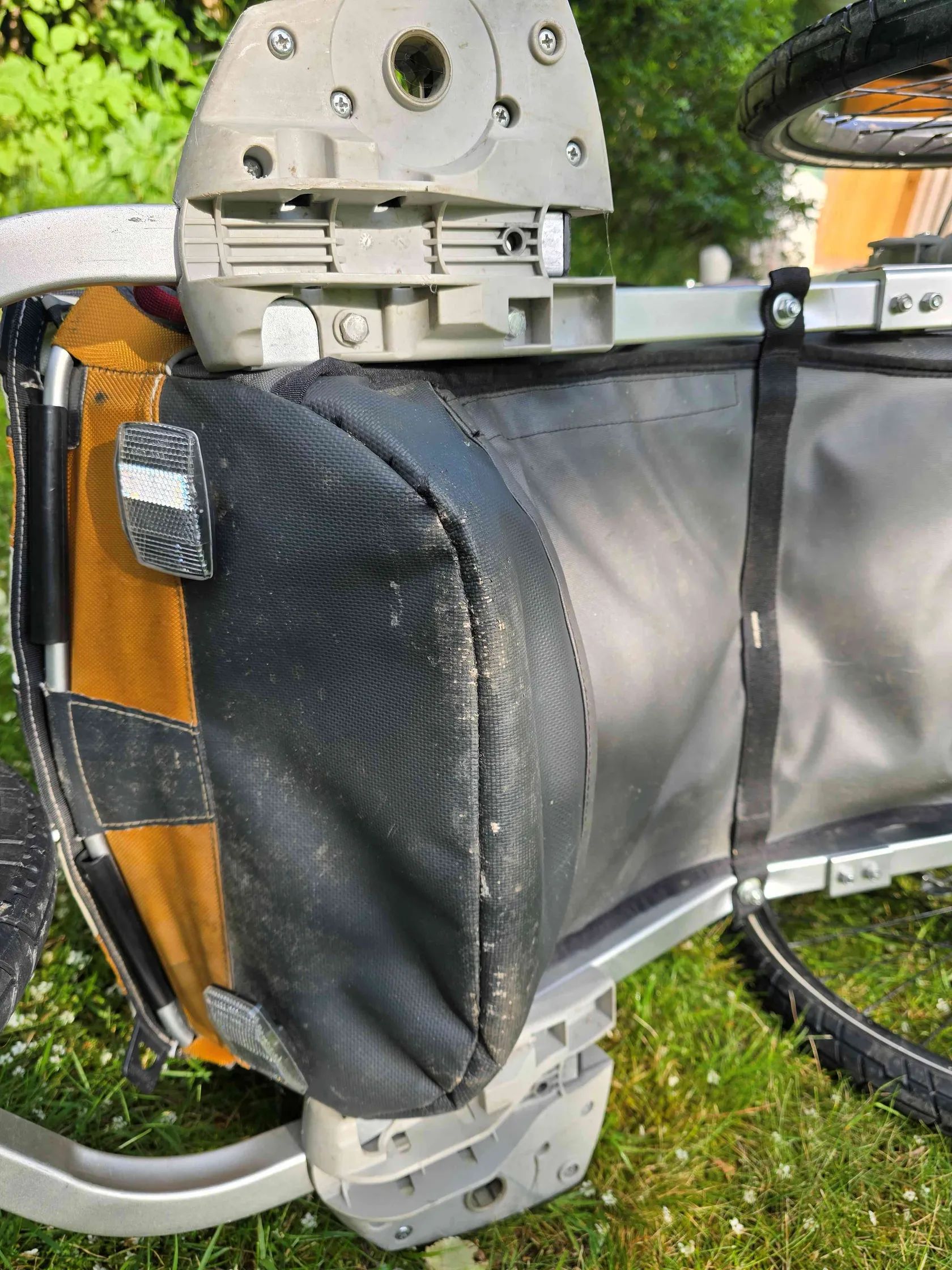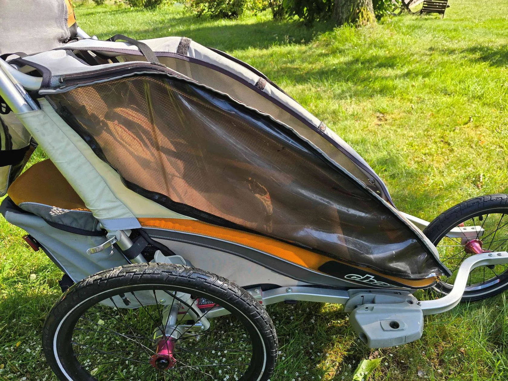 Všestranný sportovní kočárek a vozík Thule Chariot CX 1 ve velmi zachovalém stavu s kompletním vybavením na kolo, běh, lyžování i pohyb po městě a v MHD. Jednomístná verze ve žluto-bílo-šedé kombinaci s bubnovými brzdami, nastavitelné odpružení, ergonomické madlo s brzdovou páčkou přímo na madle s možností aretace jednoduchým stisknutím tlačítka. Velká kapsa na věci vzadu + další prostorné kapsy, případně lze využít i prostor pod sedačkou. Chytrý systém uchycení zrovna nevyužívaného vybavení umožňující pohodlnou výměnu velkého kola za „kočárková“, nandání/sundání tažné tyče na kolo atd. Prodáváme pouze jako celý komplet zahrnující: cyklistický set (tažná tyč + spojka k upevnění na zadní kolo 3x – lze nainstalovat na 3 různá kola v rodině, není třeba pokaždé sundávat, stačí velmi snadno nasadit a jet), pro jízdu po asfaltu lze využít výstražný praporek na tyči, přidáme náhradní duše jogging set (pevné velké přední kolo + vidlice) – pro běh či chůzi ve městě i v terénu, inline bruslení městský/kočárkový set – malá otočná přední kolečka, popruh na přenášení lyžařský/zimní set (kvalitní běžky Sporten + tažný popruh s pohodlným bederním pásem s kapsou na láhev) + mnoho náhradních dílů Thule Baby Supporter (tzv. miminkovník – vložka pro nejmenší děti) – zavěšená postýlka s polstrovanými boky, kterou lze nastavit podle potřeby více do polohy v lehu či sedu, zajišťuje tlumení nárazů, lze doplnit opěrkou hlavy, ideální pro věk cca 6 až 18 měsíců podle velikosti potomka přídavný pylový a prachový filtr Velo Fiala batůžek pro dítě, který lze k vozíku připnout jako doplňkové zavazadlo Vozík je ve velmi dobrém stavu, vše funkční a kompletní, včetně originál návodu k použití. Plastové kryty proti dešti neporušené, všechny zipy v pořádku, pár drobných kosmetických vad odpovídajících aktivnímu užívání – drobné oděrky, ošoupaný spodek, natržená a zašitá boční síťka proti hmyzu – viz foto. K vidění na Praze 4, nutné osobní převzetí, platba v hotovosti při převzetí.