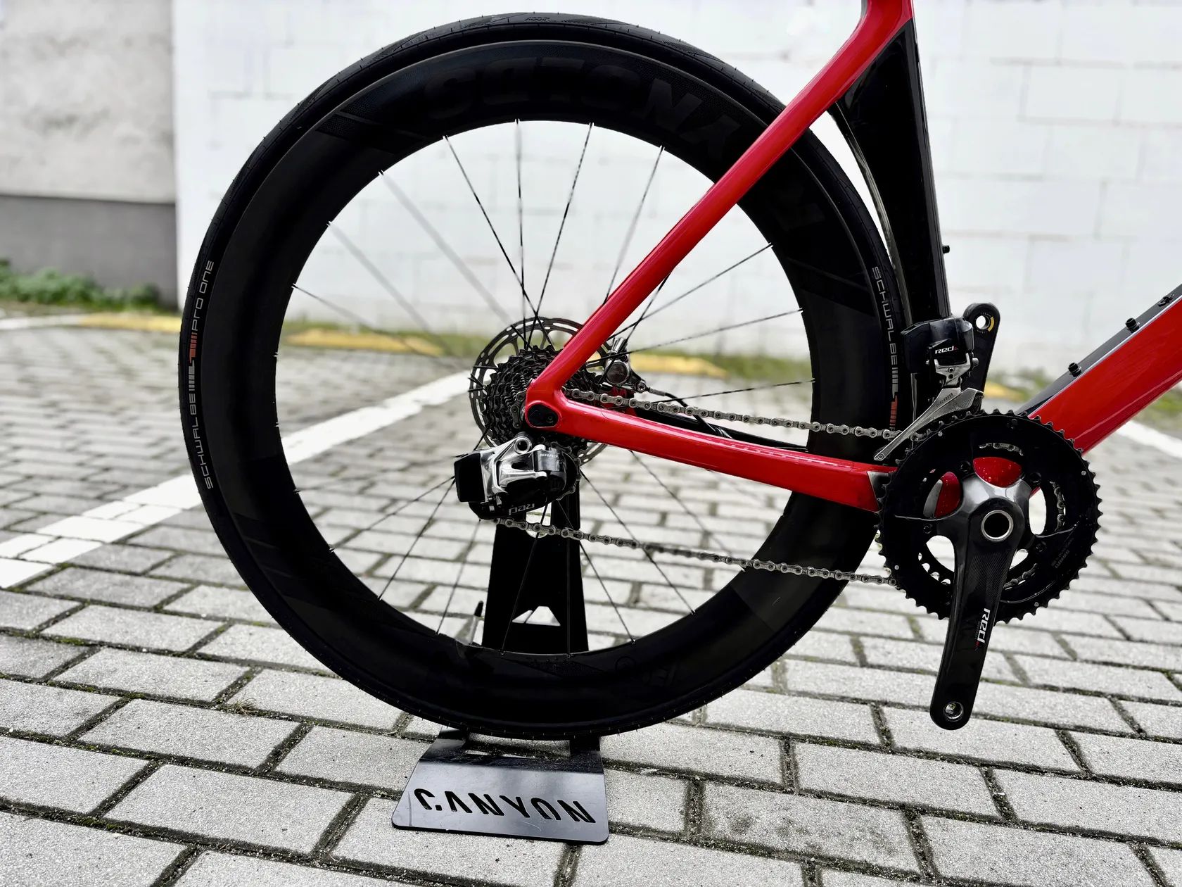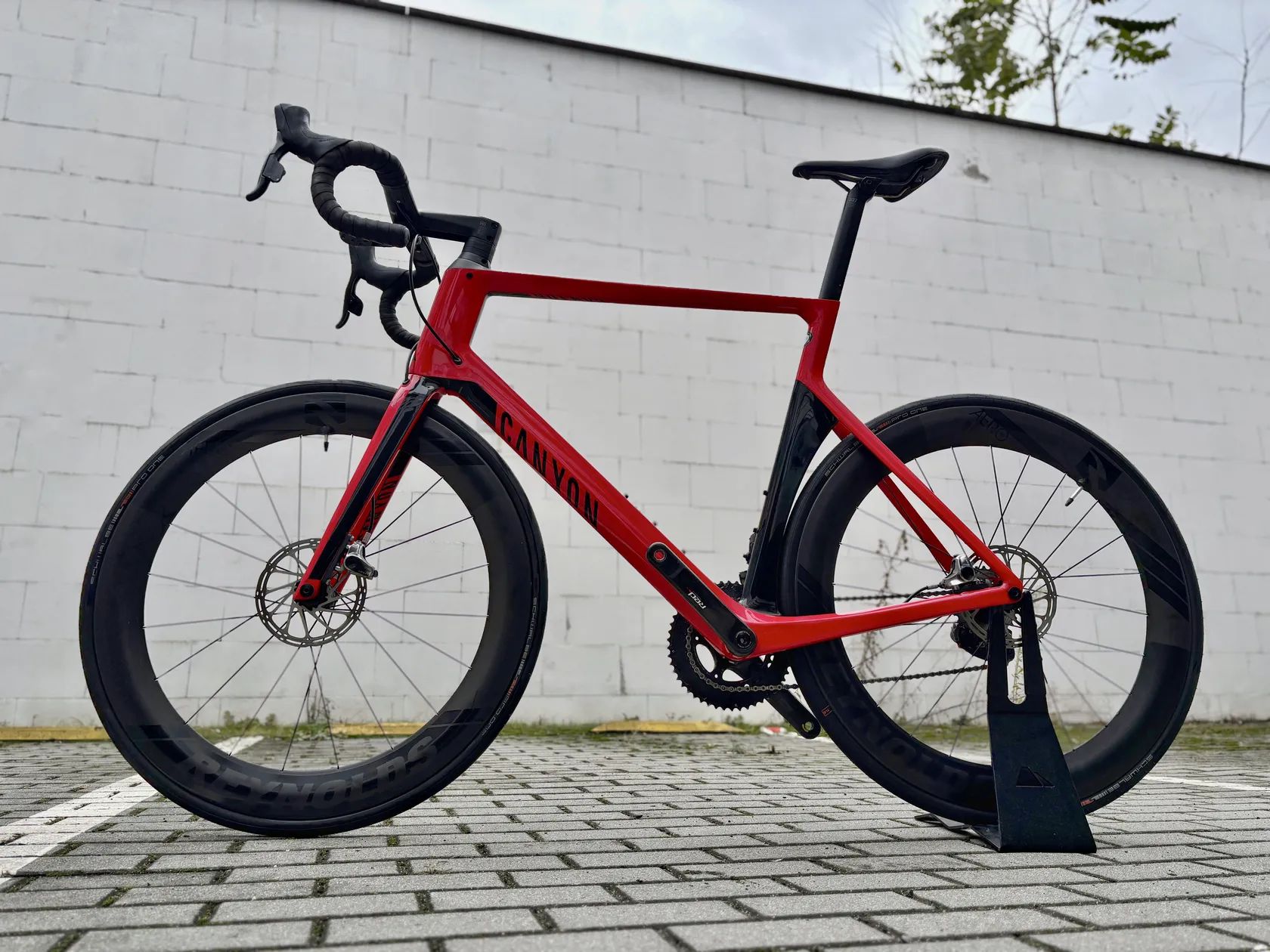 Rám: Canyon Aeroad CF SLX Disc 9.0 LTD (karbon), velikost XXL – ideální pro jezdce od cca 195 cm Přehazování: SRAM Red eTap 2x11 – bezdrátové elektronické řazení, přesné a spolehlivé Kola: Reynolds Black Label 65 Carbon s Industry Nine náboji – velmi tuhá, lehká a rychlá Pláště: Schwalbe Pro One, 28 mm – pohodlné a odolné proti defektům Kliky: SRAM Red Carbon – ultra lehké a tuhé Stav: