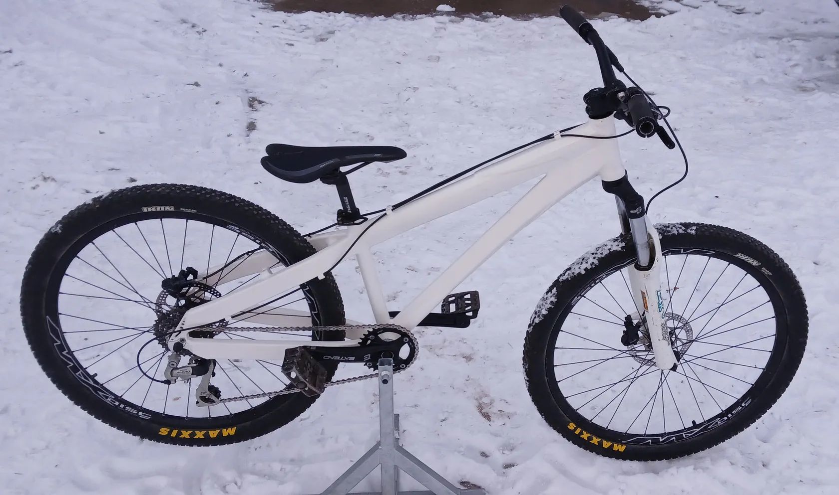 Prodám kolo postavené z kombinace nových/použitých dílů. Seřízené, nachystané na ježdění. Dirtový rám nový komaxit - bílý, TT 55cm. Velikost na dirty tak do 170cm jezdce. Na využití jako dětské kolo cca 135-155cm výšky jezdce. Vidlice RST Dirt 100mm pružina Ráfky Mach1 Naboje Shimano Deore Pneu Maxxis Ikon Kliky Extend, nové, dutá osa, nový řetěz Řidítka Specialized Přehazovačka Shimano Alivio 1x8, nový řetěz 8sp. Brzdy hydraulické SRAM Level TL, kotouče 160mm