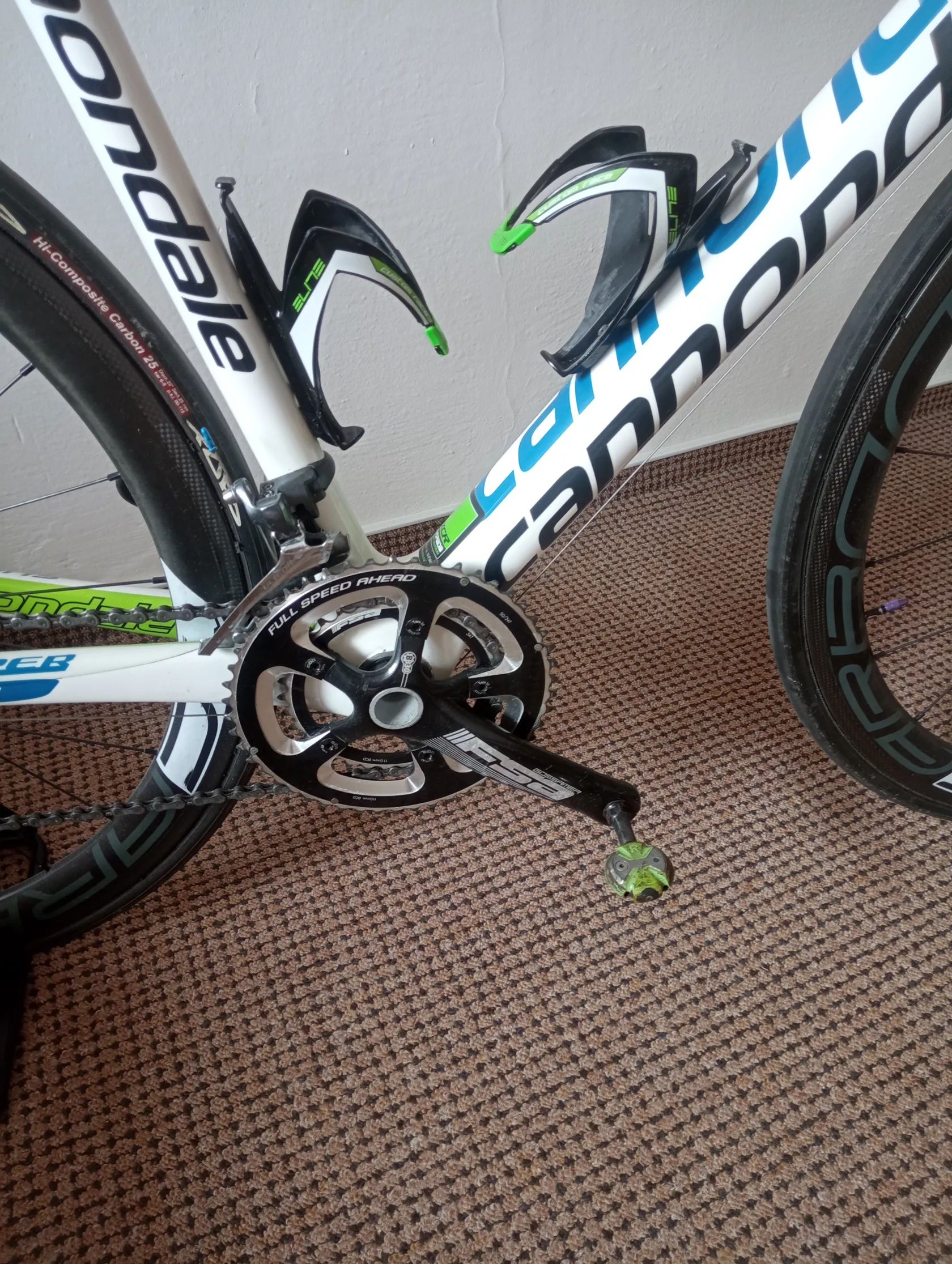 Prodám celokarbonove silniční kolo Cannondale Supersix, vel. 56. Řazení, brzdy Shimano 105, 2x10, kliky a převodníky FSA 34-50. Zapletená karbonová kola Tufo, galusky Tufo. Karbonová sedlovka a představec FSA. Sedlo Prologo. Pedály Speedplay + tretry Sidi Wire carbon vel. 44. Ke kolu nechám i cyklocomputer Garmin Edge 530. Náhradní al kola Shimano, plášťová i s kazetou, 1x nová galuska Tufo a nový řetěz. Kolo v dobrém stavu pravidelně servisováno.