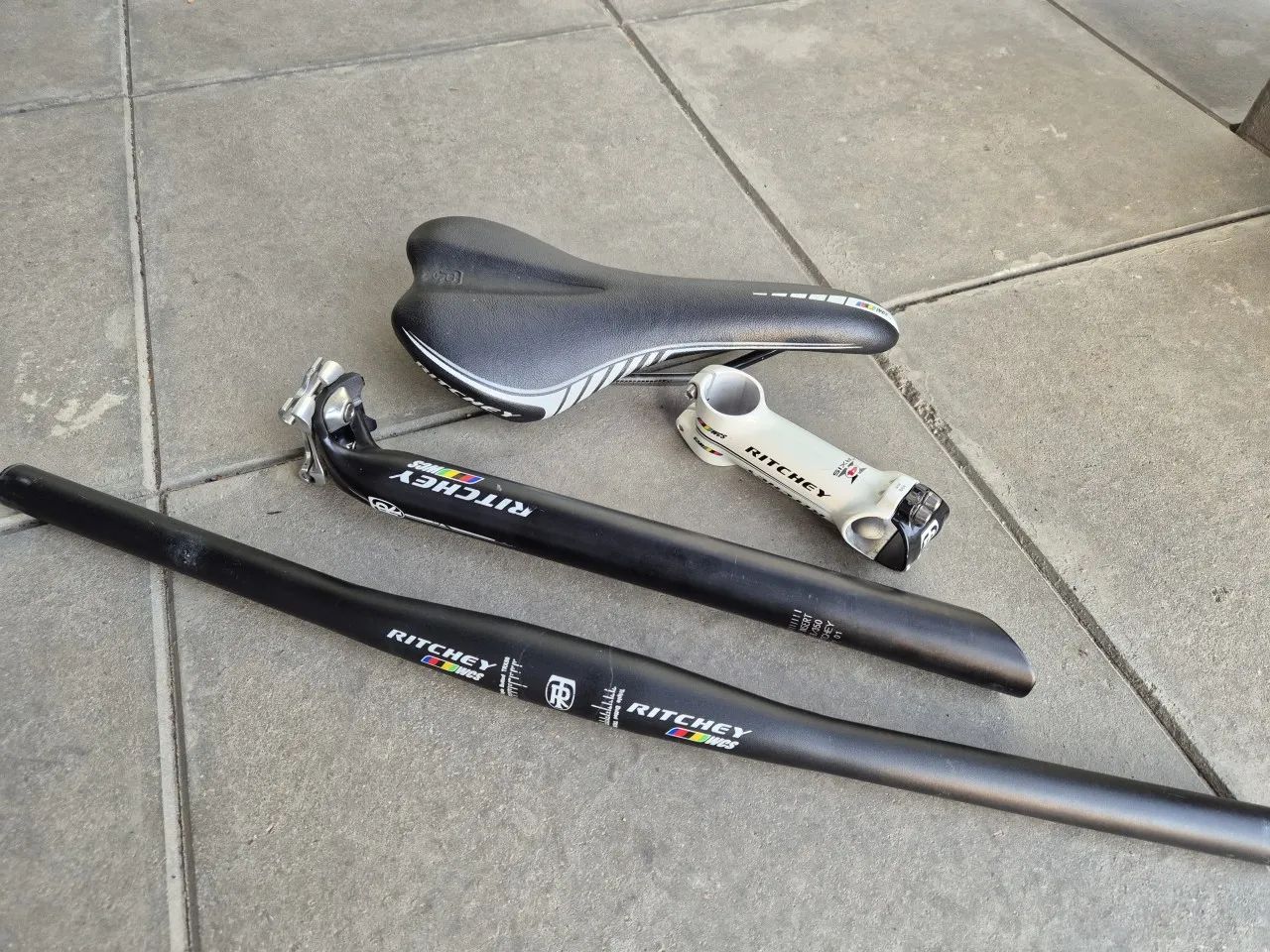 Lehká sada řidítka, představec, sedlovka a sedlo Ritchey WCS. Řidítka 31.8x580mm triple butted, představec 4axis 100mm, 6st, sedlovka 31.6x350mm, ofset 20mm, sedlo Contrail s Vector Wing a titanovými ližinami. Vše krásný stav, minimální oděrky. Řidítka+sedlovka+představec za 950Kč, sedlo za 500Kč, vše dohromady za 1300Kč. Osobně v Brně-Líšni nebo zásilkovna za +90Kč