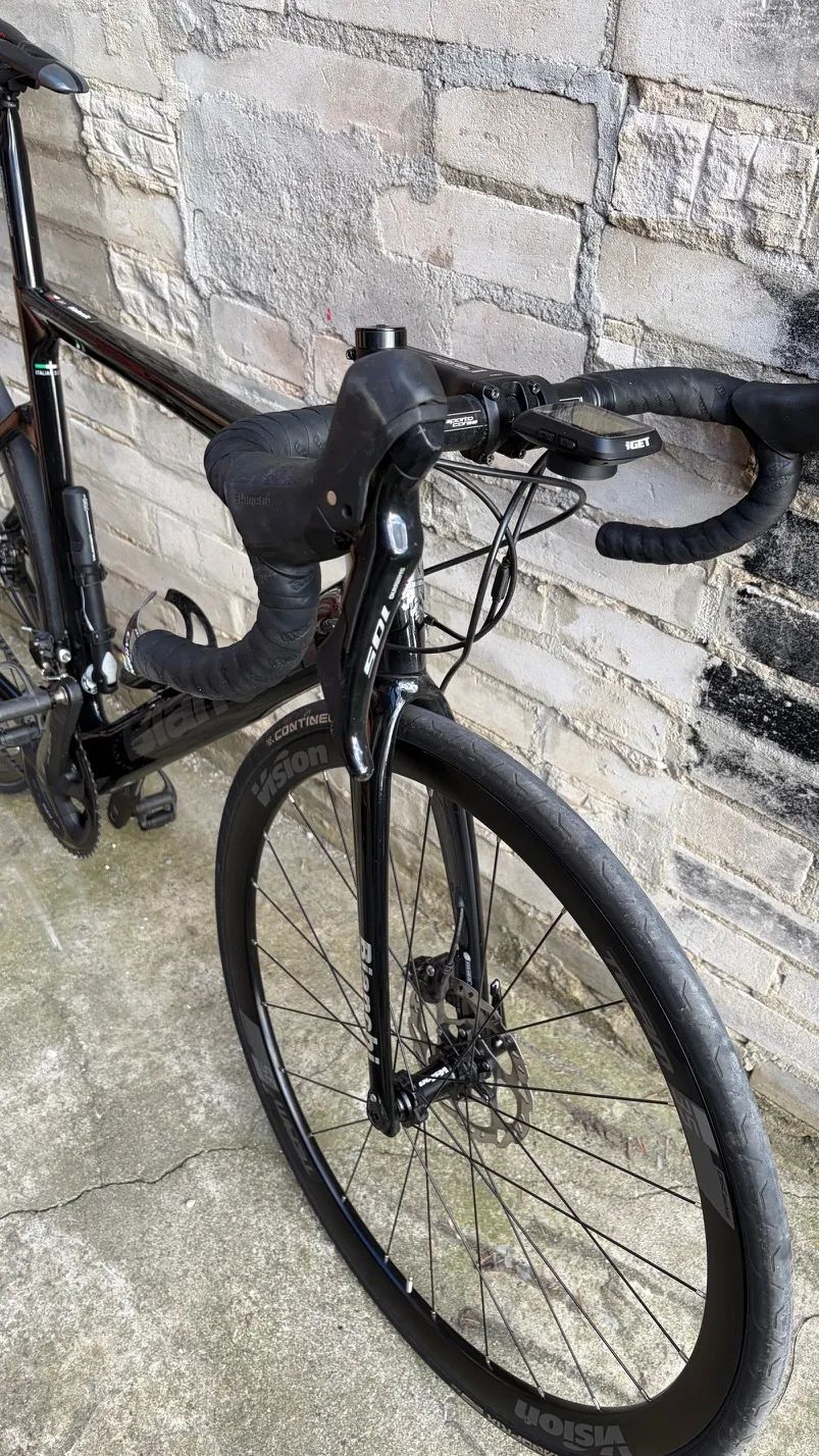 Bianchi Aria velikost rámu 53‘ cca 165 – 180cm, nastaveno na výšku 172cm. Výbava Shimano 105 Kola Vision Team 35, disc brake, alu Pláště Continental. Kolo je v top stavu, bez oděrek, nová kazeta, řetěz a presfit. V dešti nejeto. Pro více informací volejte, preferuji osobní odběr.
