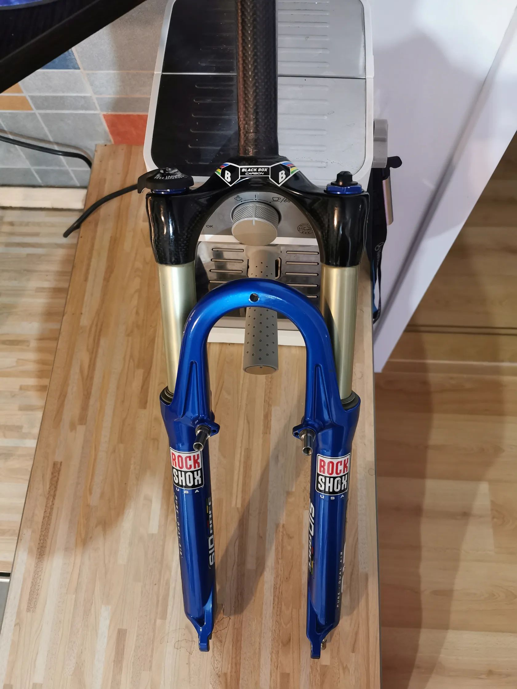 Rockshox Sid Race Carbon Blackbox .......................... electric blue / dual air / lockout carbon blackbox korunka a sloupek zachovala vizualne bez vyraznejsich skrabancu.....viz photo vidlice je funkci....lockout funguje.....vzduch drzi bez problemu vidlice z neuskutecnene stavby.....vhodna na projekt Klein / Rocky Mountain / Scott / etc vice info do zprav