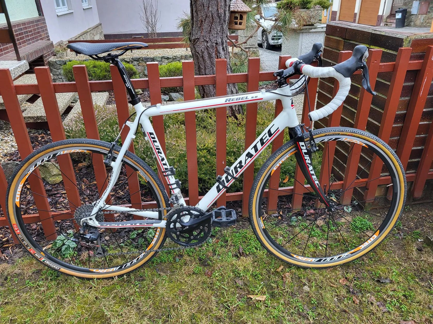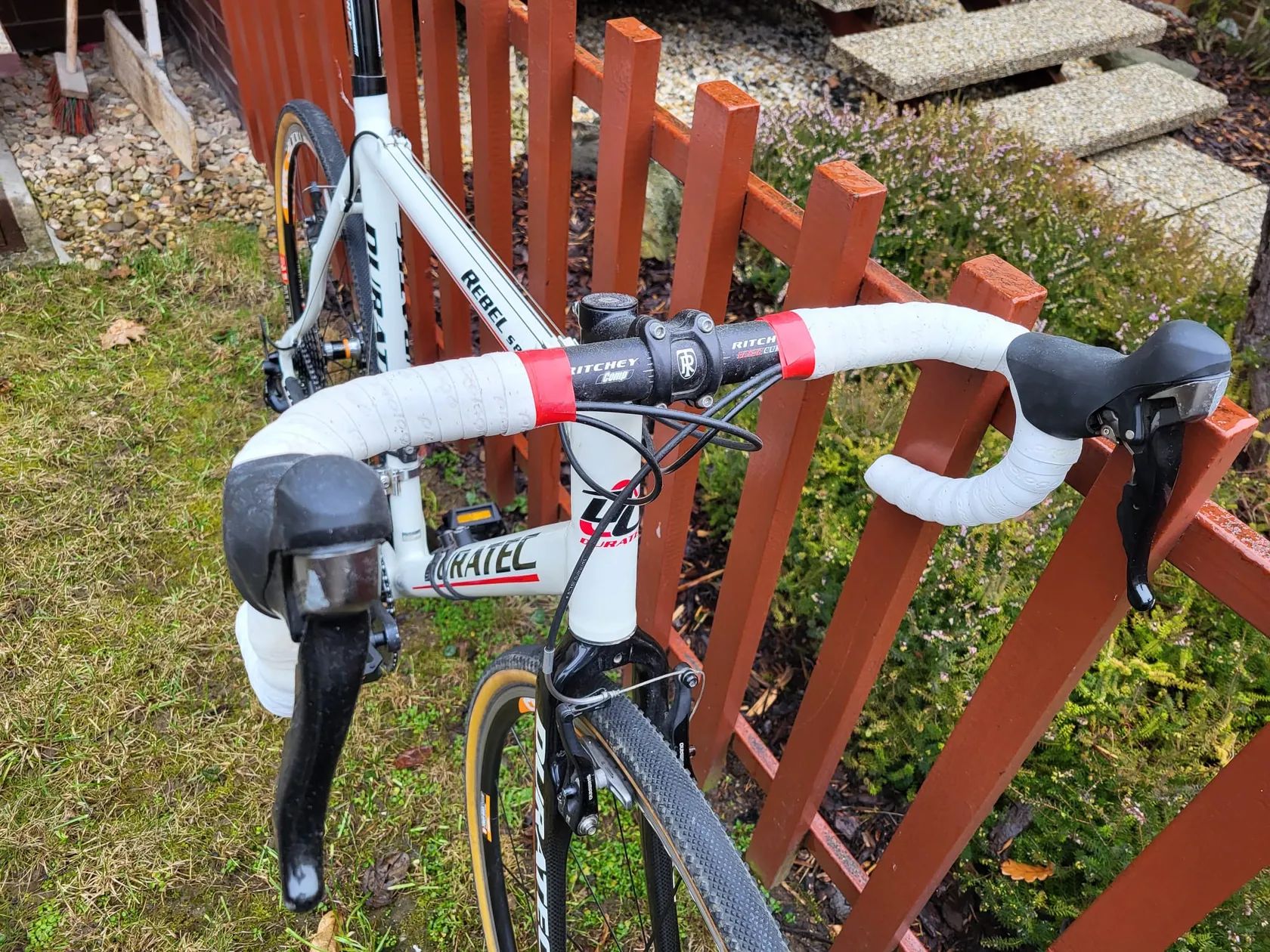 Prodám cyklokrosové/gravel kolo Duratec Rebel, sada Shimano 105 (2×10), hliníková kola Citec 3000 Aero (DT Swiss), pláště Challenge Dune pro (33mm), karbonová vidlice, hliníkové komponenty Ritchey, nové plastové pedály. Návarky na celoblatníky a brzdy cantilever. Běžné oděrky a oprýskání laku. Kolo vhodné na cyclokros/gravel/silniční zimák.