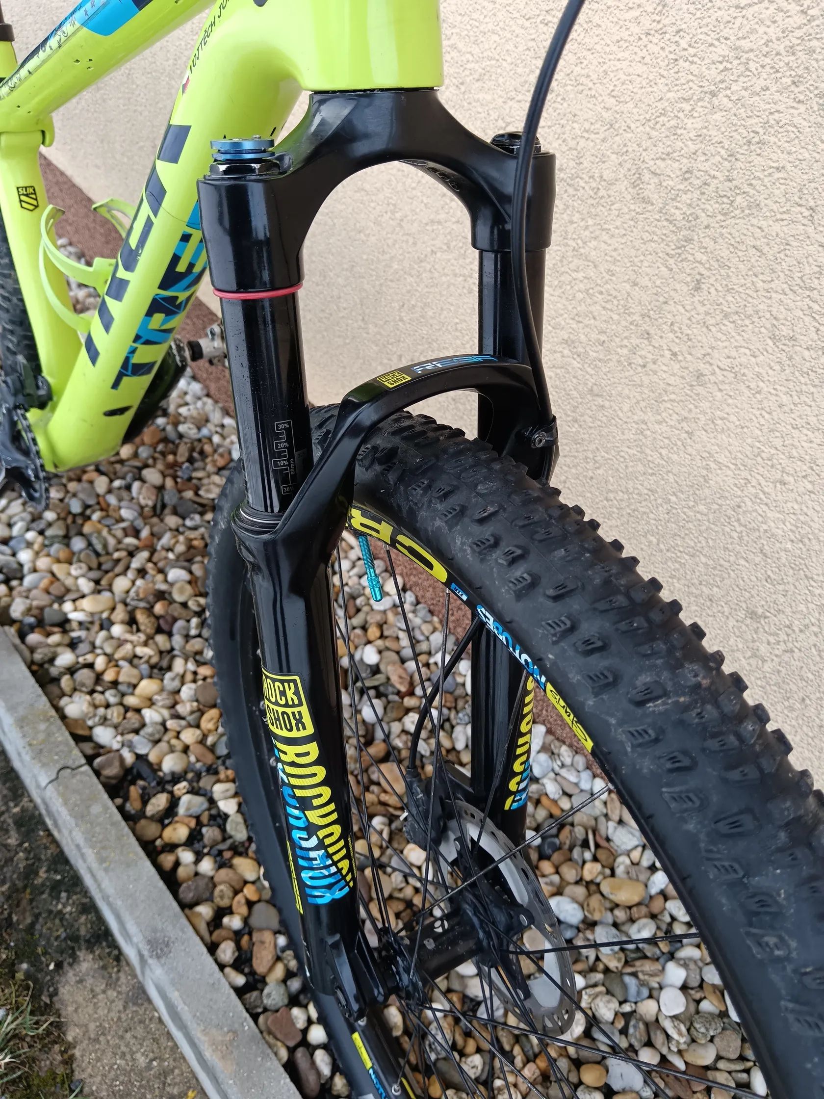 Vidlice RockShox – kvalitní XC vidlice, aktuálně bez ovládání zámku z řídítek (páčka je k dispozici jako díl navíc)