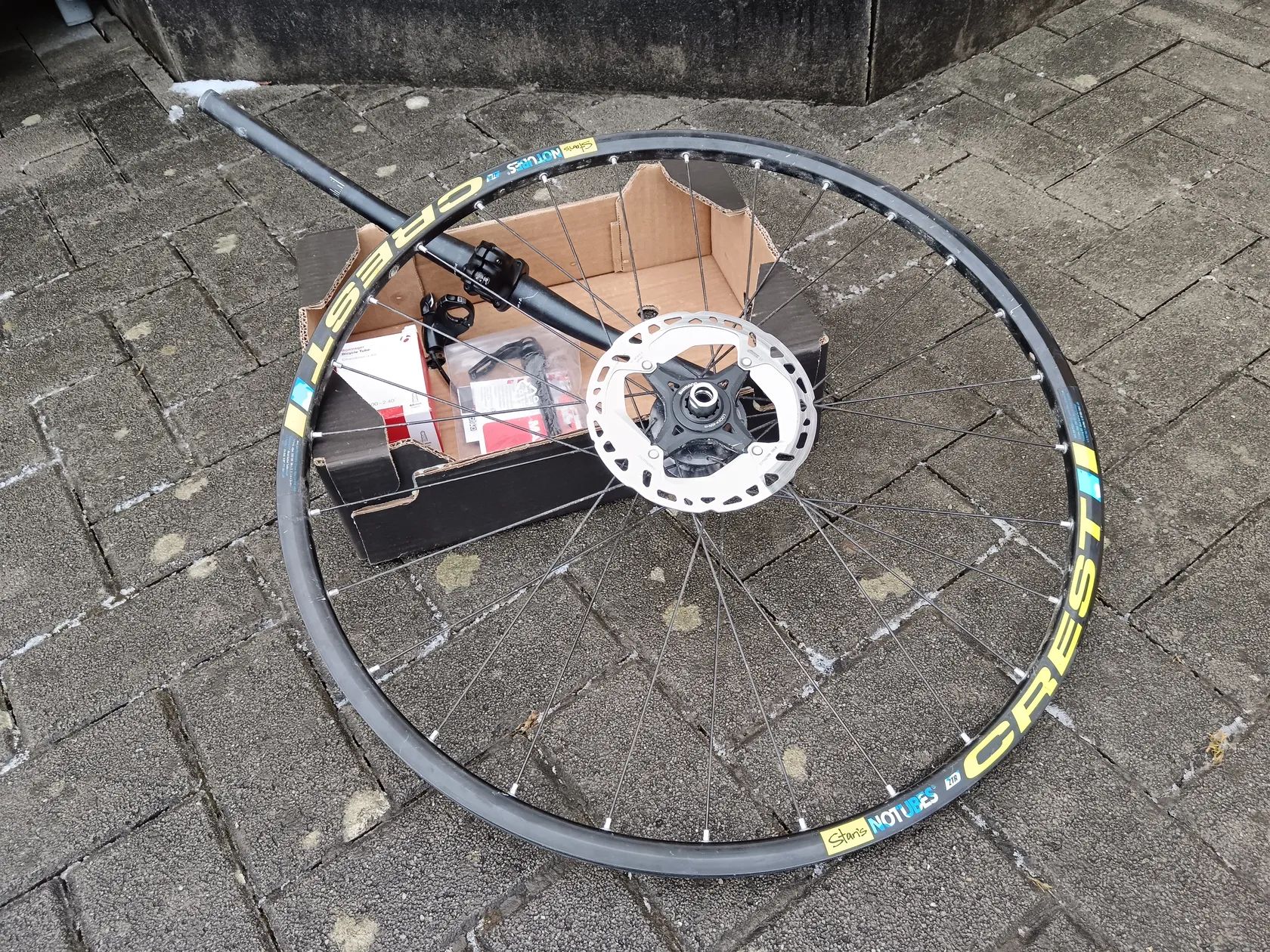 Součástí jsou náhradní díly: zadní kolo, osa, duše, páčka zámku vidlice