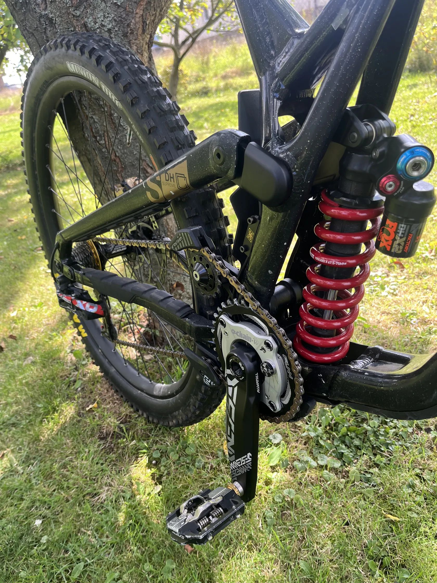 Bike jazdeny 2 sezonny. Dovod predaja nedostatok času popri vysokej škole v zahraničí. Komponenty: Rám: commencal supreme v5 2024 L Vidlica: ohlins dh 38 ( mám k nej aj červené polepy Tlmič: fox dhx 2 factory 600lbs pružina, mám k nemu aj 550 lbs fox čiernu Brzdy: shigura: deore xt páčky, mt 7 pro strmene Vpredu aj vzadu e-bike platne vpredu magura vzadu galfer Kotuce: galfer 223mm predu wawe vzadu shark Radenie: sram X0 Dh 7 speed ( novy bowden + lanko) Prehadzovaxka: sram XO 7 speed Predstavec: renthal integra 35 mm Rajdy: pro tharsis carbon 800 mm Hlavko: cane creek forty Stredove: sram dub Kluky: sram descendant + 0 chain Gripy: odi Predne koleso: newmen ( kupovane od jazdca co ho mal stavane na svetak ale nevyuzil ho model naboja netusim) - nova bezdusova paska stans - novy insert rival - novy plast pirelly scorpion dh race M Zadne koleso: mavic deemax bikepark - kazeta sram gx 7 speed -nova bezdusova paska stans - insert tannus - novy plast magic marry soft super gravity Sedlovka: ride alpha Sedlo: fizik