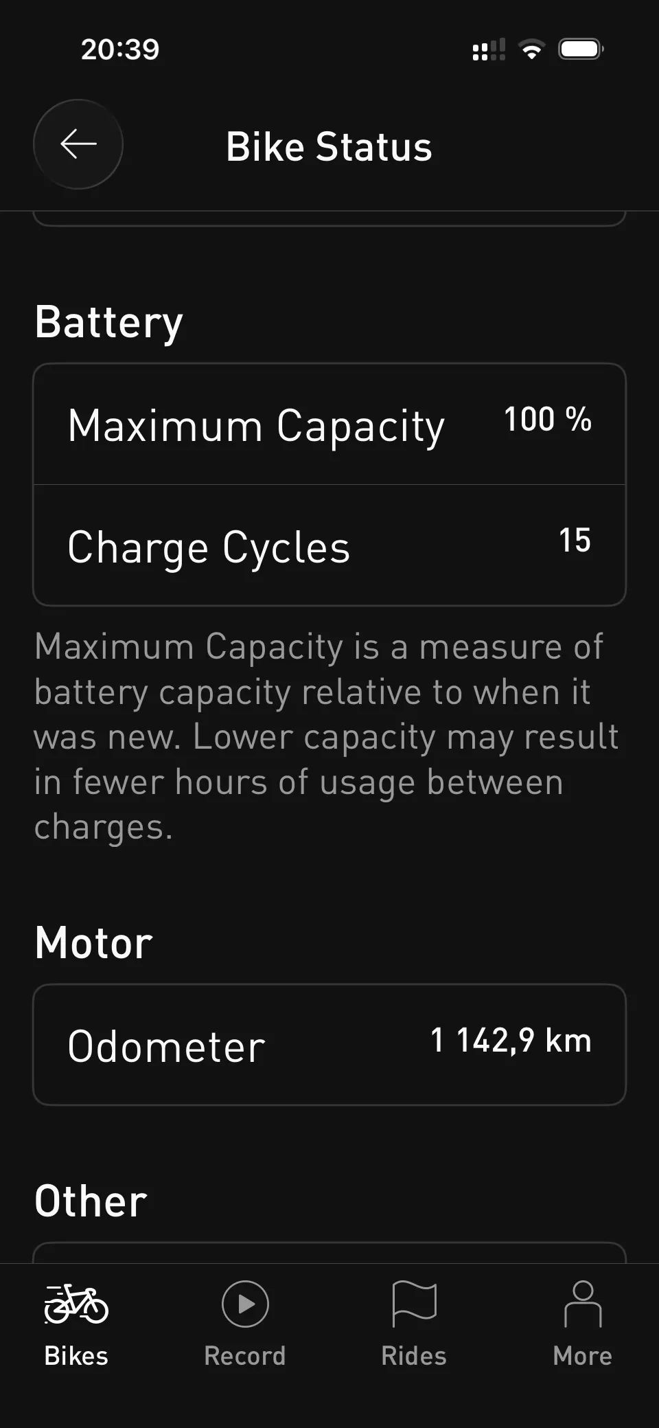 - Stav: lehce jeté (cca 1 143 km, 15 cyklů nabíjení, baterie deklarována jako 100 %).