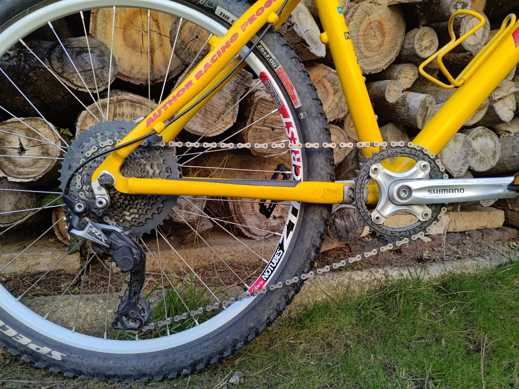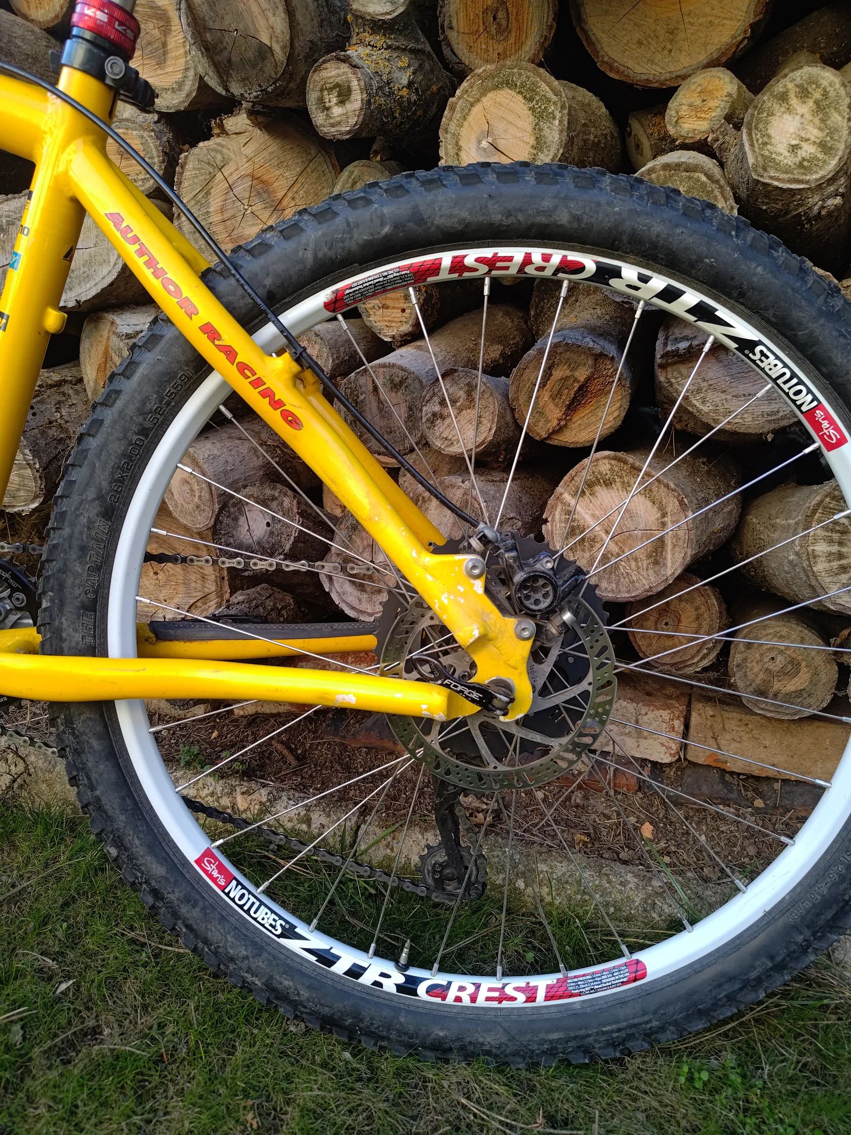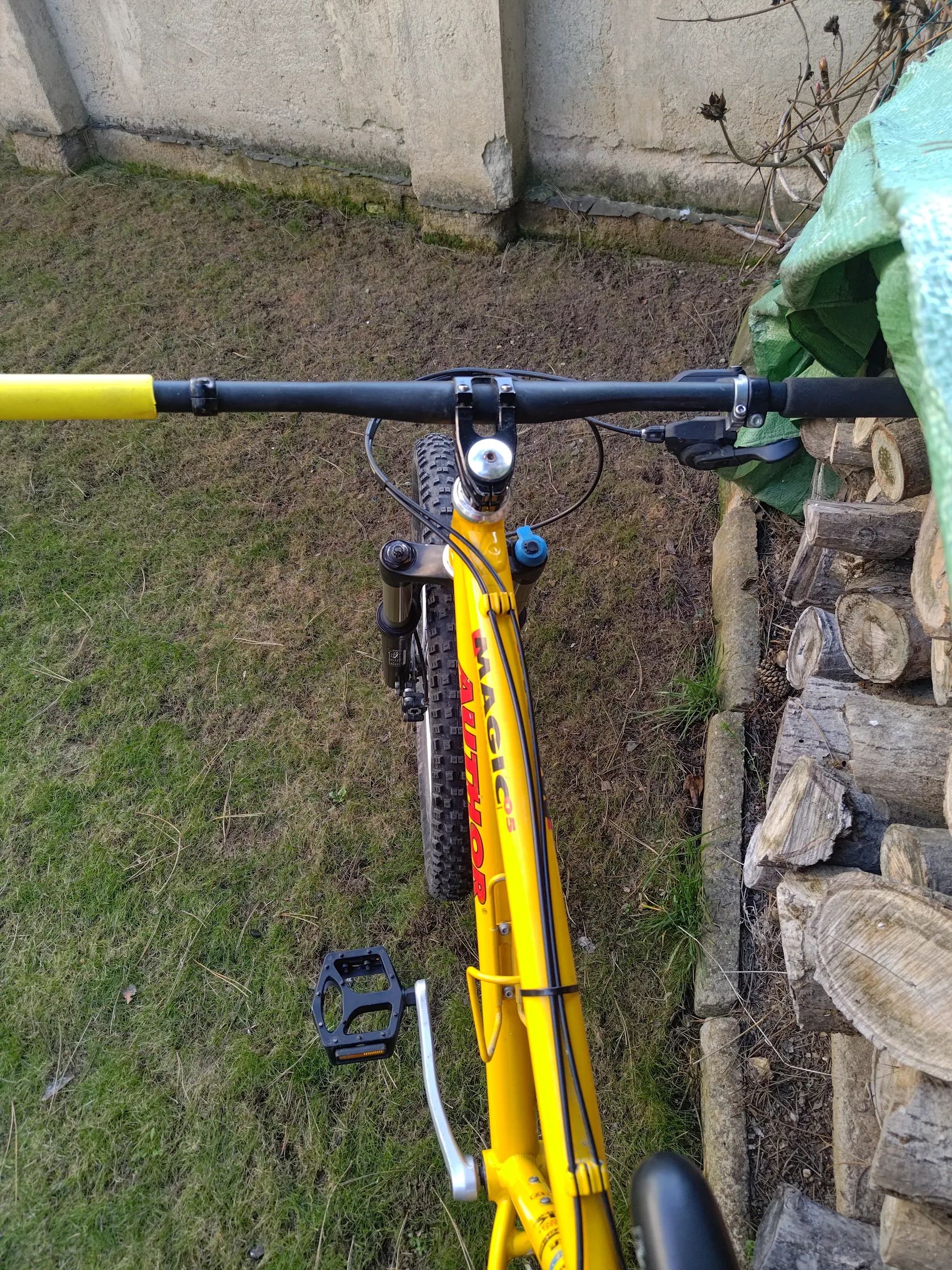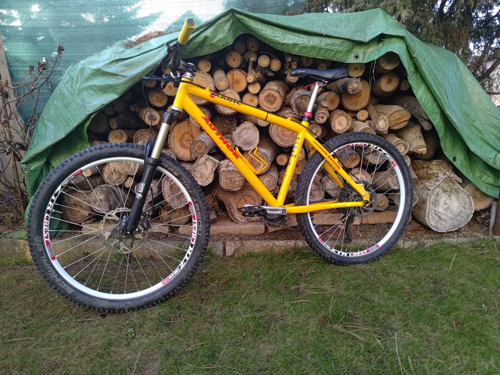 Horské kolo postavené na historickém závodním rámu velikosti M a novodobých komponentech. Vše seřízené, odservisované a funkční. Vzduchová vidlice: Rockshox Recon 335, stavitelných 100-130mm, po repasi.