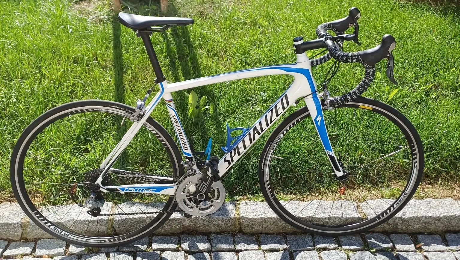 Karbonové silniční kolo Specialized Tarmac SL6 velikosti 54 – nastaveno na cca 173 cm.