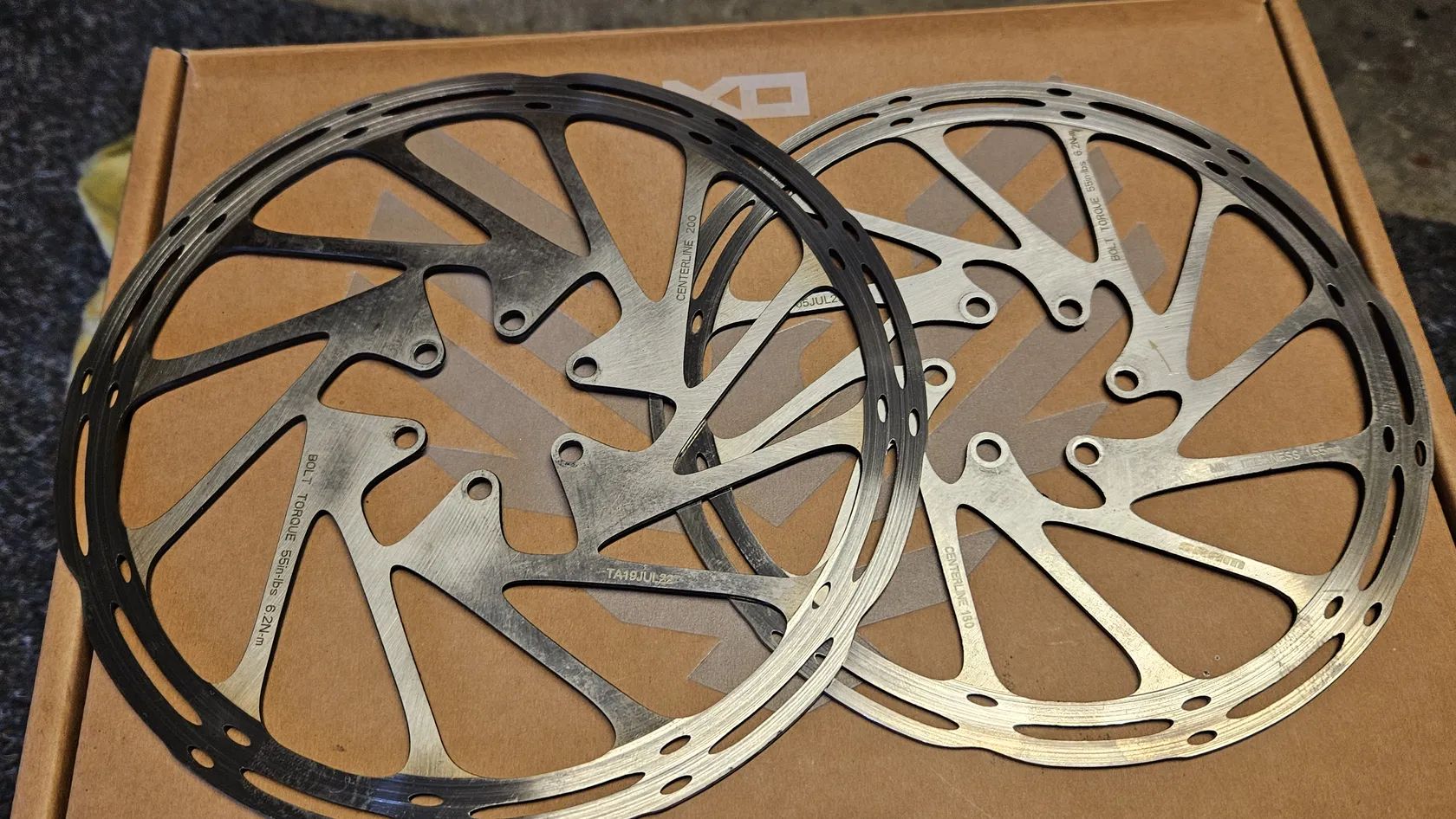 Prodám Sram Centerline kotouče 200/180mm, najeto do 500km, bez poškození, přechod na Shi-XT.
