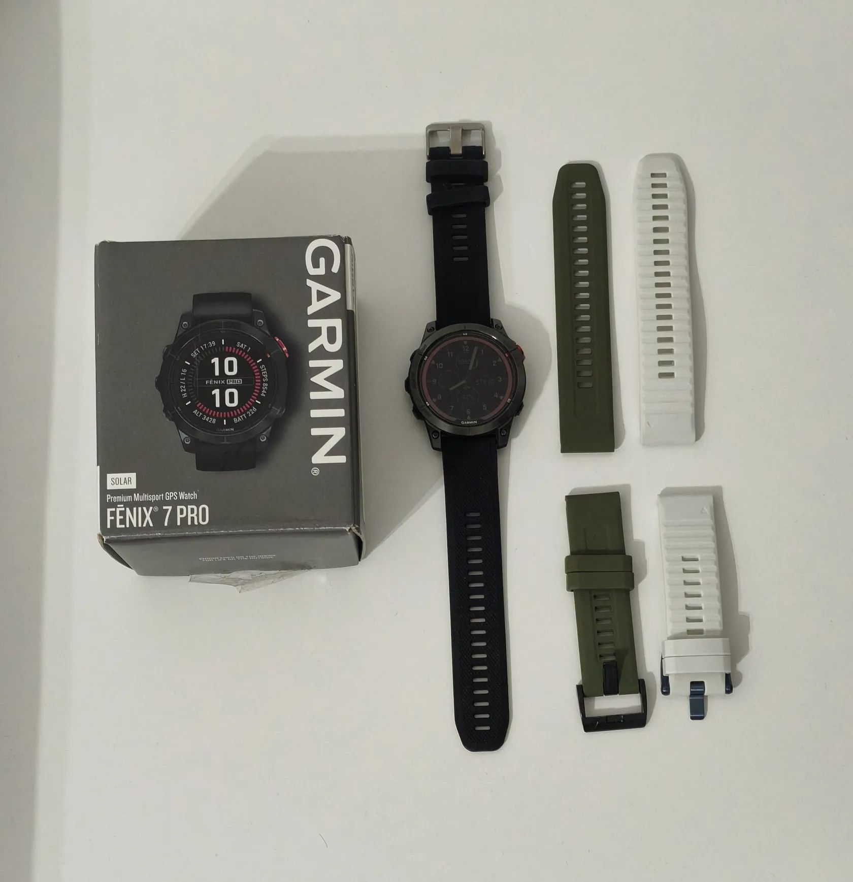 Ponúkam na predaj hodinky Garmin Fenix 7 Pro Solar. Na displeji je od novoty nalepená ochranná fólia, na to upozorňujem. Luneta vo výbornom stave. Dokopy 3 náhradné remienky, biely originálny. S kompletným balením a dokladom o kúpe. Záruka bola do 03.02.2026