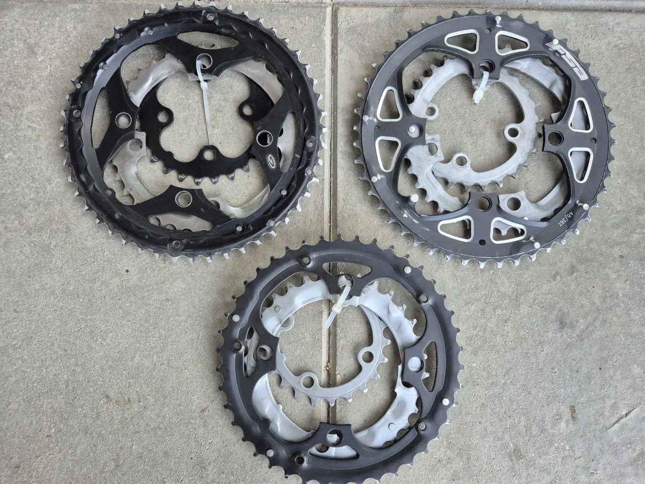 Sady trojpřevodníků standard BCD 104/64. Dole 22/32/42, nahoře trekové 26/36/48 (možno použít i na dvojpřevodník 26/36). Cena 150Kč za sadu, při odběru více sad možná sleva. Osobně v Brně-Líšni nebo zásilkovna za +90Kč
