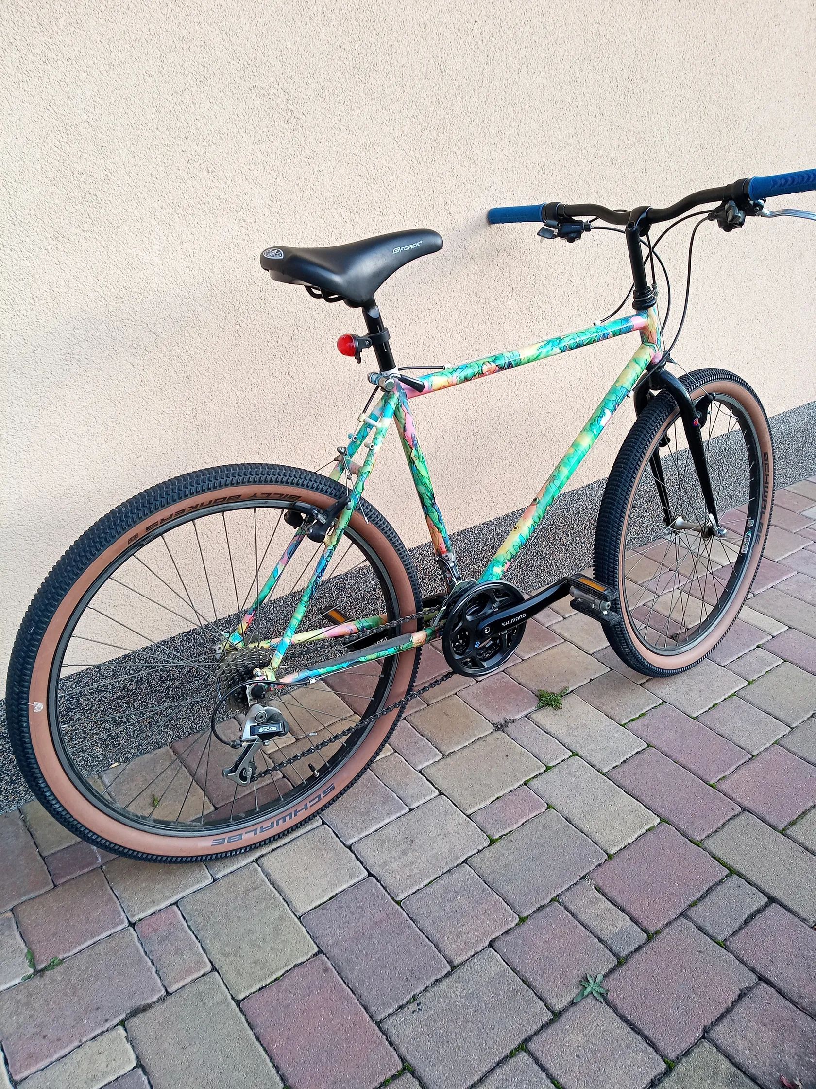 Zrekonstruované plně funkční kolo s pevným ocelovým a unikátně pestrobarevným rámem. Nové řídítka,gripy, pláště,brzdové špalky, pastorek sedmi ozub ,řetěz, středový troj tác a kliky. Původní funkční Shimano převody 3x7. To je parádní kombinace na pohodlnou jízdu do města. Více fotografií na bazoši.